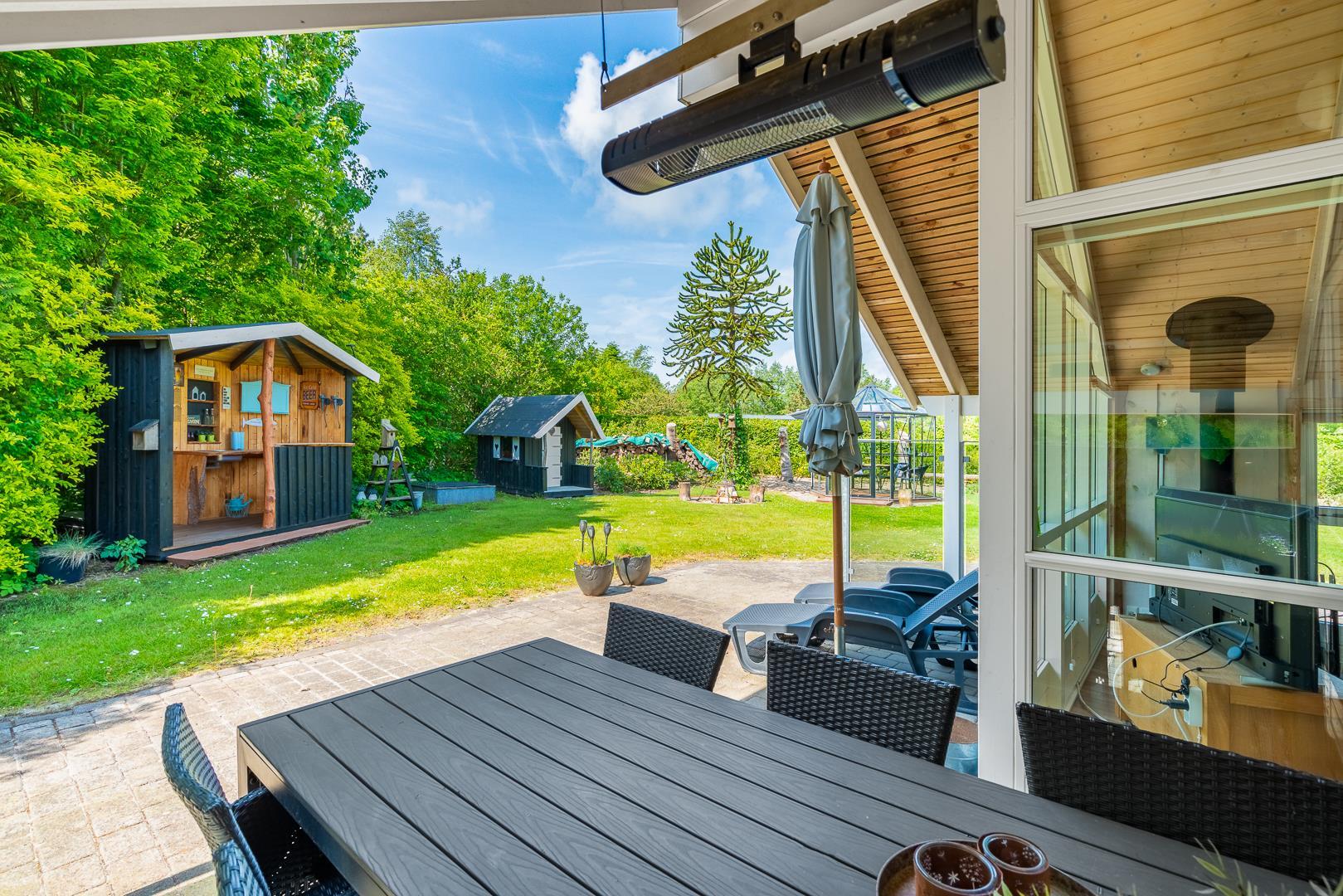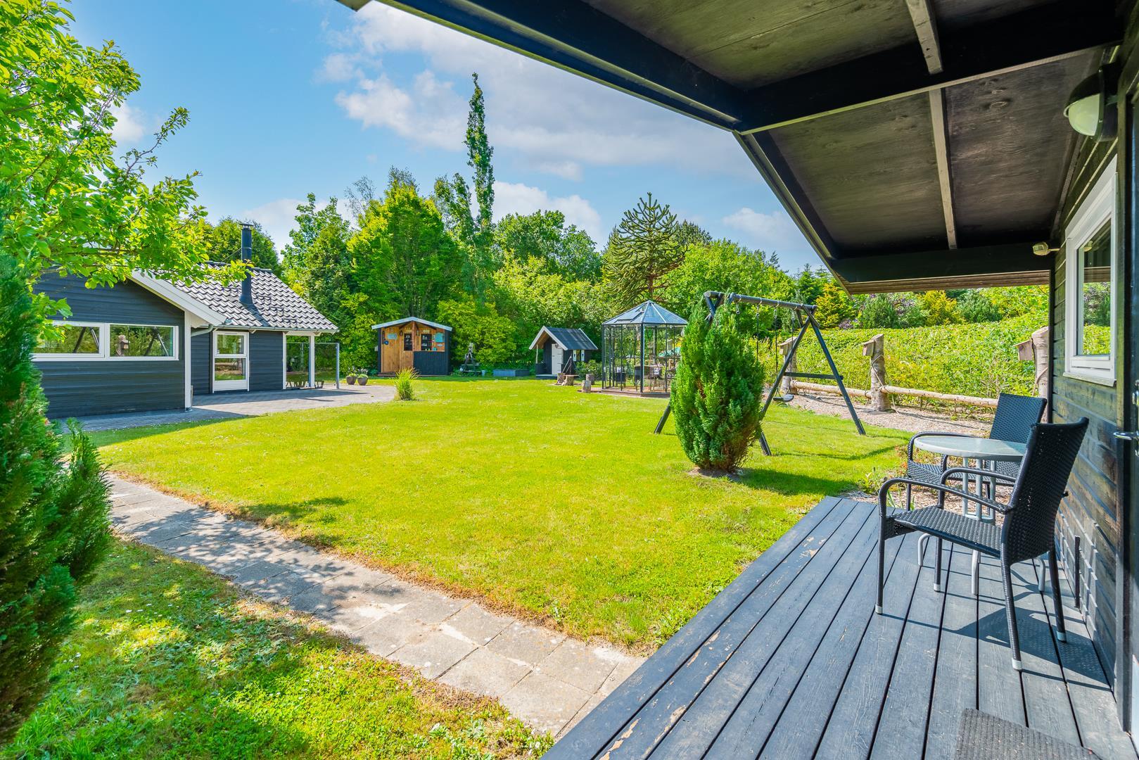 Udendørs venter en rummelig naturgrund med plads til leg og afslapning. Børnene kan boltre sig på gyngen og i sandkassen, mens de voksne nyder freden på den overdækkede terrasse.