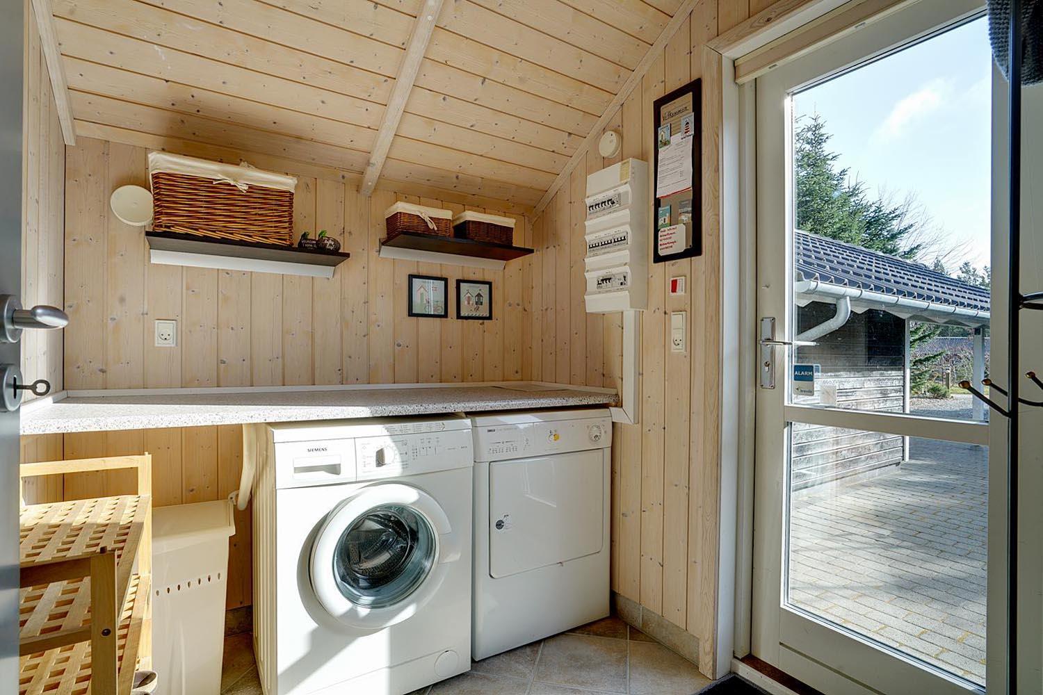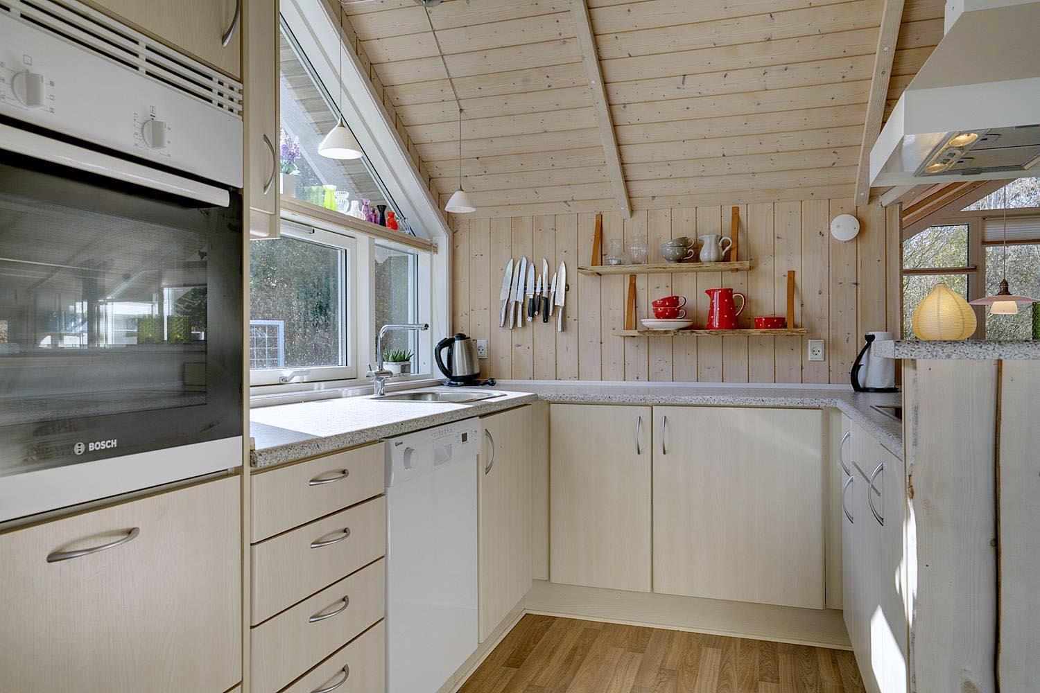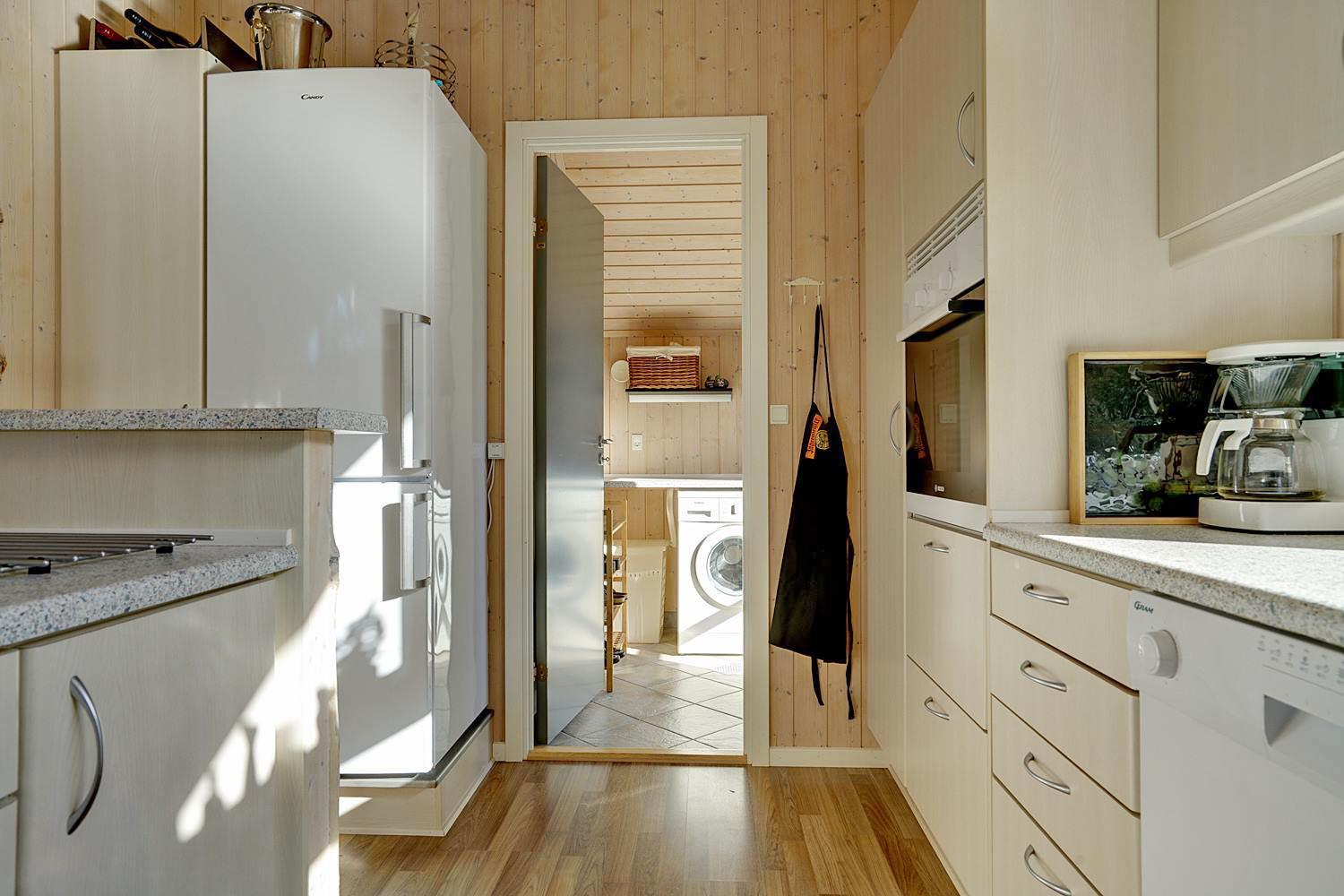 Det åbne køkken ligger i direkte forbindelse med stuen og gør det nemt at være sammen – også når der laves mad. Her finder I opvaskemaskine, og huset er desuden udstyret med både vaskemaskine og tørretumbler, så praktikken klares nemt.