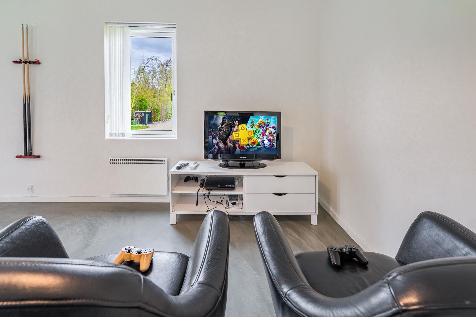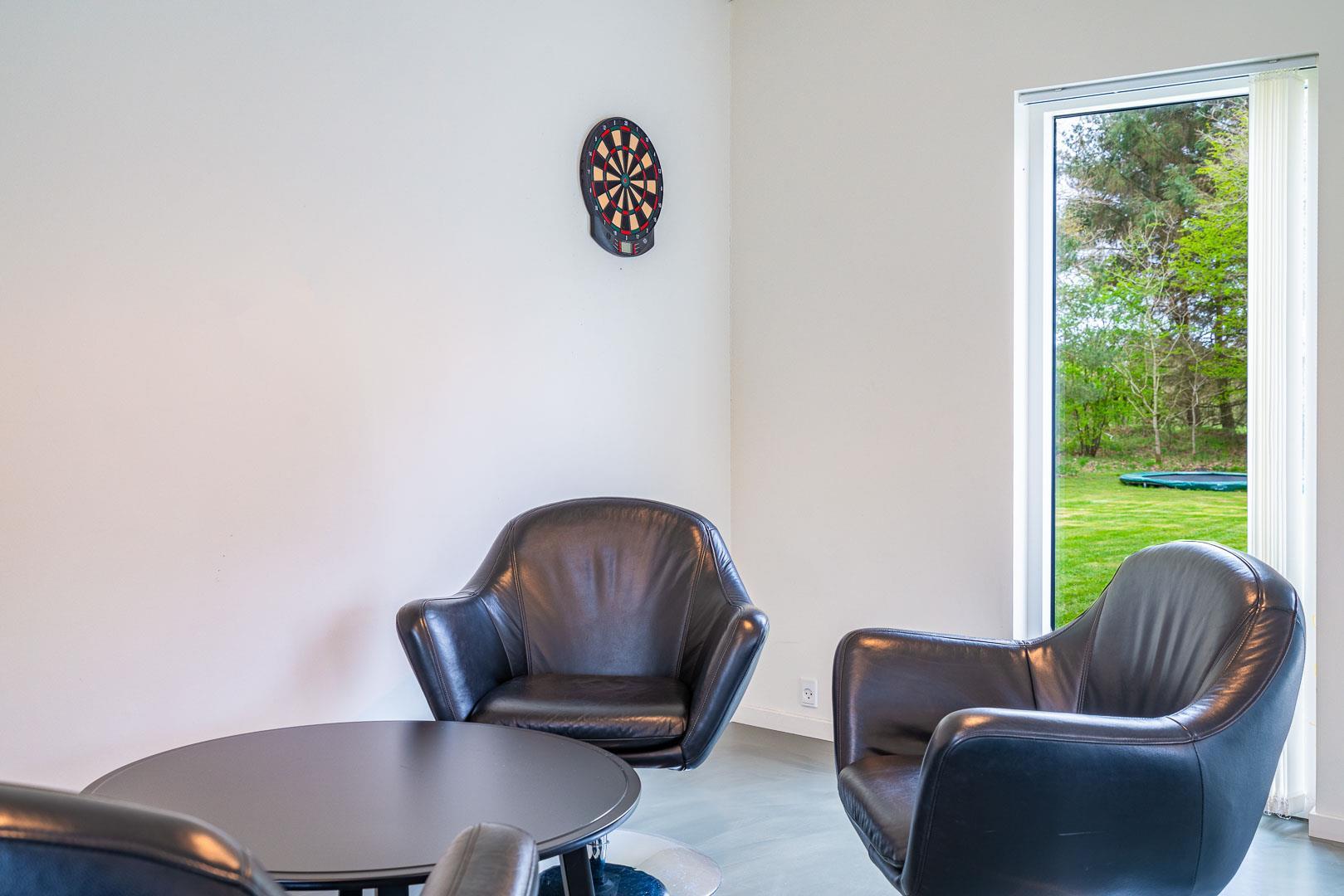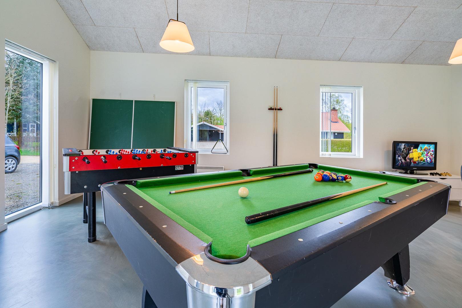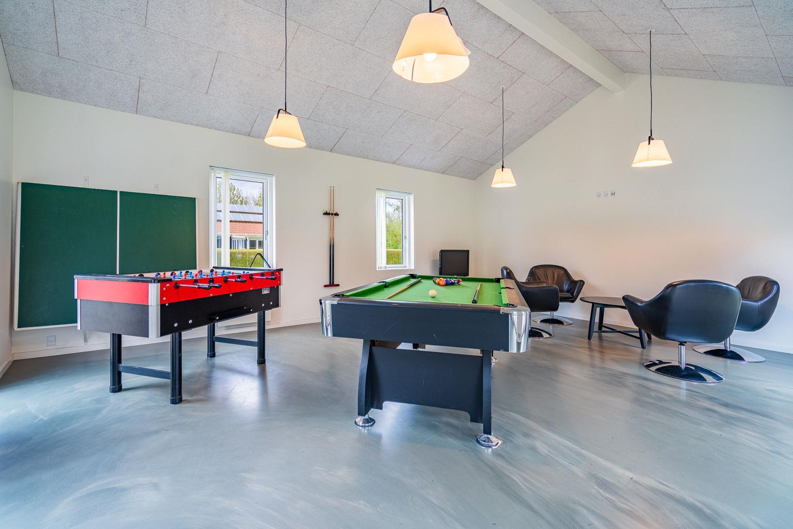 Sommerhusets aktivitetsrum sørger for underholdning til både børn og voksne – her kan I spille billard, bordfodbold, bordtennis eller prøve kræfter med dart. Der er også en spillekonsol til regnvejrsdage.