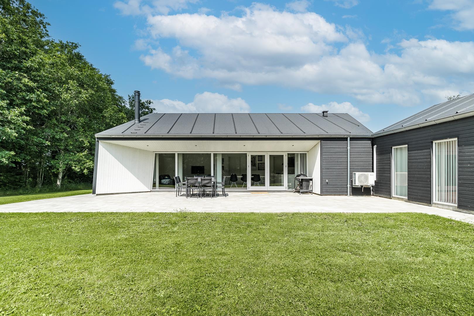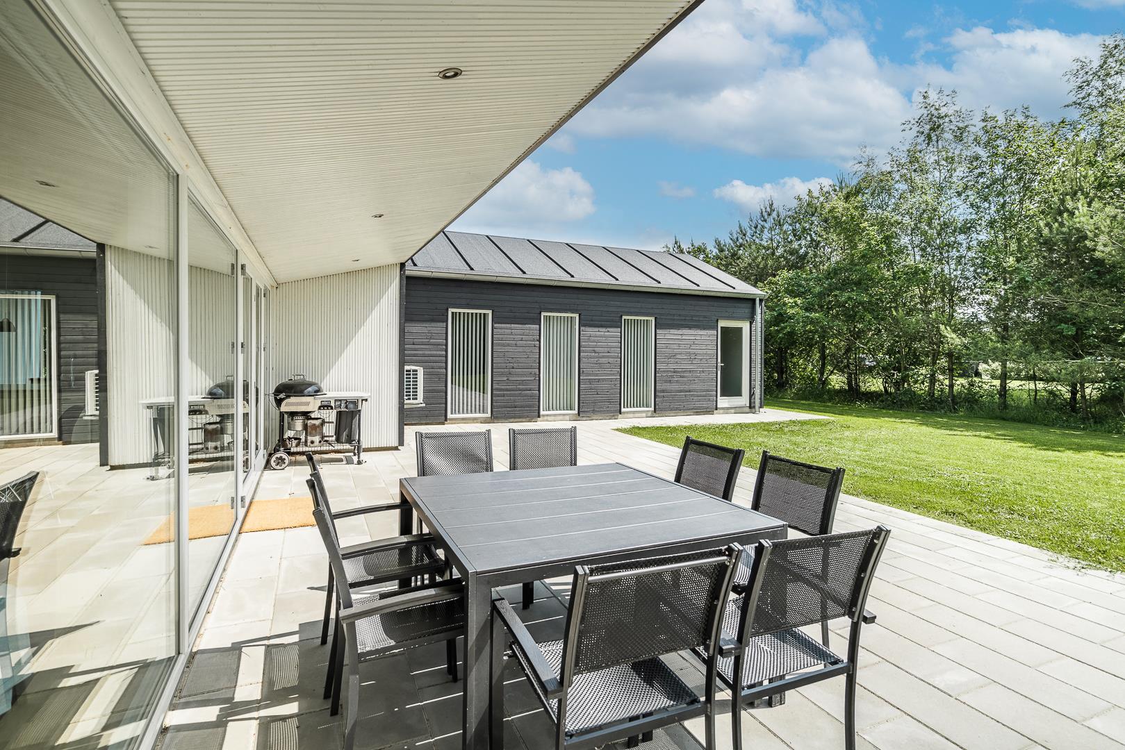 Udenfor venter et sandt ferieparadis: Den overdækkede terrasse giver jer mulighed for at nyde morgenkaffen, grille eller bare slappe af i frisk luft – uanset vejret. Børnene kan boltre sig på gyngen, i sandkassen eller på trampolinen, mens de voksne nyder roen.