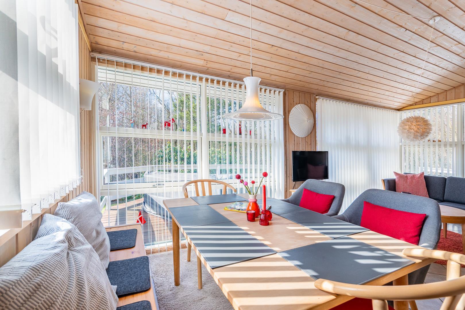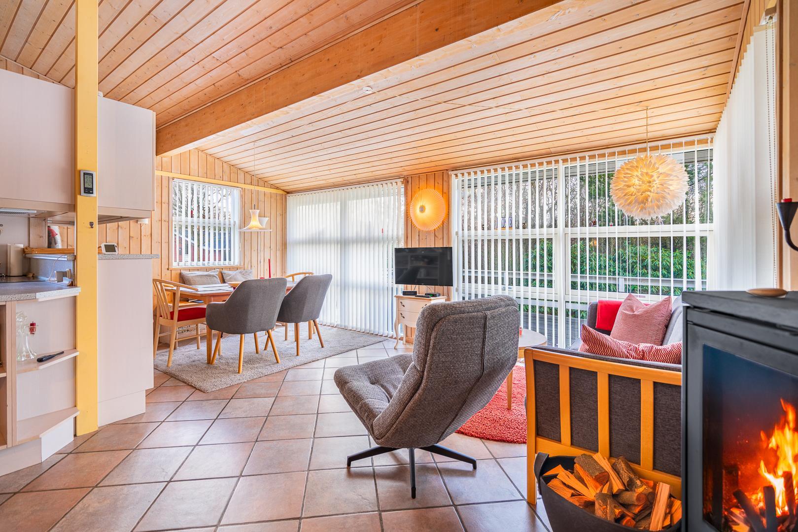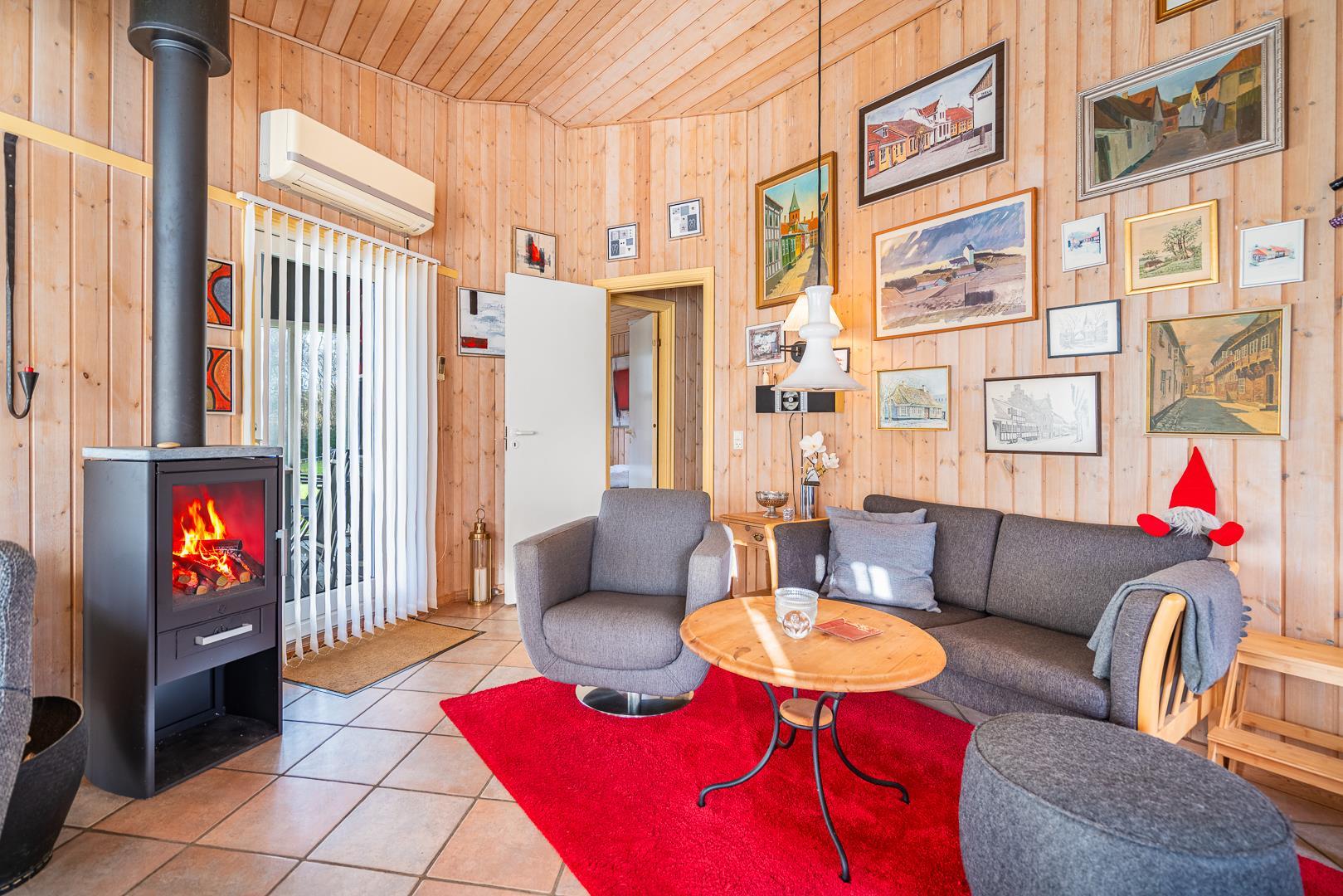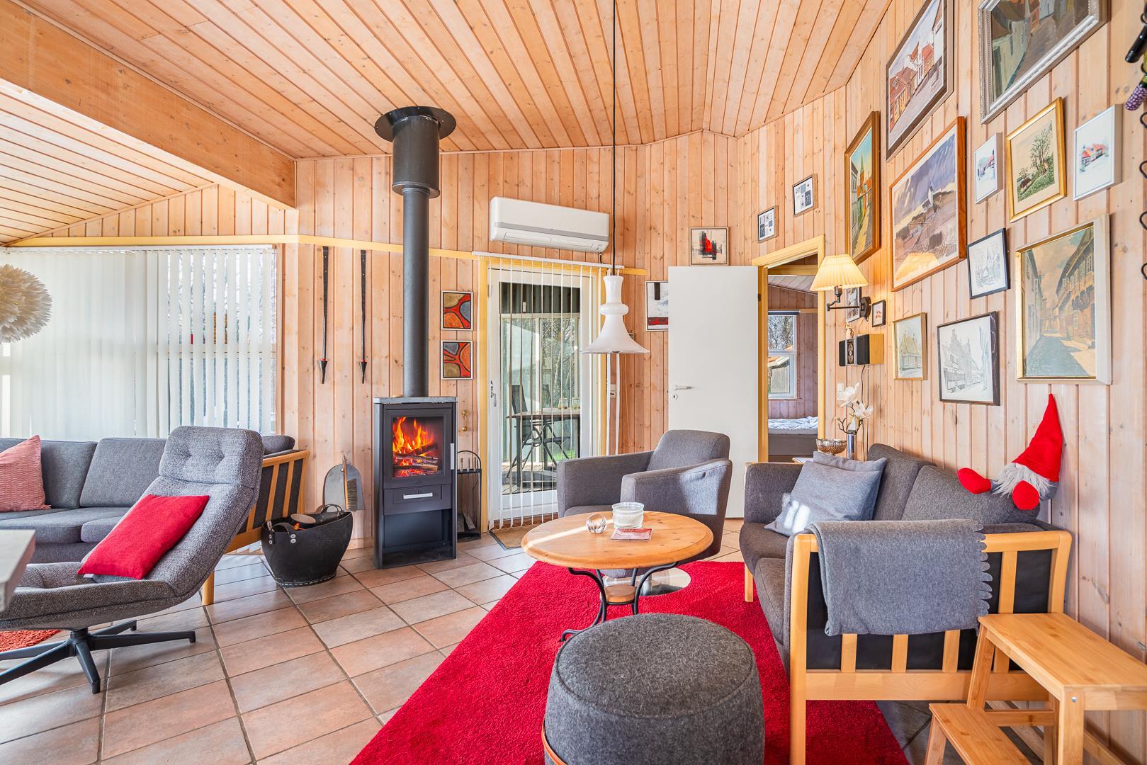 Det lyse og venlige opholdsrum indbyder til hygge. Nyd varmen fra brændeovnen på kølige dage, eller lad varmepumpen sørge for et behageligt indeklima året rundt.