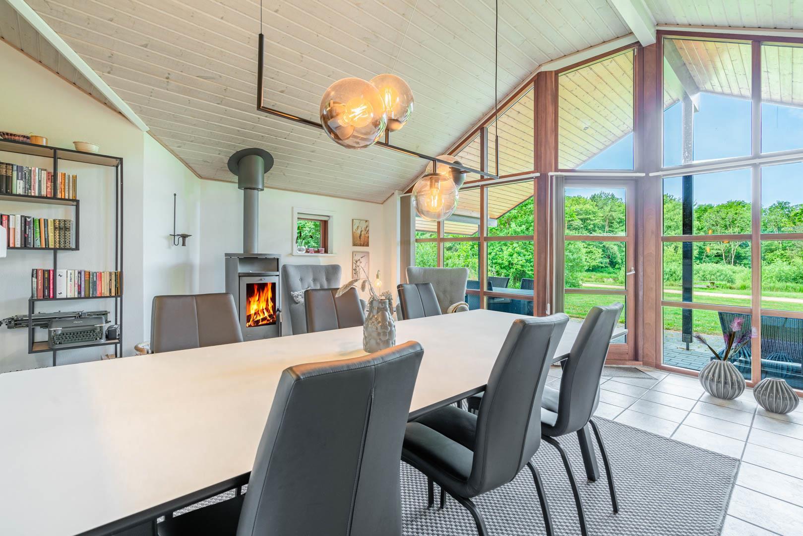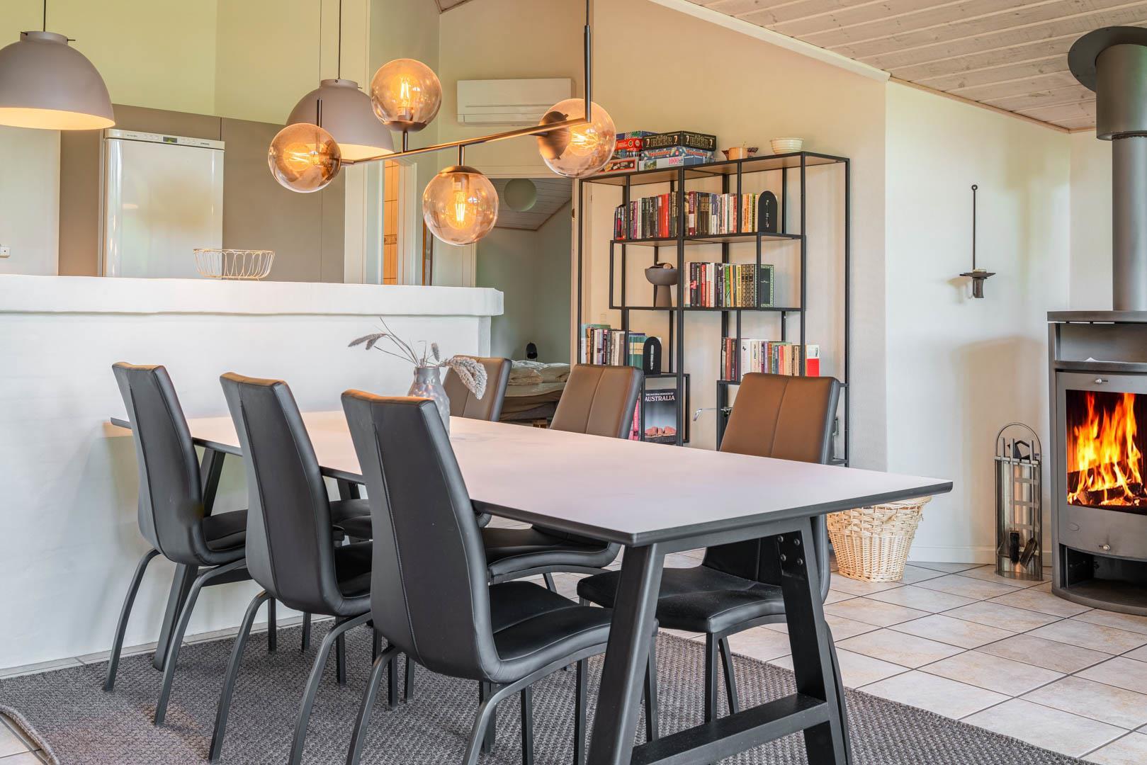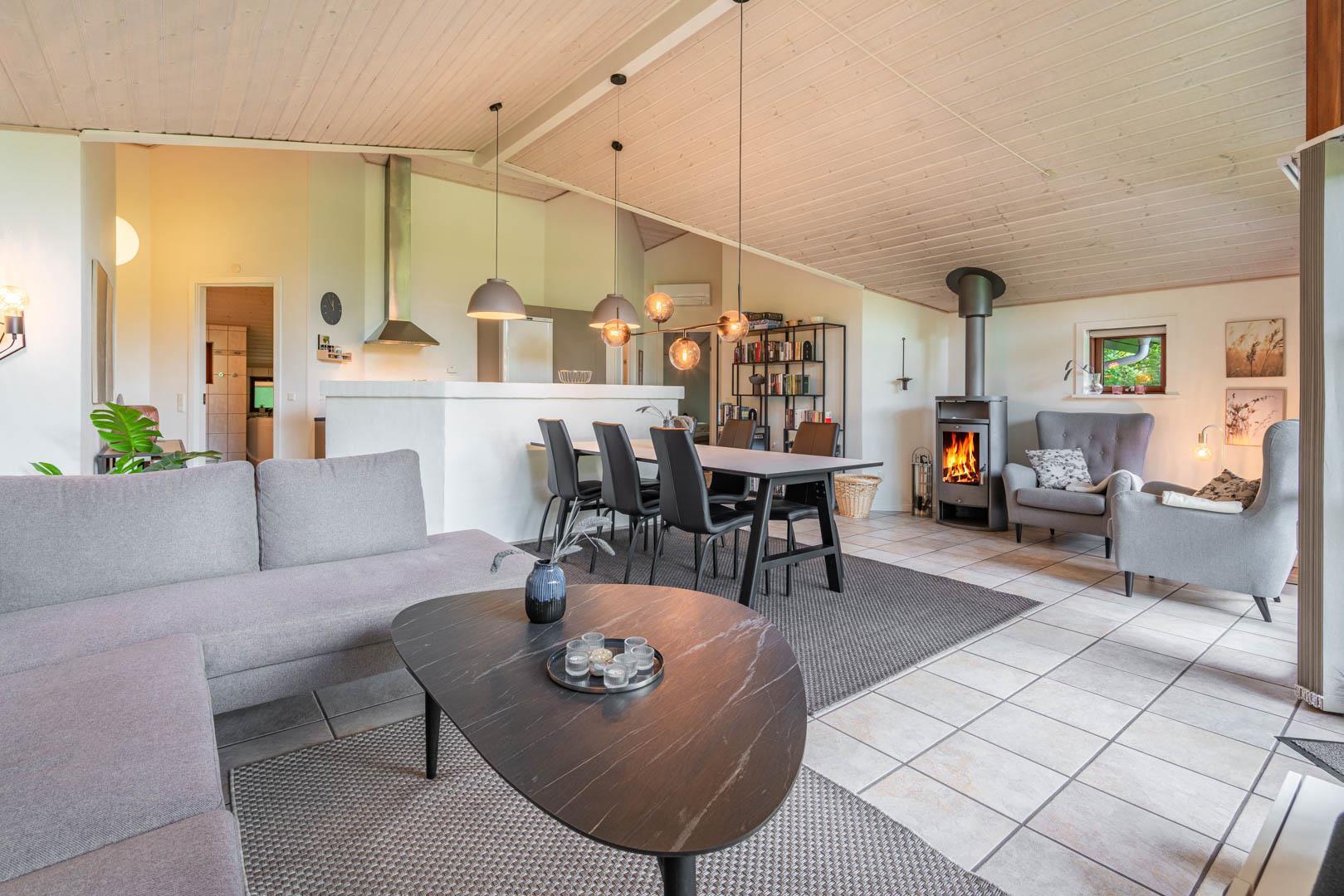Husets hjerte er det åbne opholdsrum, hvor stue og køkken ligger i forbindelse med hinanden. I stuen sørger gulvvarme, brændeovn og varmepumpe for en behagelig temperatur året rundt, mens en spillekonsol giver ekstra underholdning til både børn og voksne. Uanset om ferien ligger om sommeren eller midt om vinteren, er her skabt en hyggelig atmosfære.