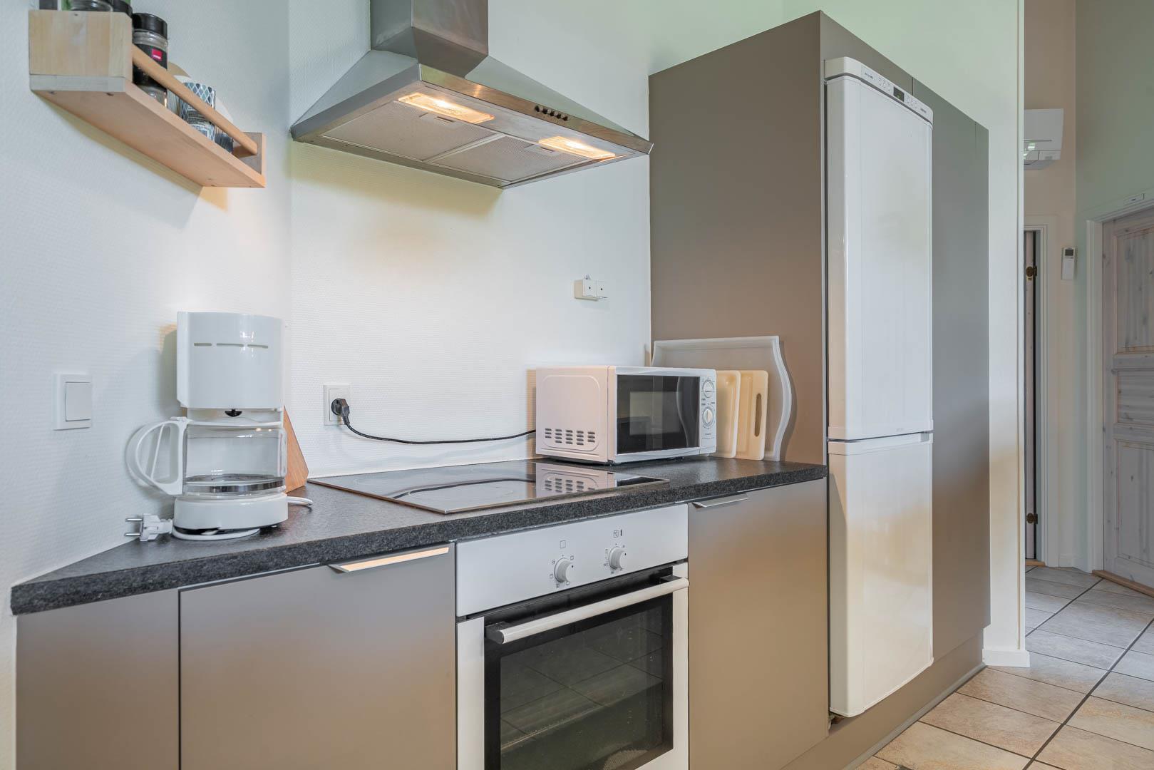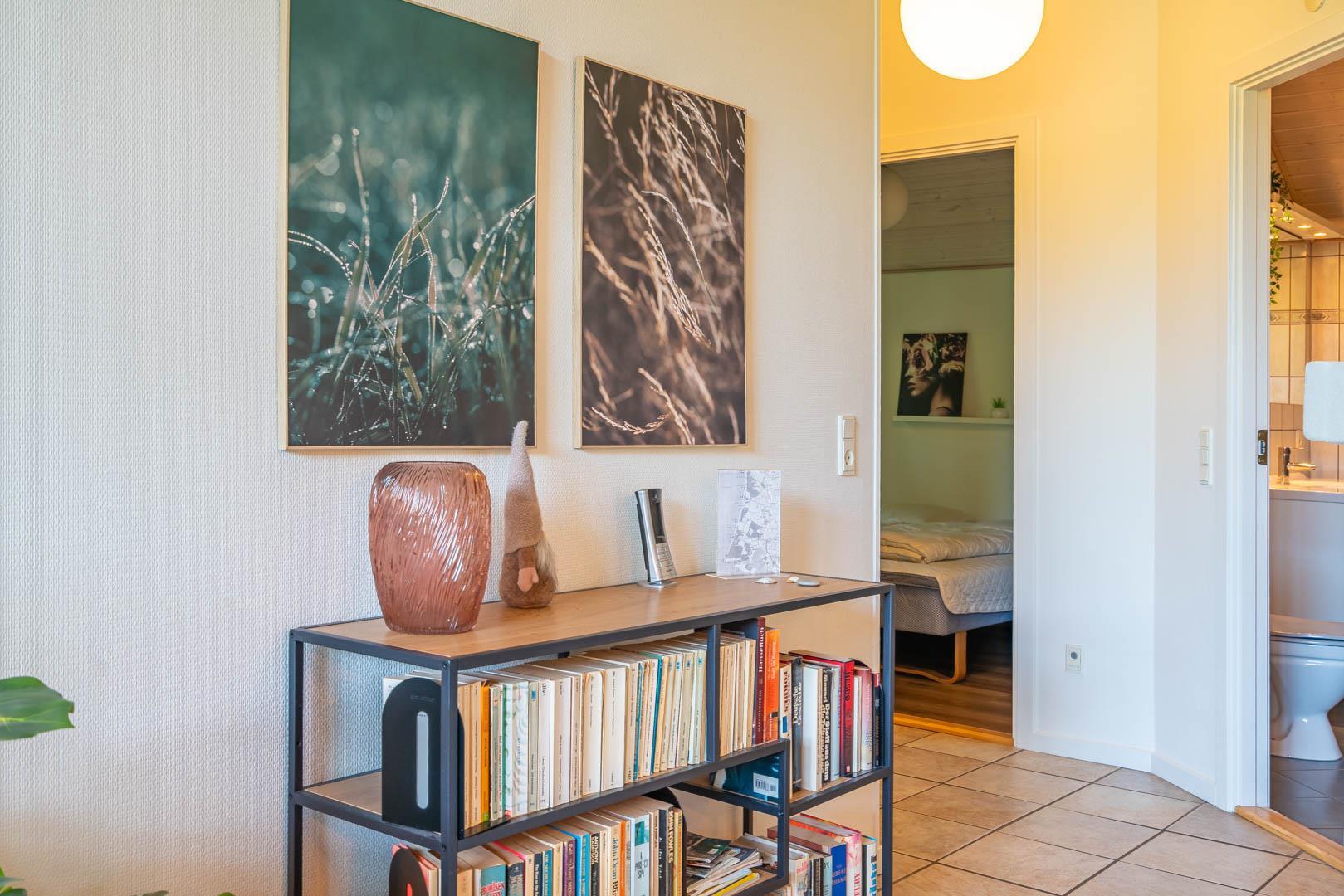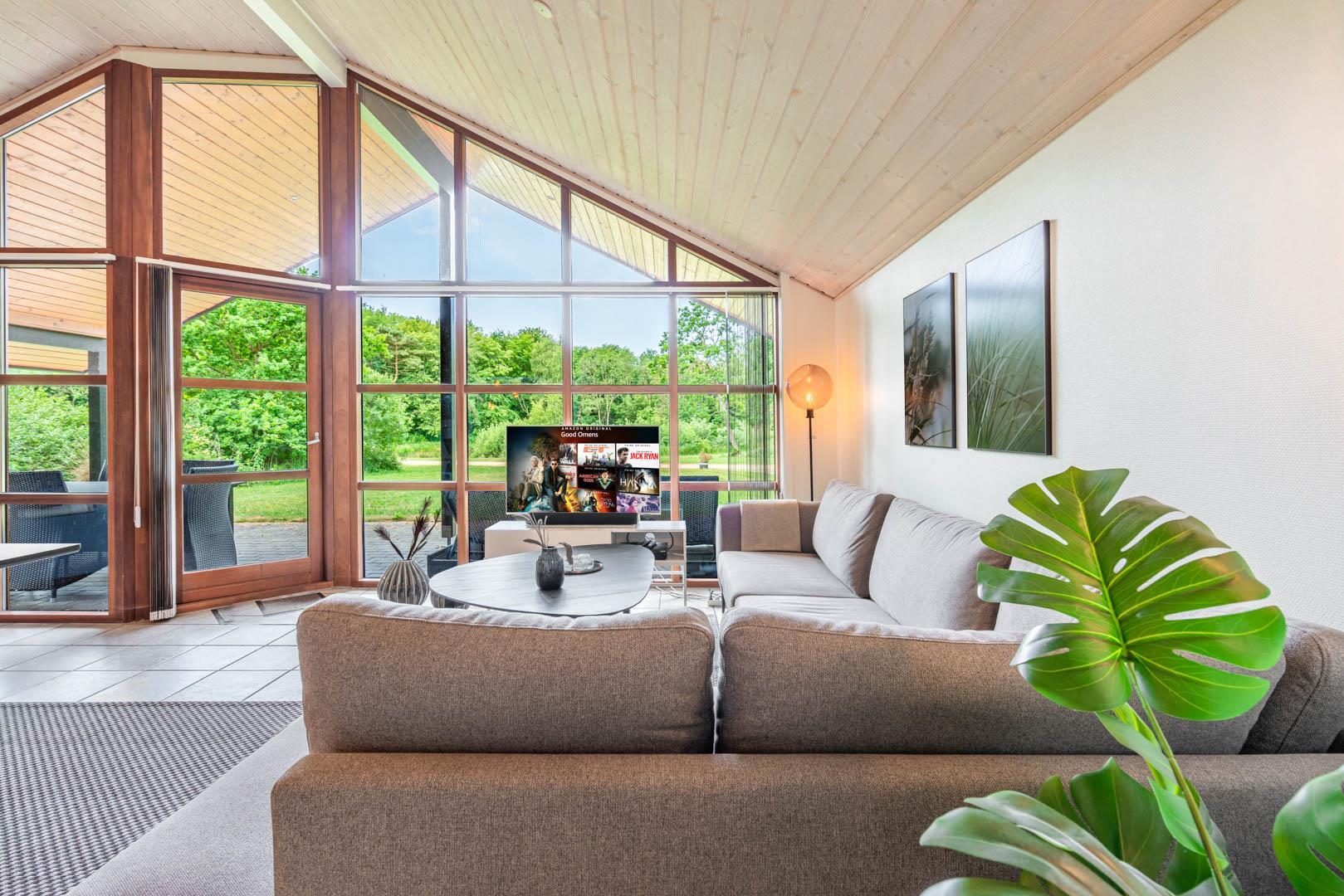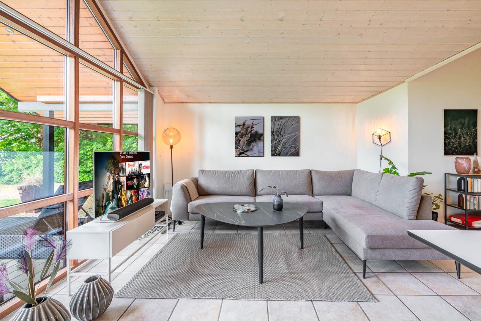 Husets hjerte er det åbne opholdsrum, hvor stue og køkken ligger i forbindelse med hinanden. I stuen sørger gulvvarme, brændeovn og varmepumpe for en behagelig temperatur året rundt, mens en spillekonsol giver ekstra underholdning til både børn og voksne. Uanset om ferien ligger om sommeren eller midt om vinteren, er her skabt en hyggelig atmosfære.