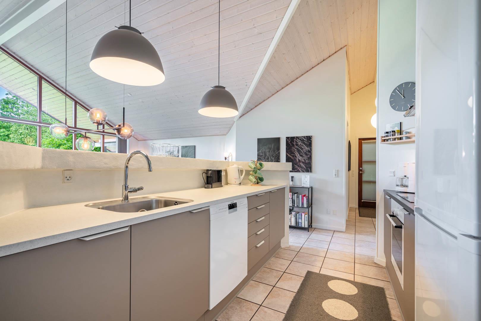 Køkkenet er åbent og praktisk indrettet med opvaskemaskine og gulvvarme – perfekt til fælles madlavning i ferien. Spisepladsen ligger med udsigt til terrasse og have, så I kan nyde lange middage og rolige aftener med kig til det grønne.