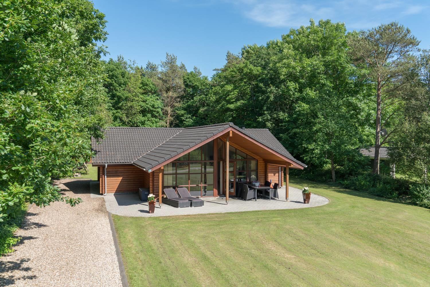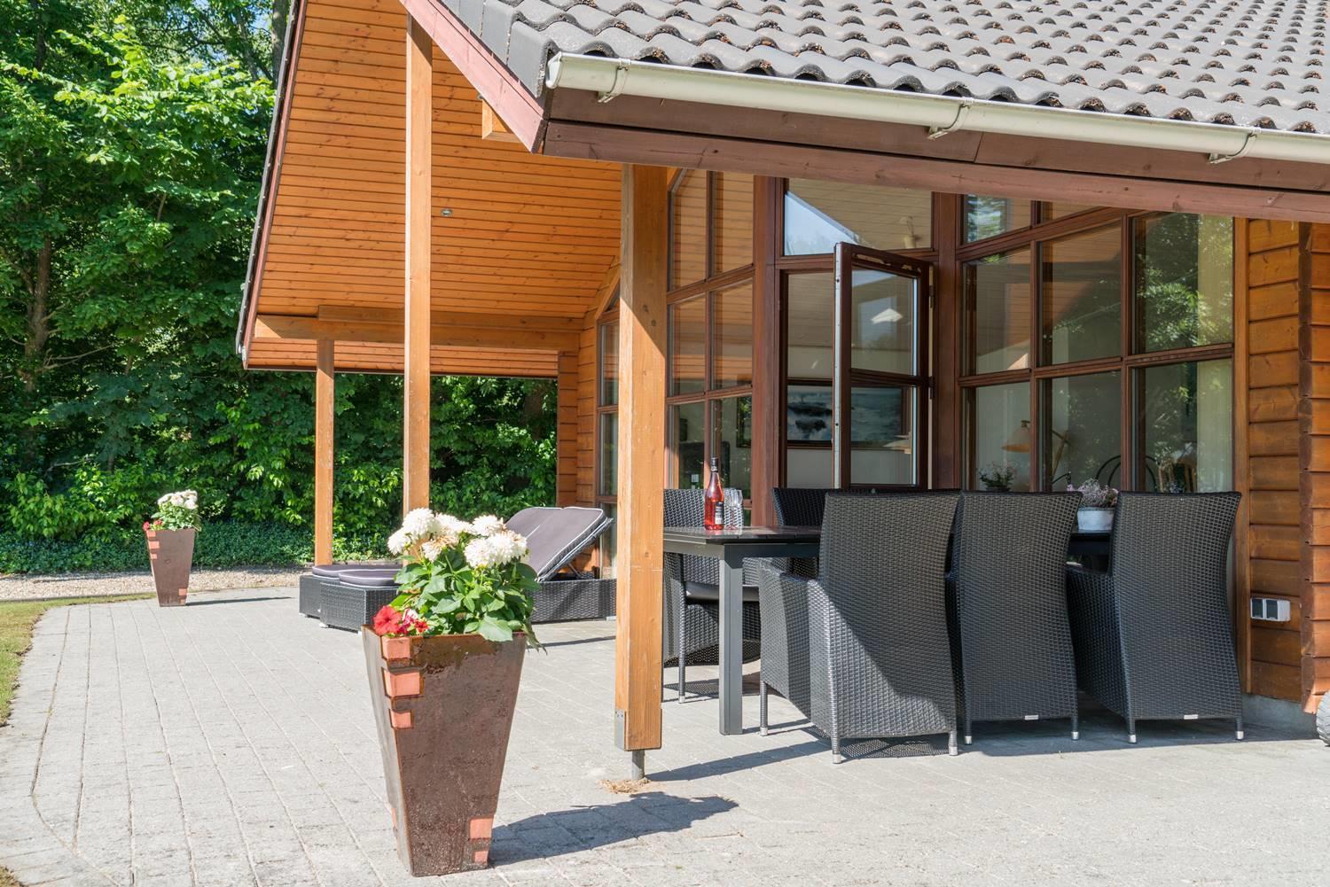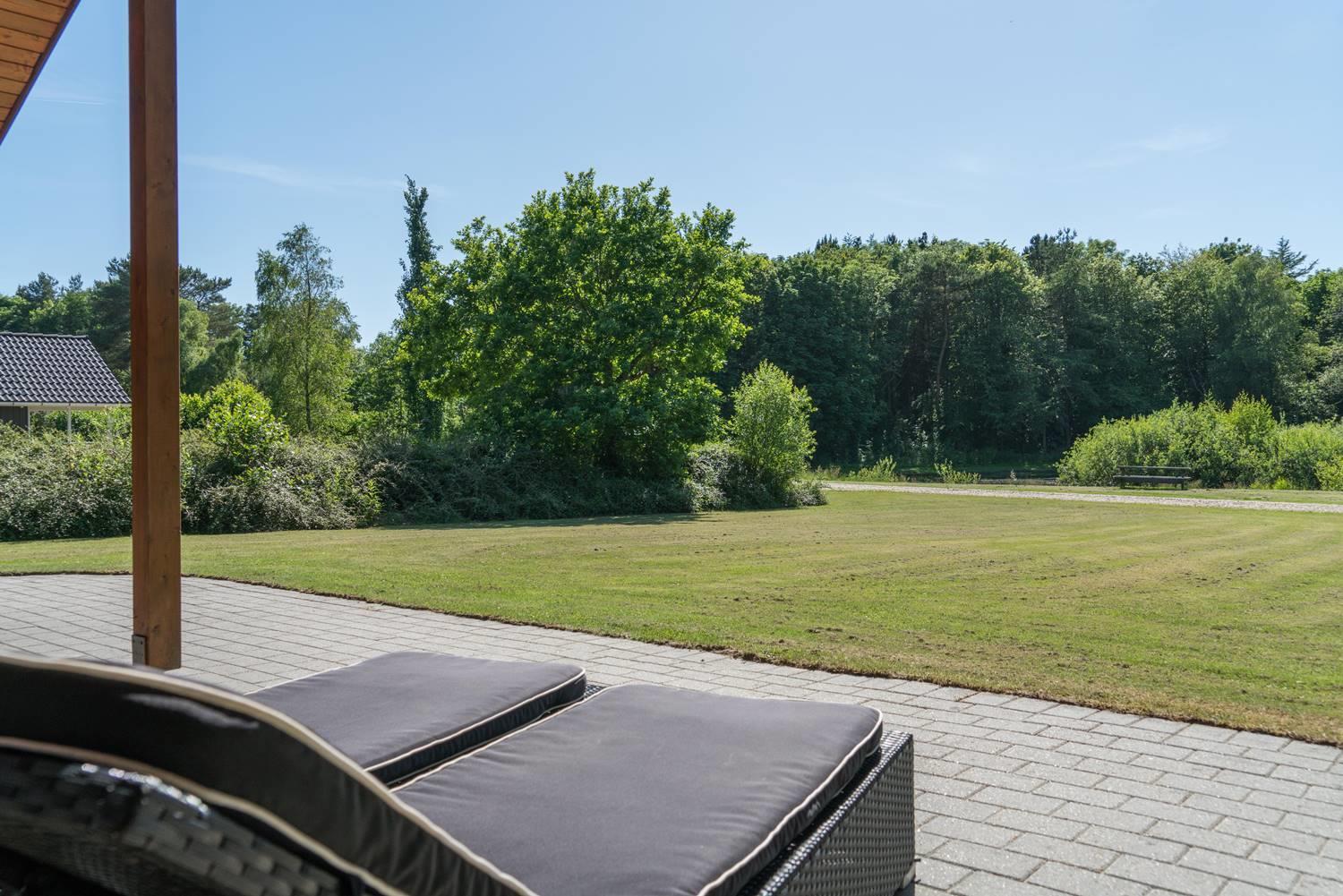 Udendørs venter en overdækket terrasse, hvor I kan nyde måltider i det fri eller slappe af med en kop kaffe efter en dag ved stranden. Den rolige grund giver god plads til både leg og afslapning.
