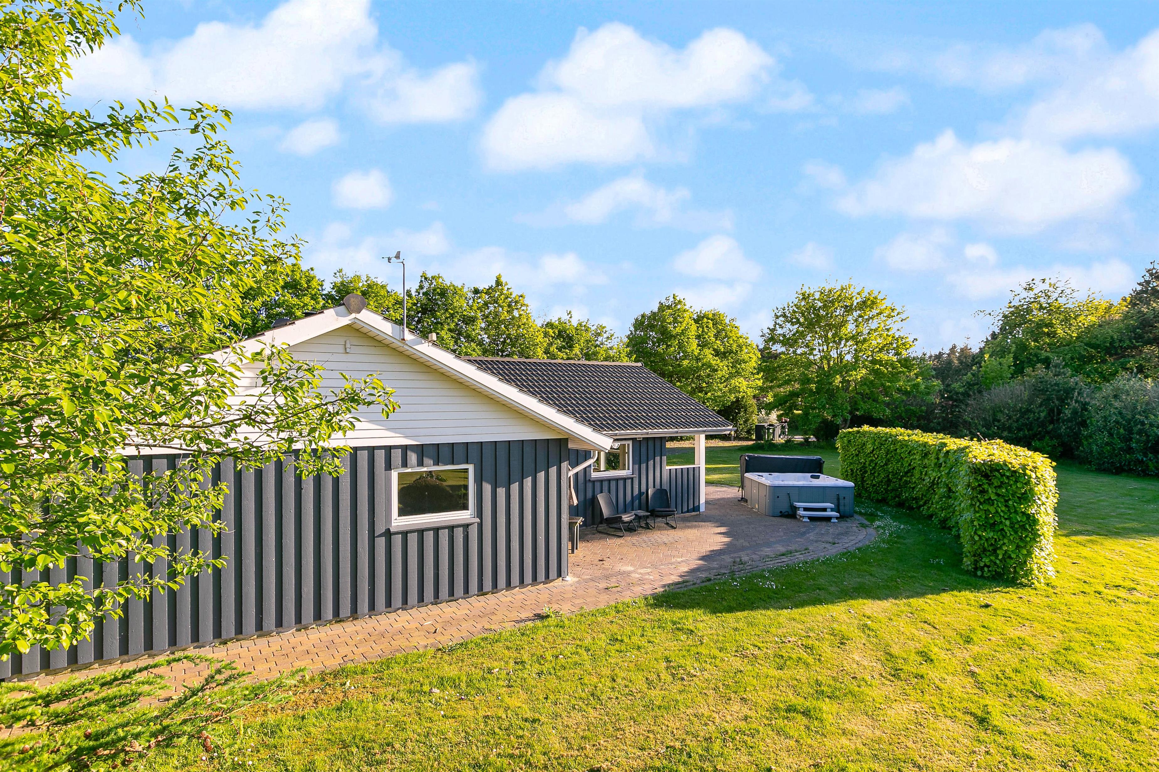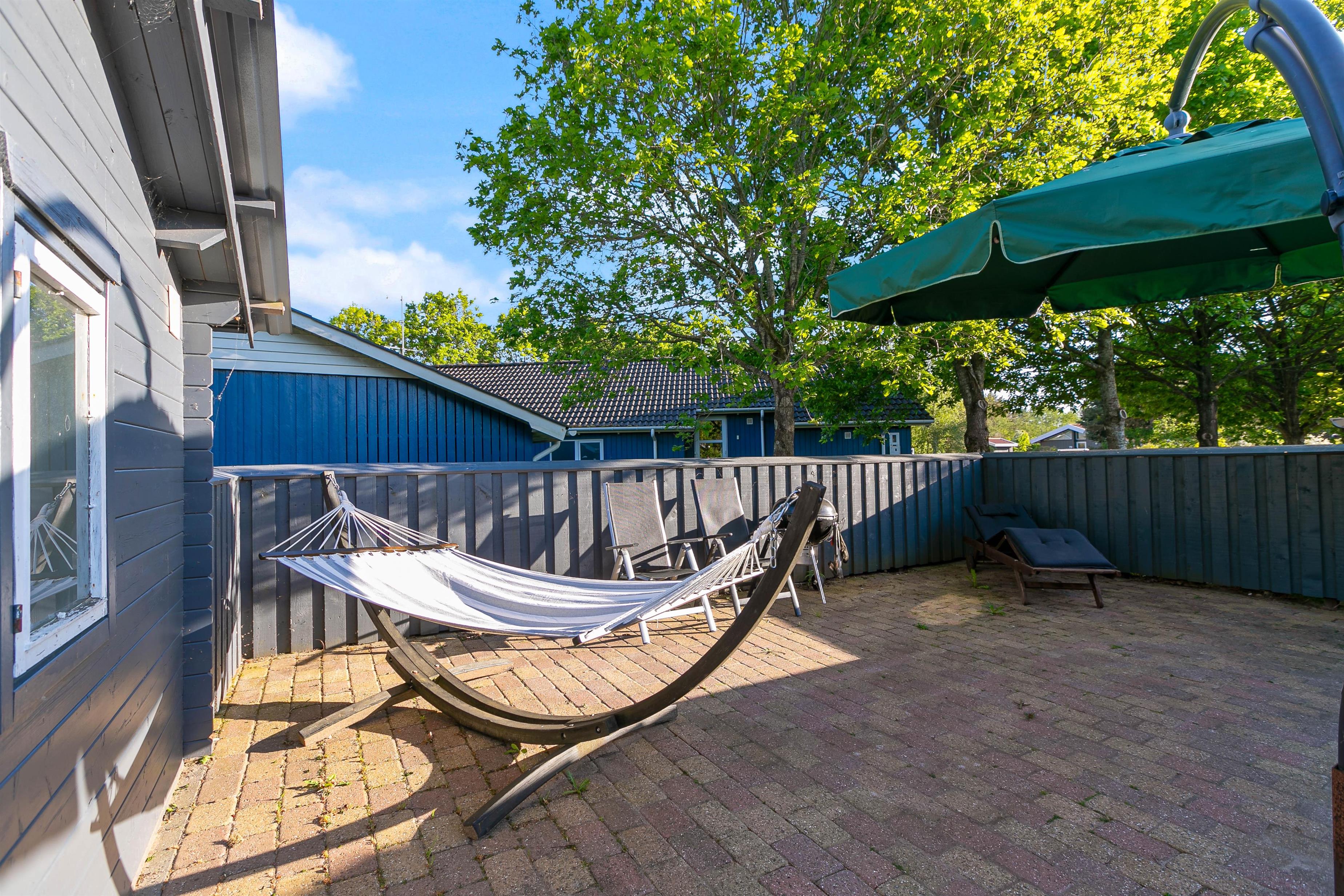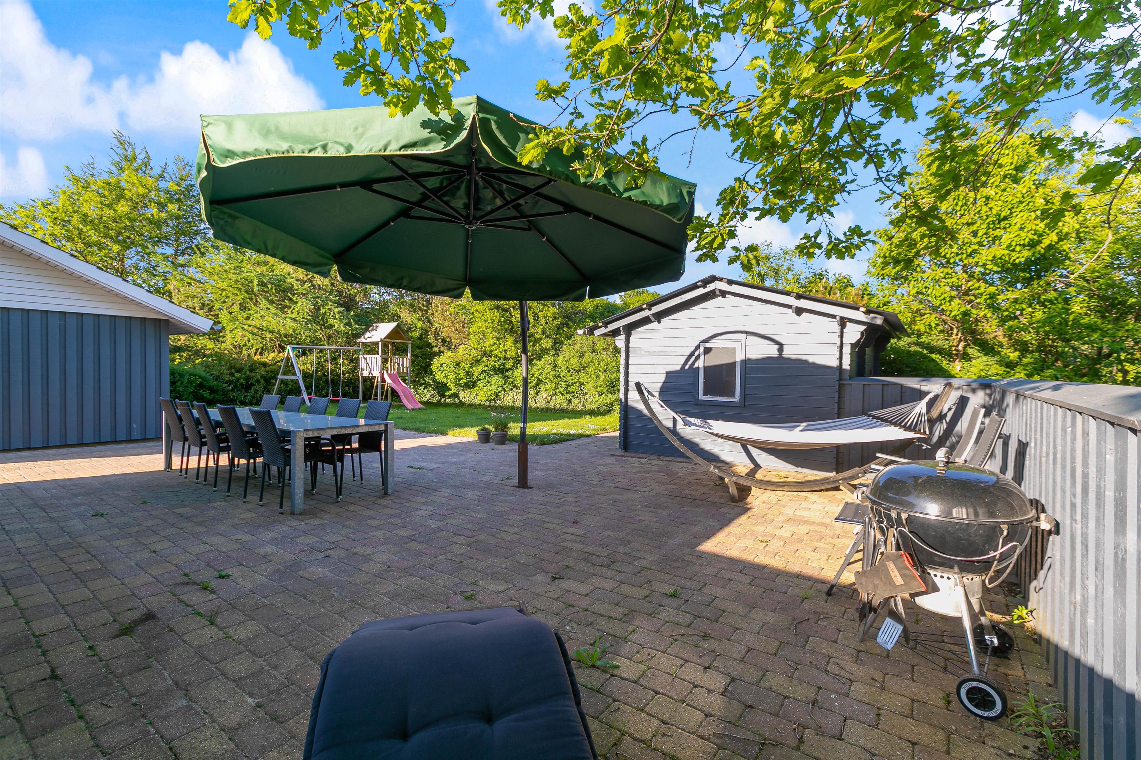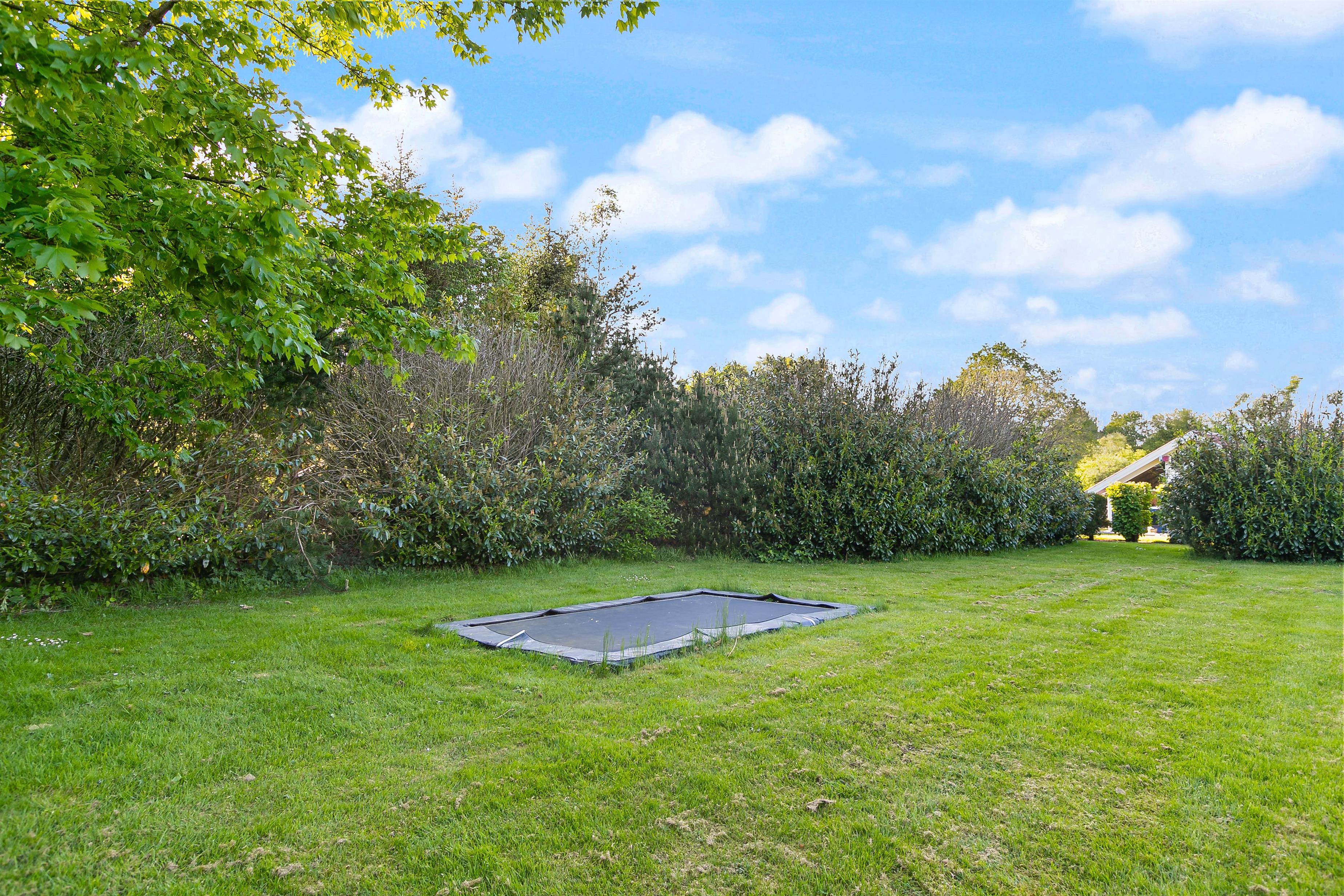 Feriehuset er placeret på en 1645 m2 stor plænegrund, hvoraf det dejlige terrasseområde og bålpladsen er indhegnet. Her kan både hunde og børn boltre sig. Til børnene er der også både trampolin, et legetårn med gynger og rutsjebane, sandkasse og en bålplads, hvor I kan nyde mørket falde på en stille sommeraften, mens I rister skumfiduser og lægger planer for de kommende feriedage.