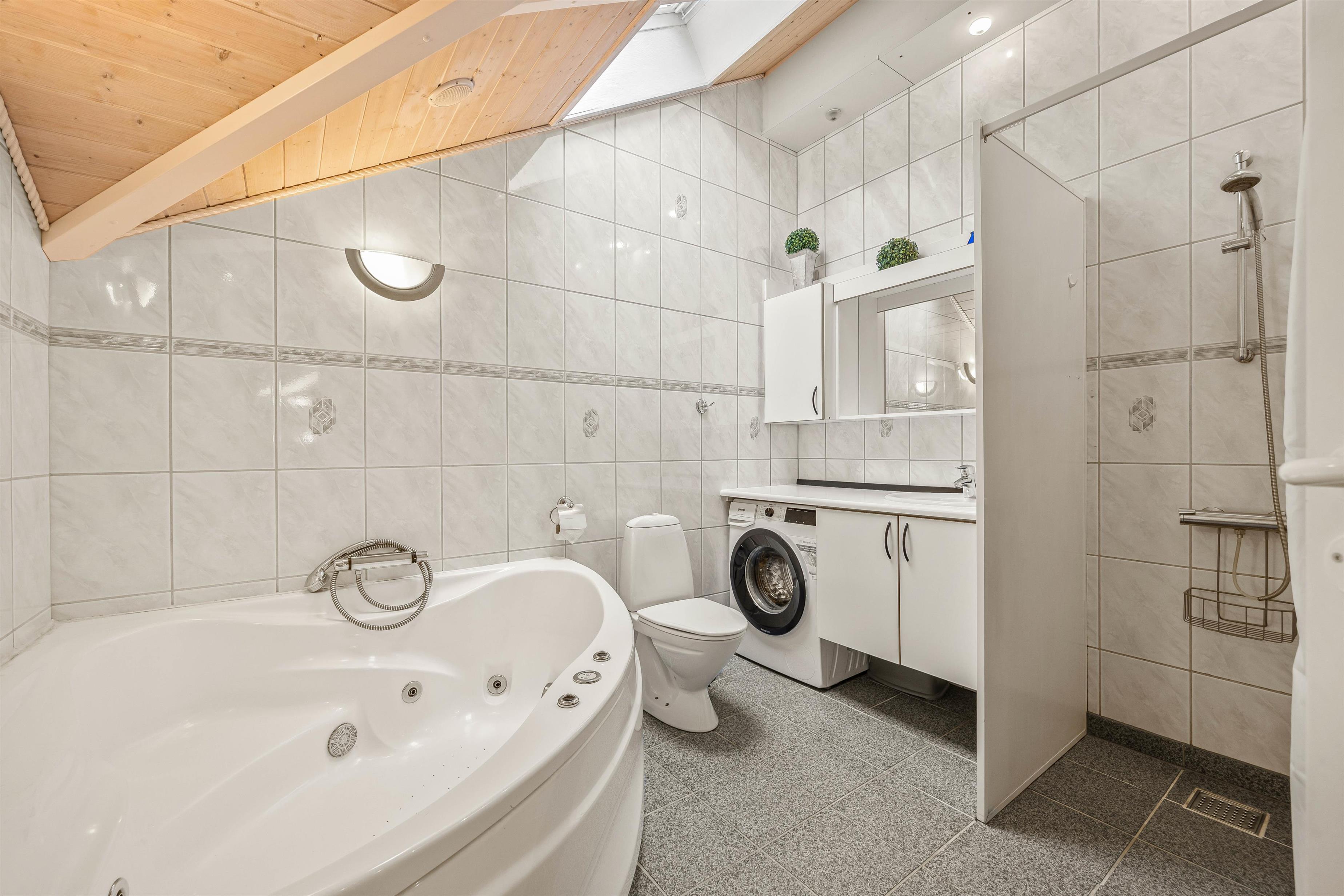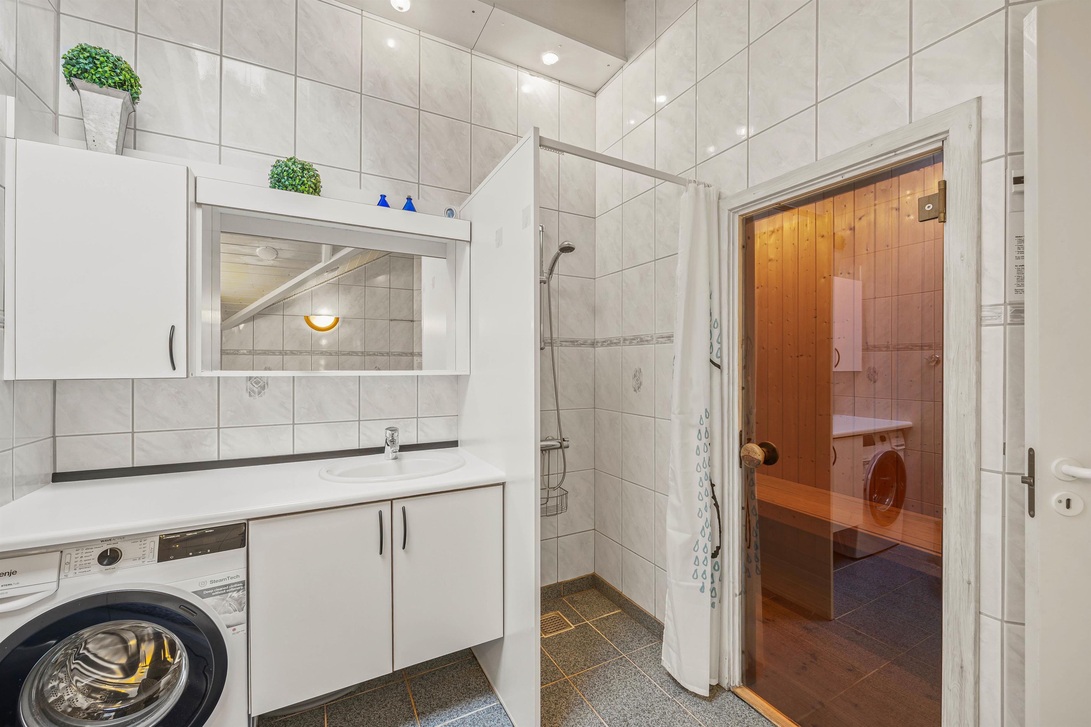 Drager I videre ind i huset, finder I 1 badeværelse og 1 gæstetoilet, som der altid er nem adgang til, når det er tid til at gøre sig klar til dagens oplevelser. Efter en dag fyldt med aktiviteter kan du lade dagens stress fordampe i husets luksuriøse sauna eller tage en afslappende tur i tømmespaen, hvor du kan lade dine muskler slappe helt af. Vaskemaskinen står klar til at holde garderoben frisk og klar til nye eventyr, så du kun skal fokusere på at nyde ferien i de smukke omgivelser.