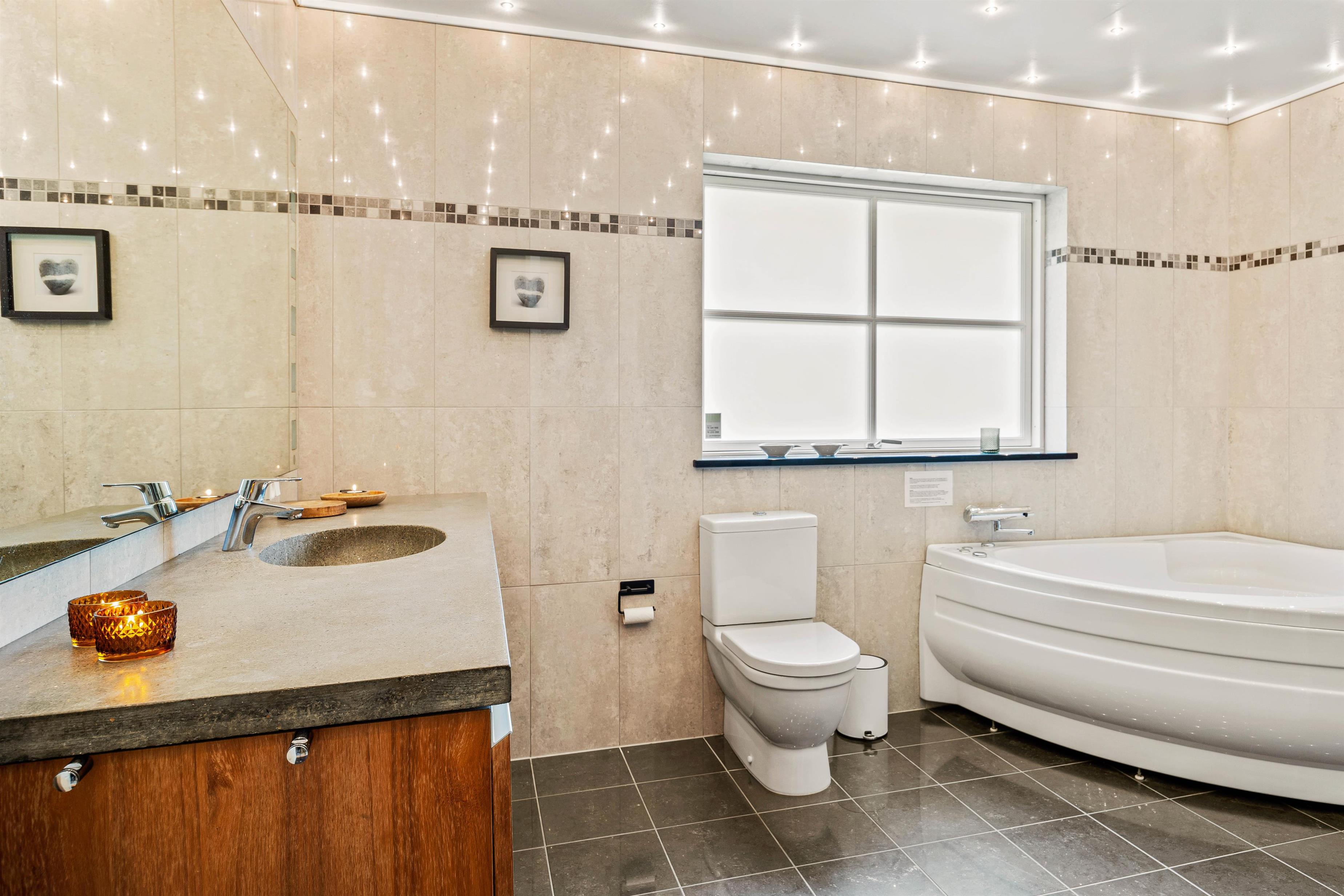 På stueetagen finder I de tre soveværelser, alle indrettet med dobbeltsenge. Ved siden af værelserne er der et badeværelse, og her er der både sauna og spa. Så her kan I rigtig blive varmet igennem på de køligere dage efter en lang gåtur i det skønne område, eller bare lade tankerne flyde og slappe helt af i hver en muskel.