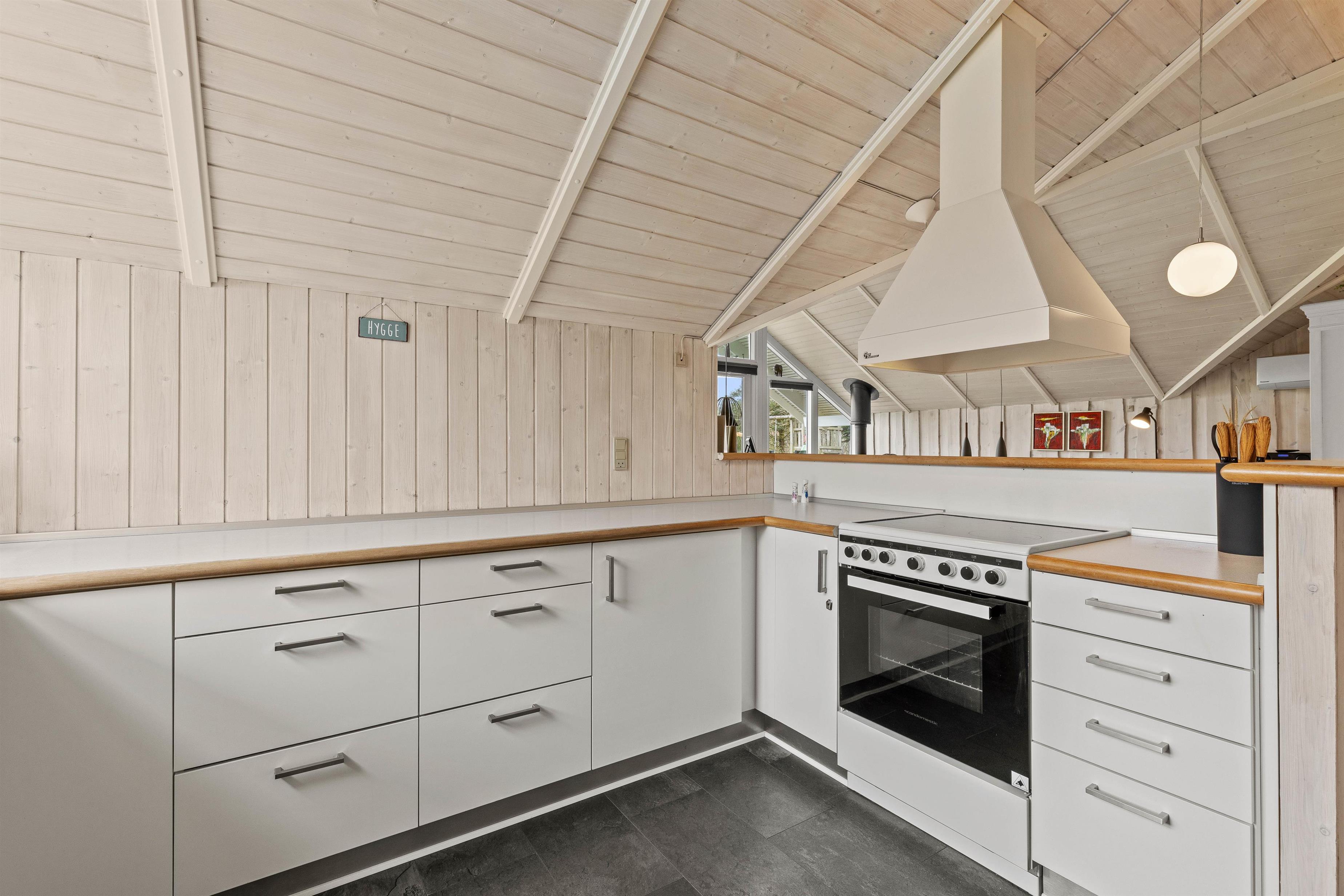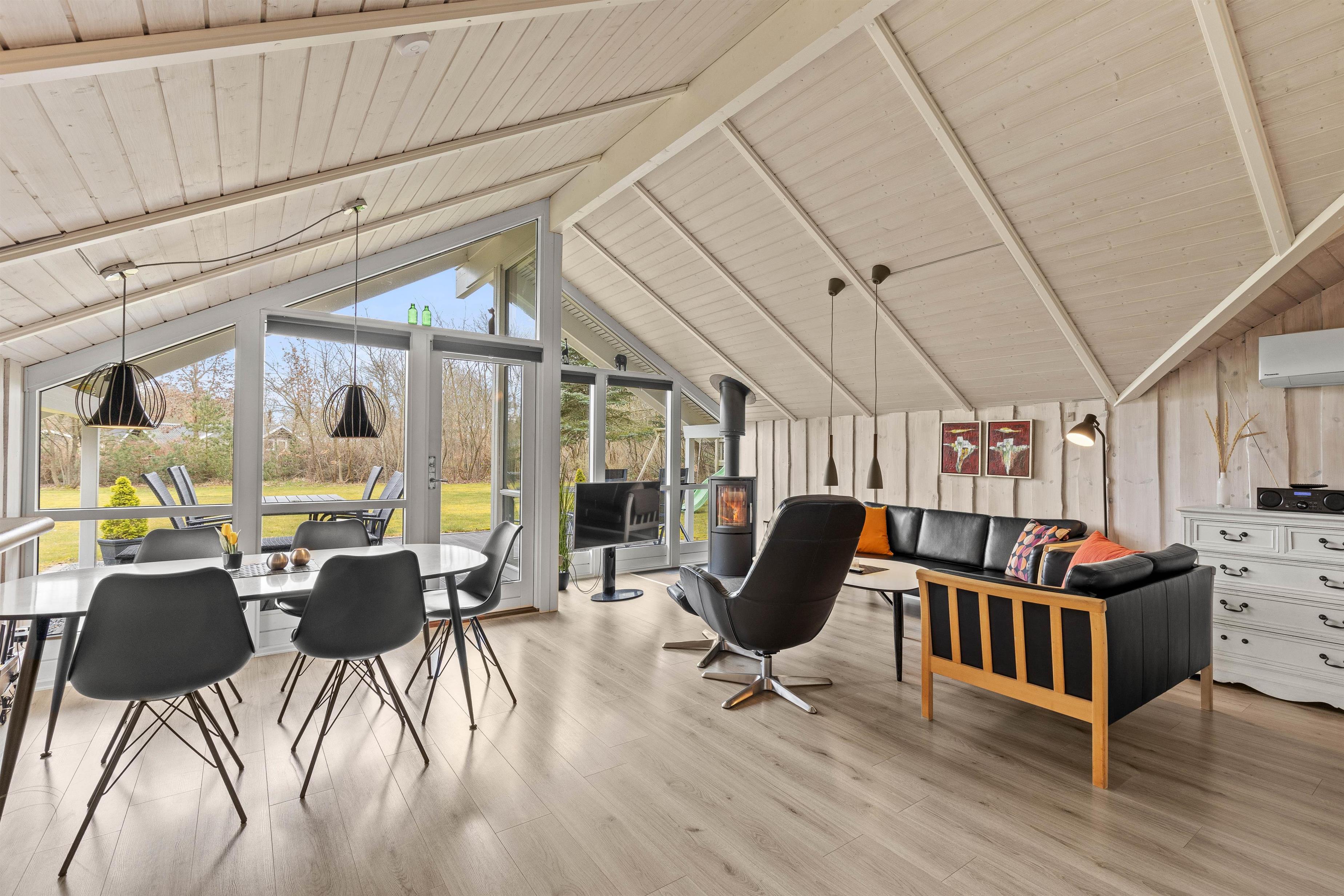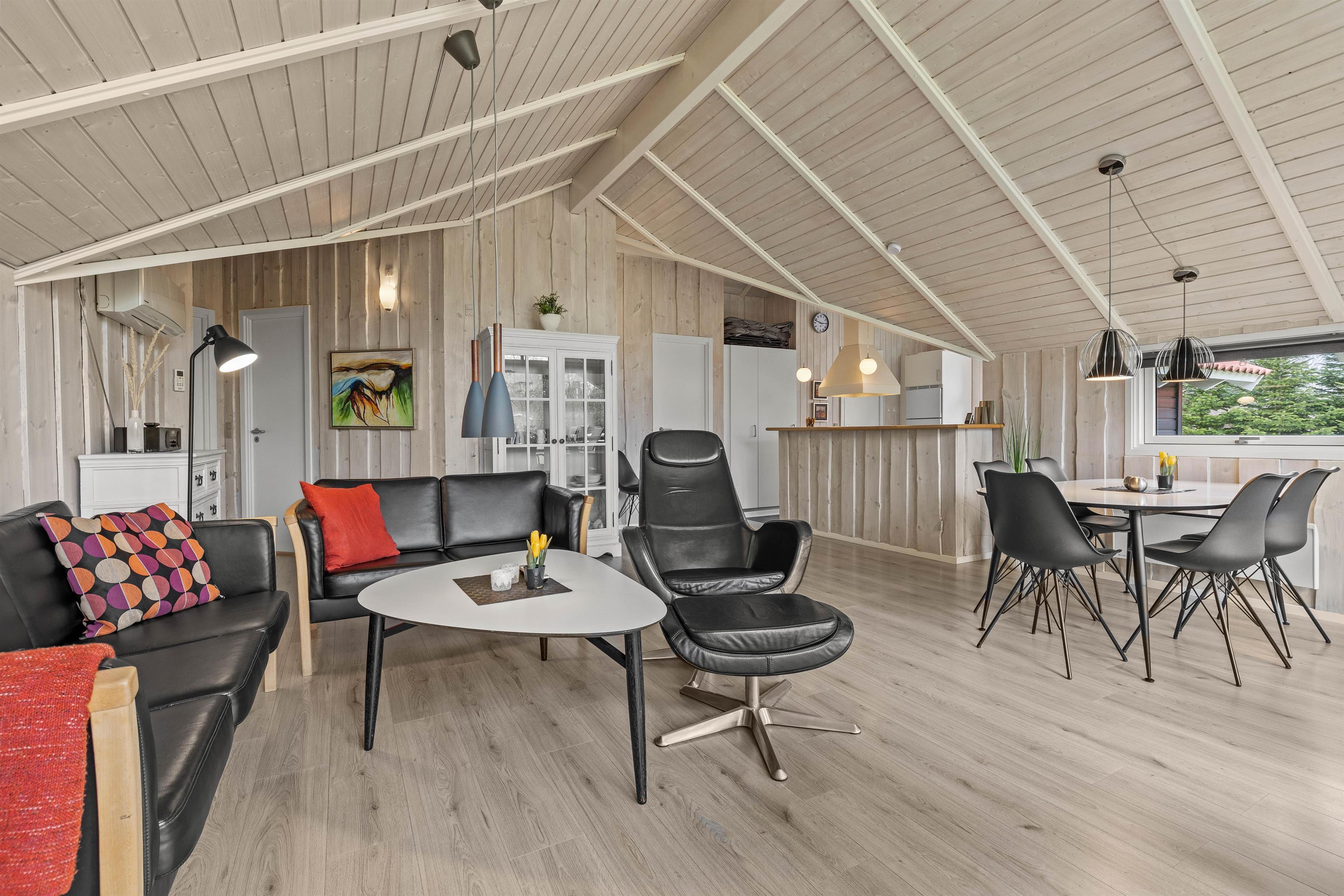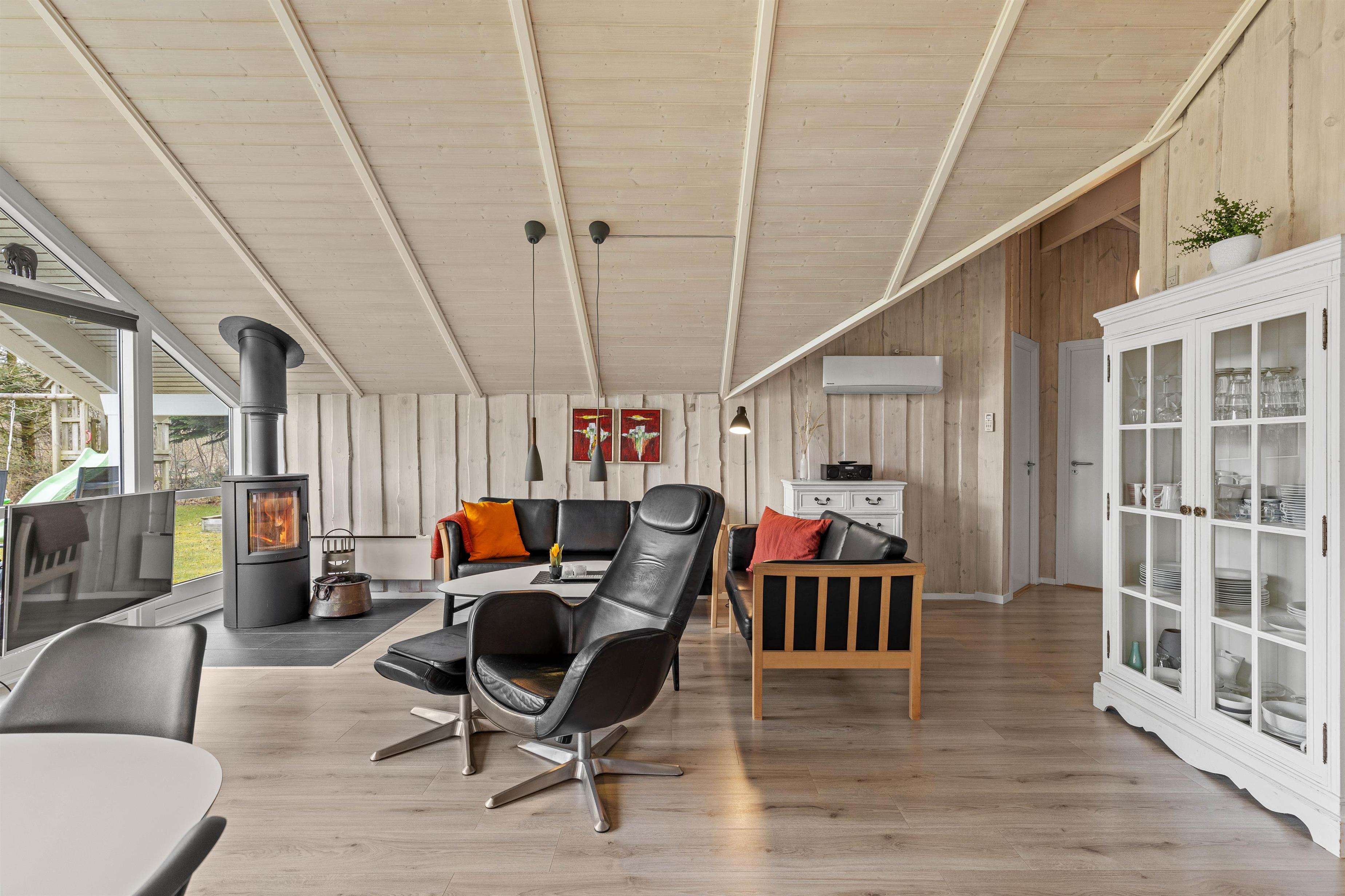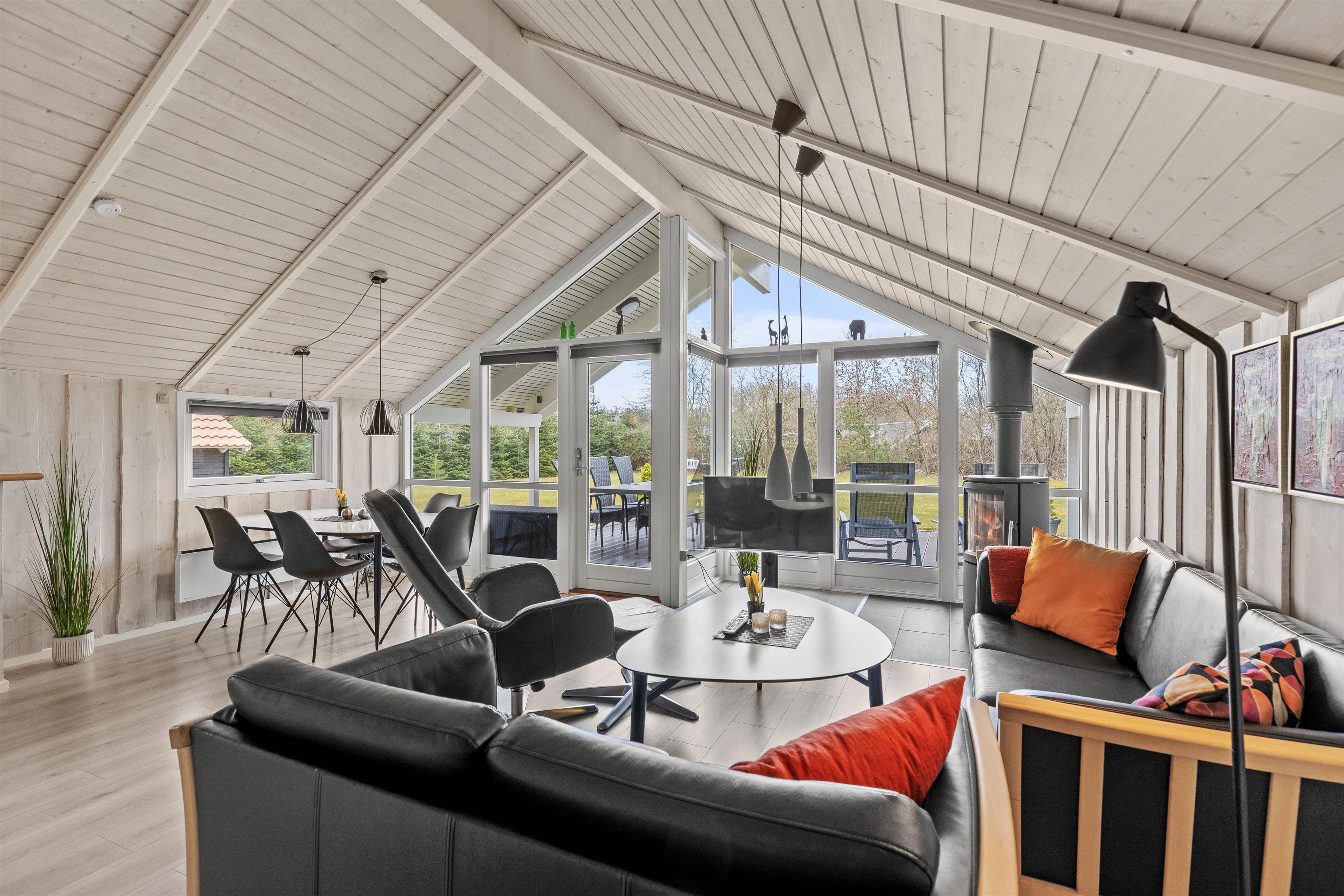Husets hjerte er det åbne opholdsrum, der forener stue og køkkenalrum i et åbent fællesrum. Saml hele familien til lækre feriemåltider, hyggelige aftener med kortspil og snoller og sene aftener på sofaen foran den knitrende brændeovn.