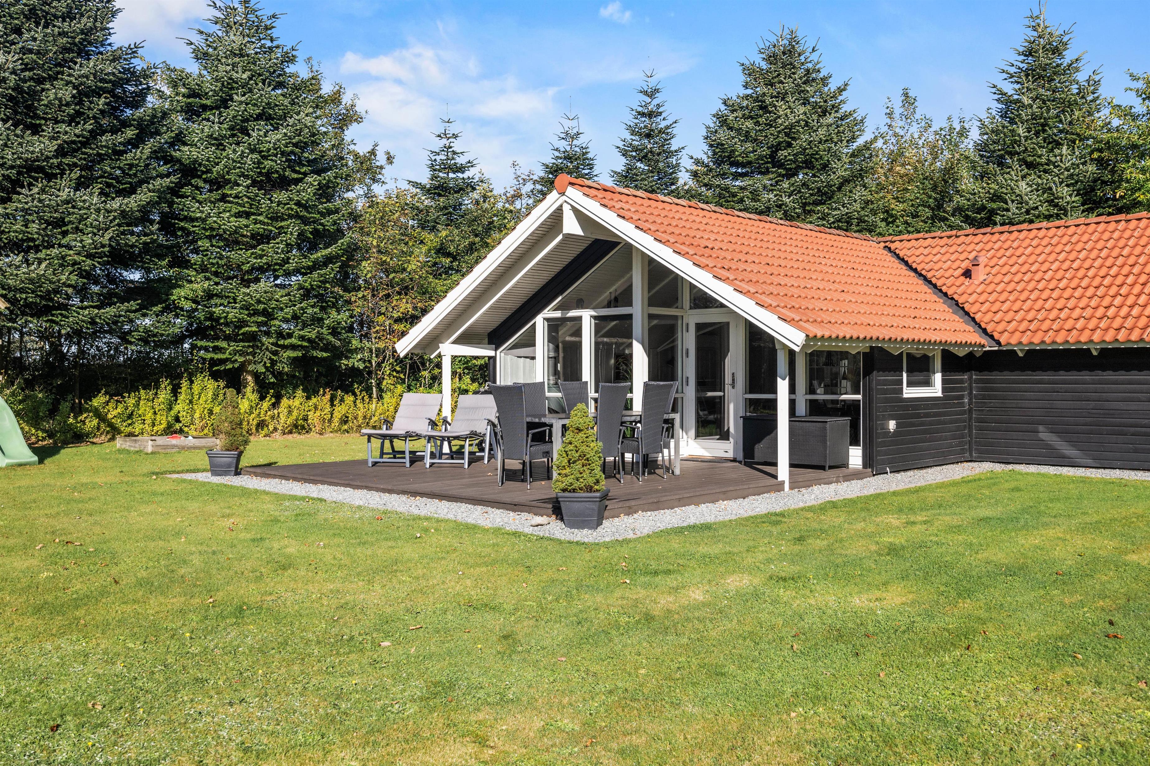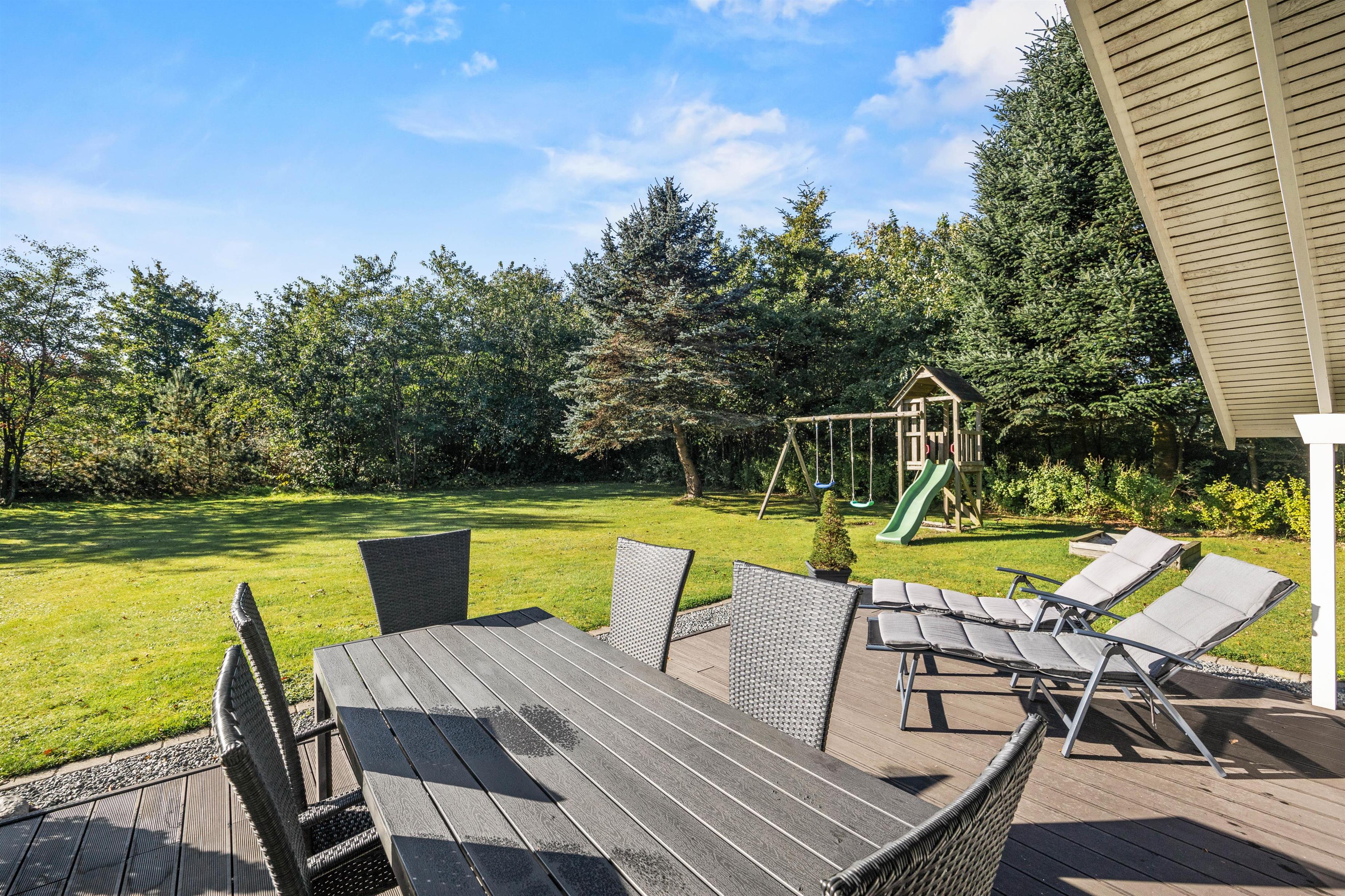Sommerhuset ligger på en mere end 1.500 kvadratmeter stor og velholdt grund. På den delvist overdækkede terrasse kan de voksne dase i solen eller nyde et glas koldt rosé i skyggen, mens børnene tumler rundt på den store græsplæne, som tilmed har et legetårn til de yngste familiemedlemmer.