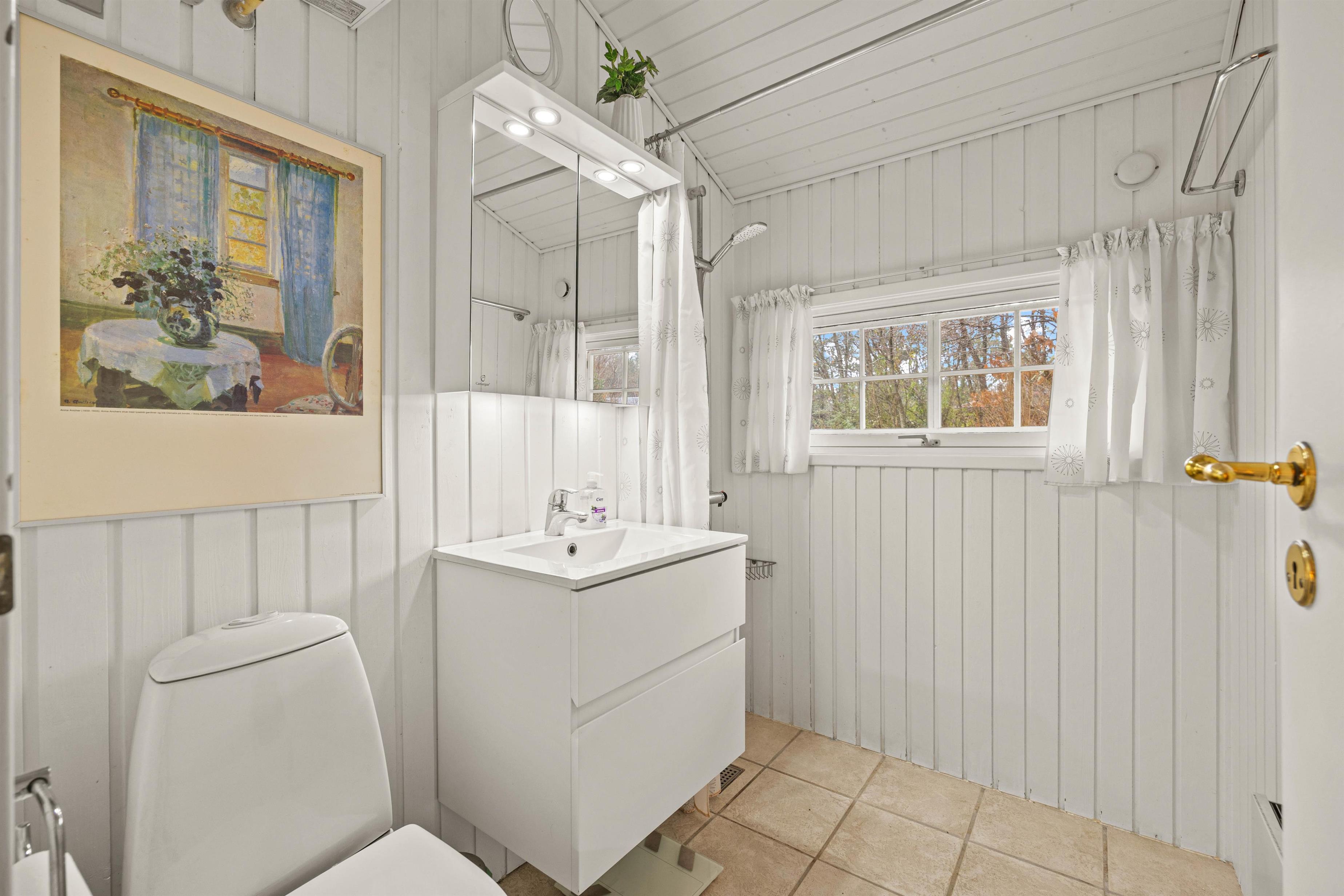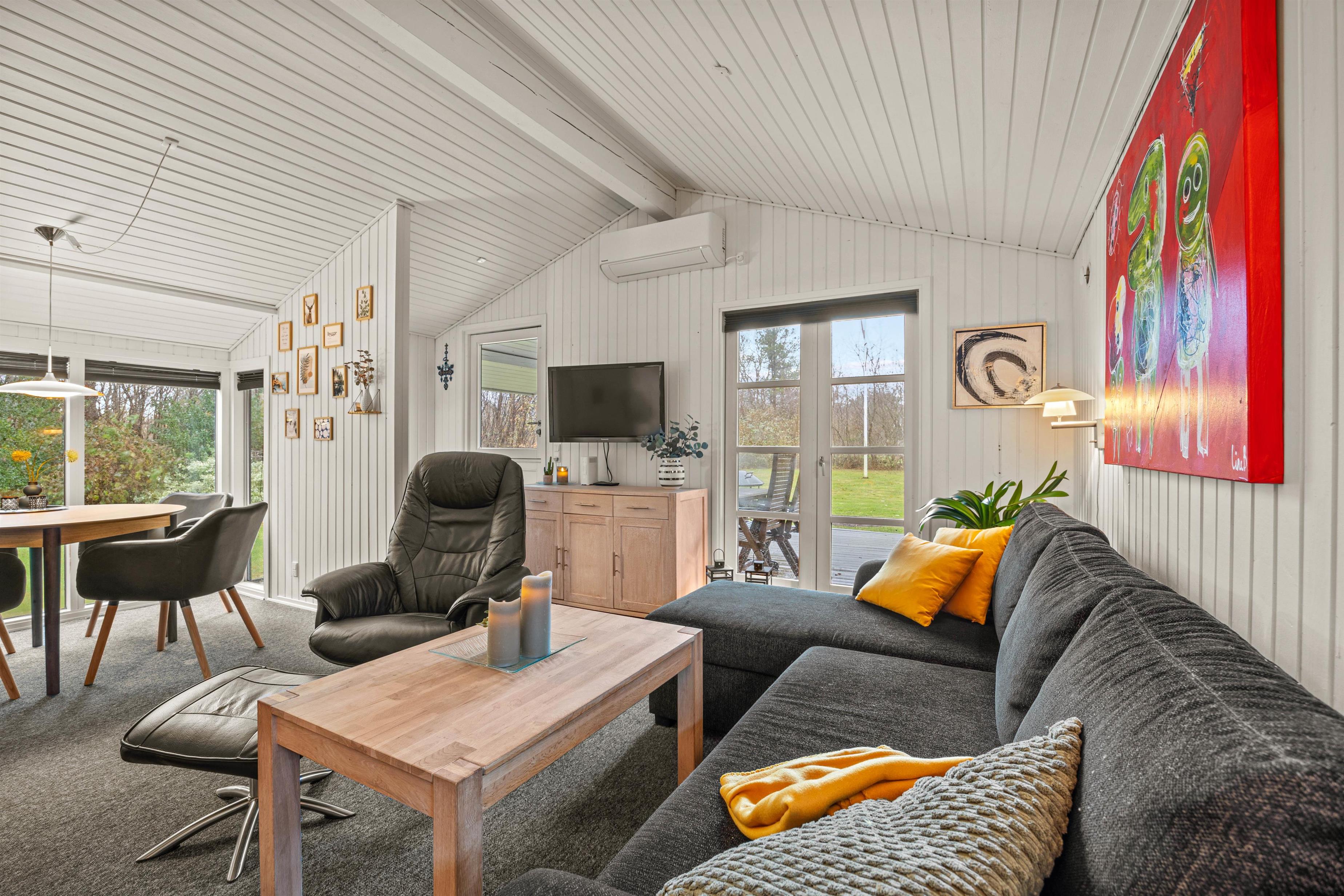 I træder ind i det smukke sommerhus gennem bryggerset, hvor der både er plads til jakker og sko samt husets vaskemaskine. Herfra kommer I ind i den hyggeligt indrettede stue med komfortable siddepladser, TV og brændeovn.