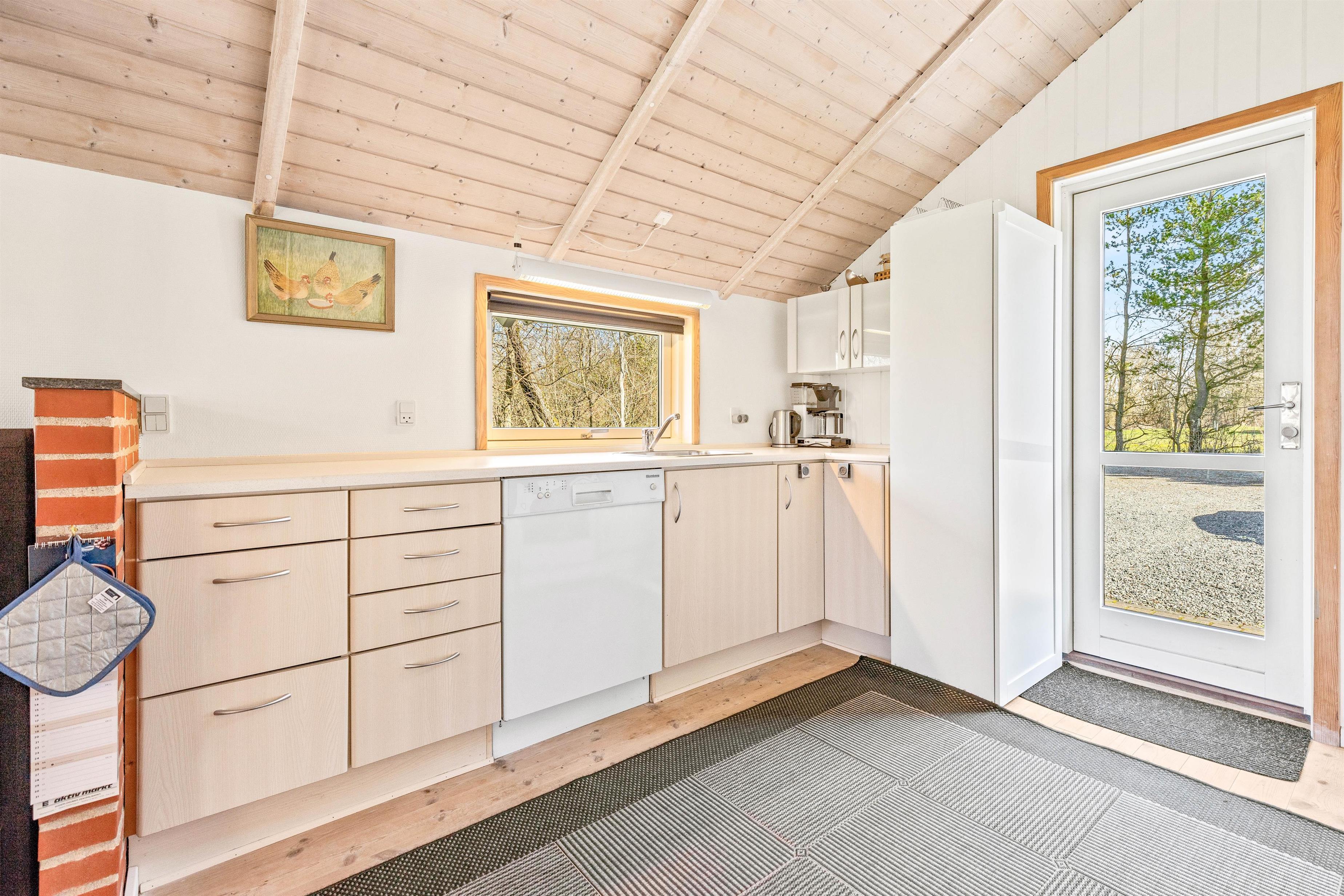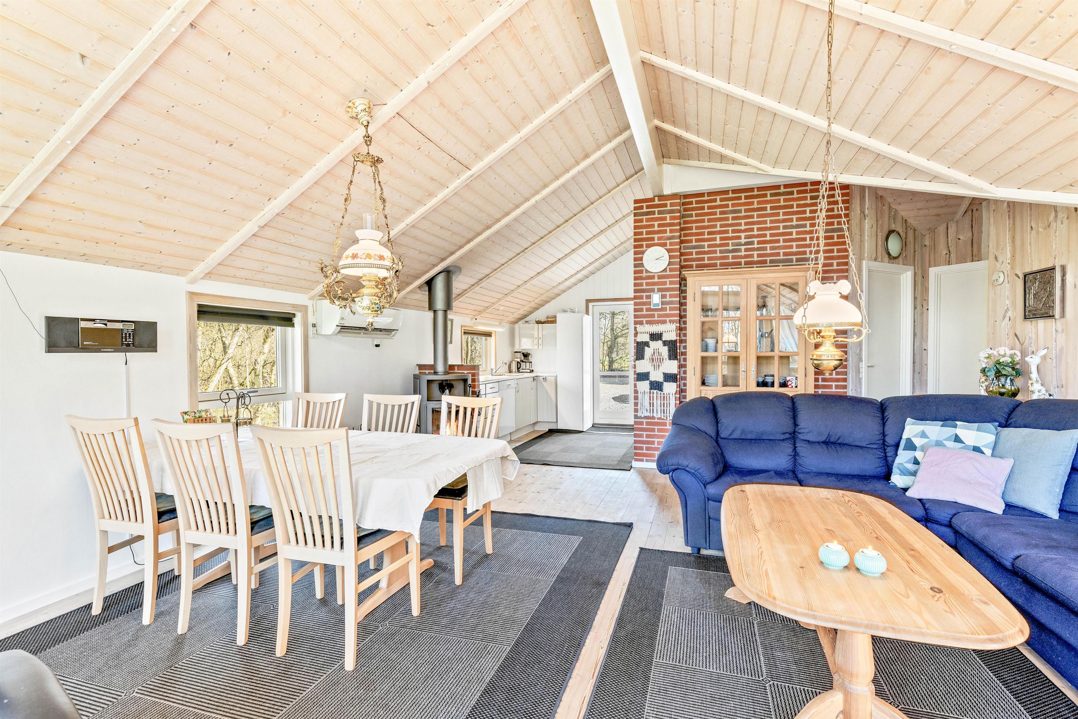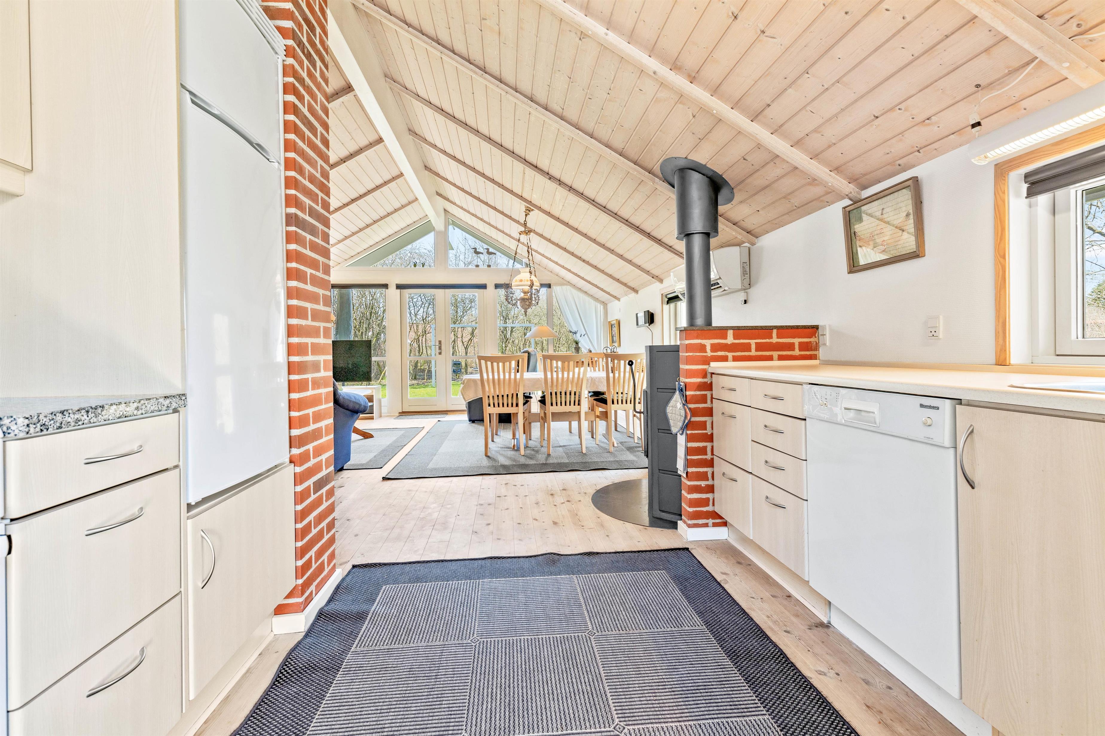 Indenfor bliver I mødt af et lyst og superhyggeligt indrettet, stort stue-alrum med åbent til køkkenet. Sammen med trægulve, -lofter og -vægge udstråler brændeovnen den ultimative sommerhusstemning. Imens åbner det store vinduesparti op for udsigten i det grønne og lukker en masse lys ind. Varmepumpen sørger for en behagelig temperatur i alrummet, og på badeværelset, der i øvrigt er udstyret med vaskemaskine, sørger gulvvarme for varme tæer.