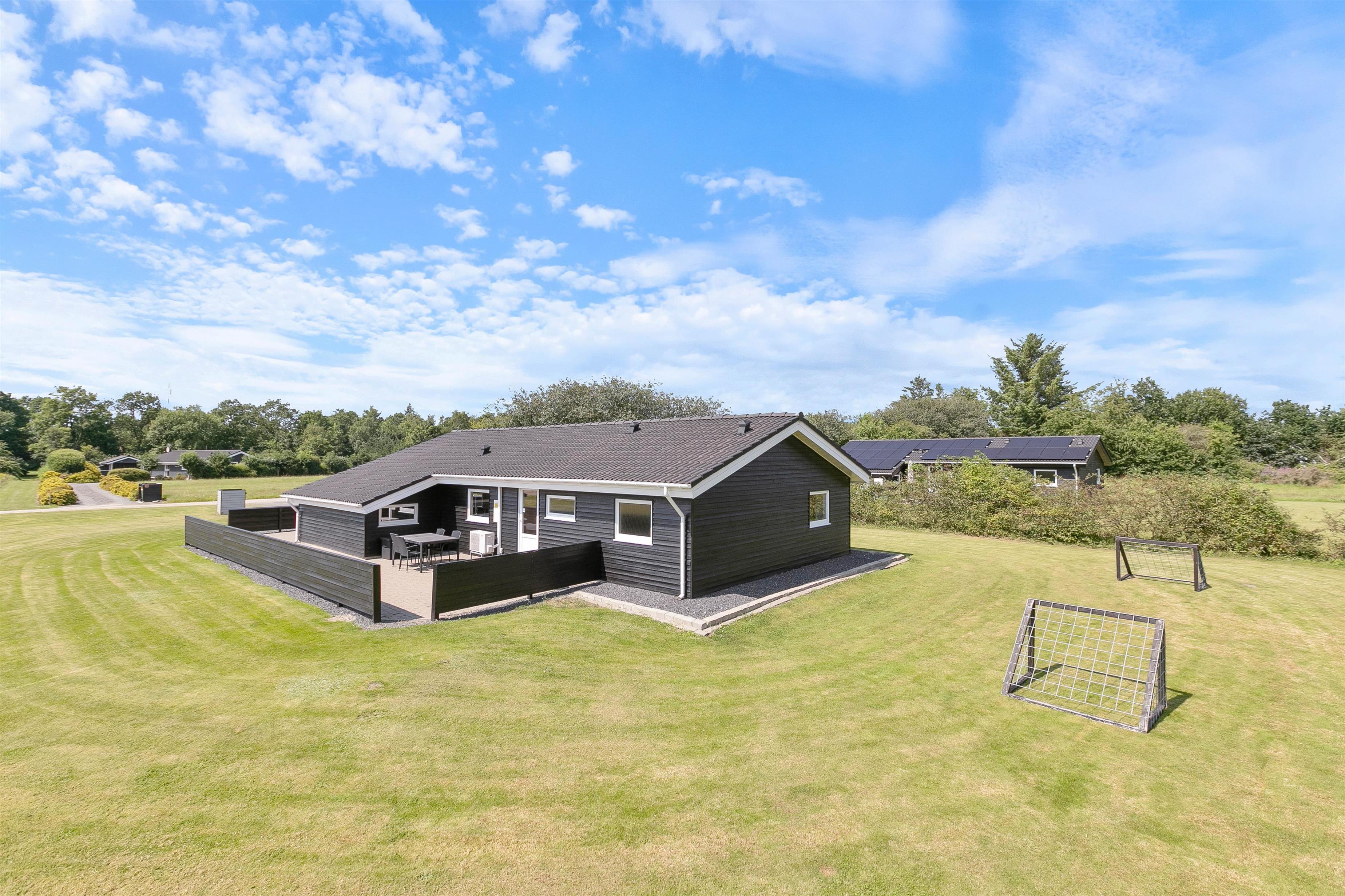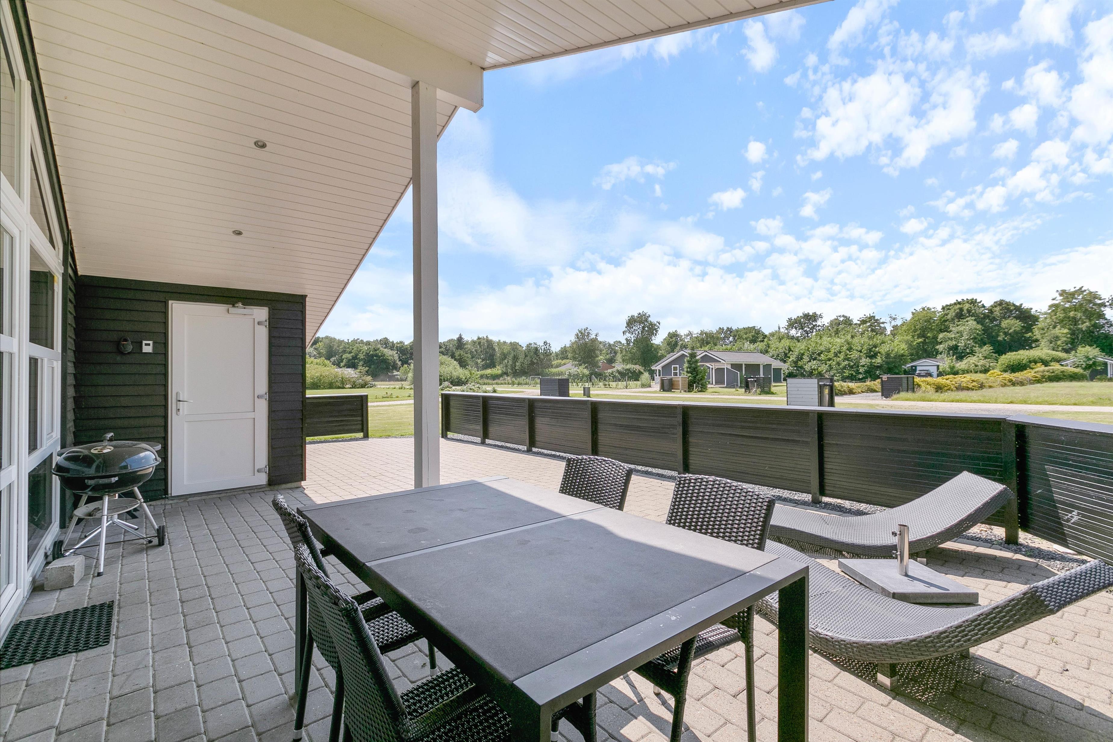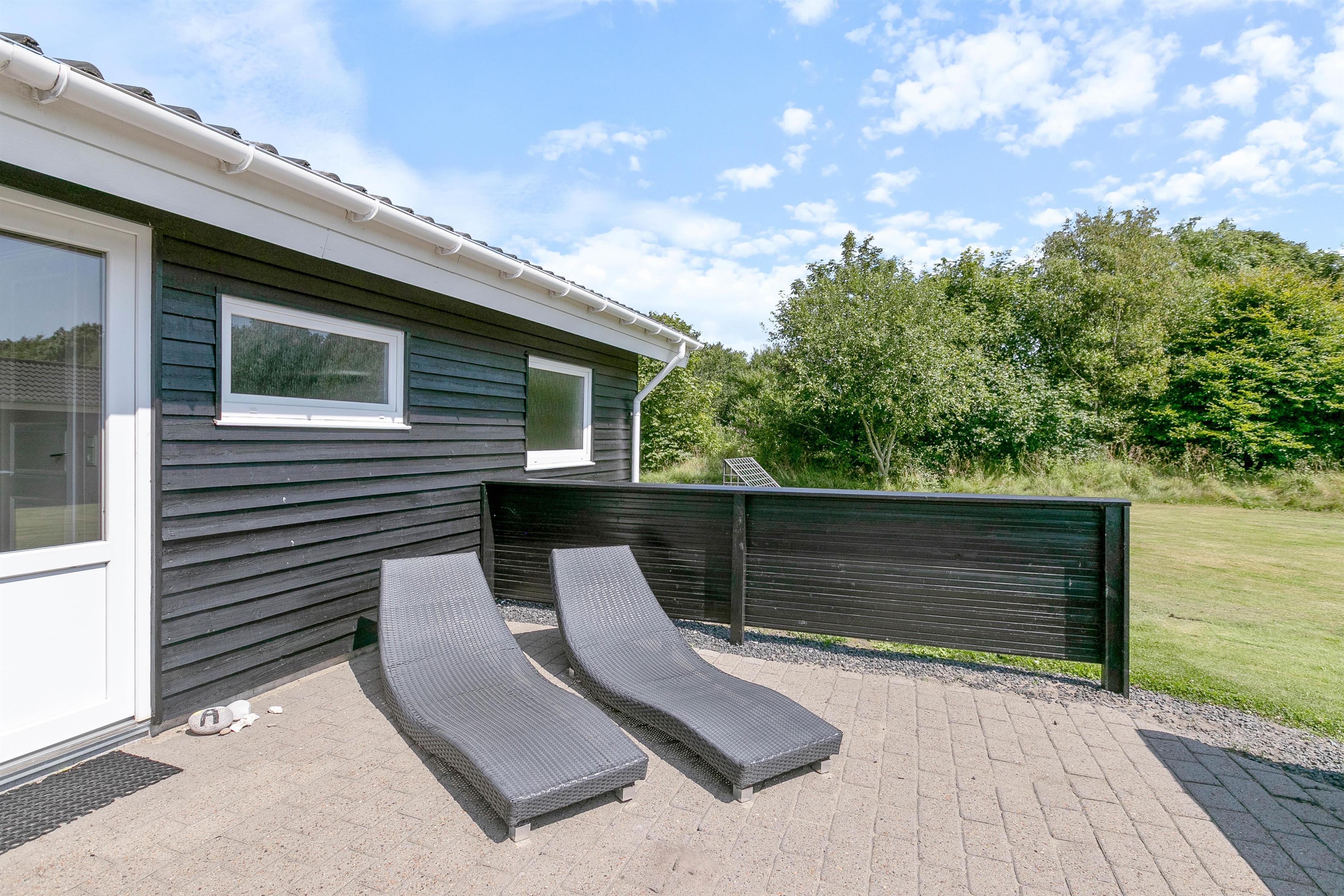 Når I træder ud på husets terrasse, træder I ud på en hyggelig terrasse, der er delvist overdækket. Terrassen byder på alt, hvad I behøver for en dejlig ferie, inklusive grill, behagelige havemøbler og solsenge. Den store plæne på 1602 kvadratmeter er ideel for både børn og kæledyr til at lege og boltre sig.
