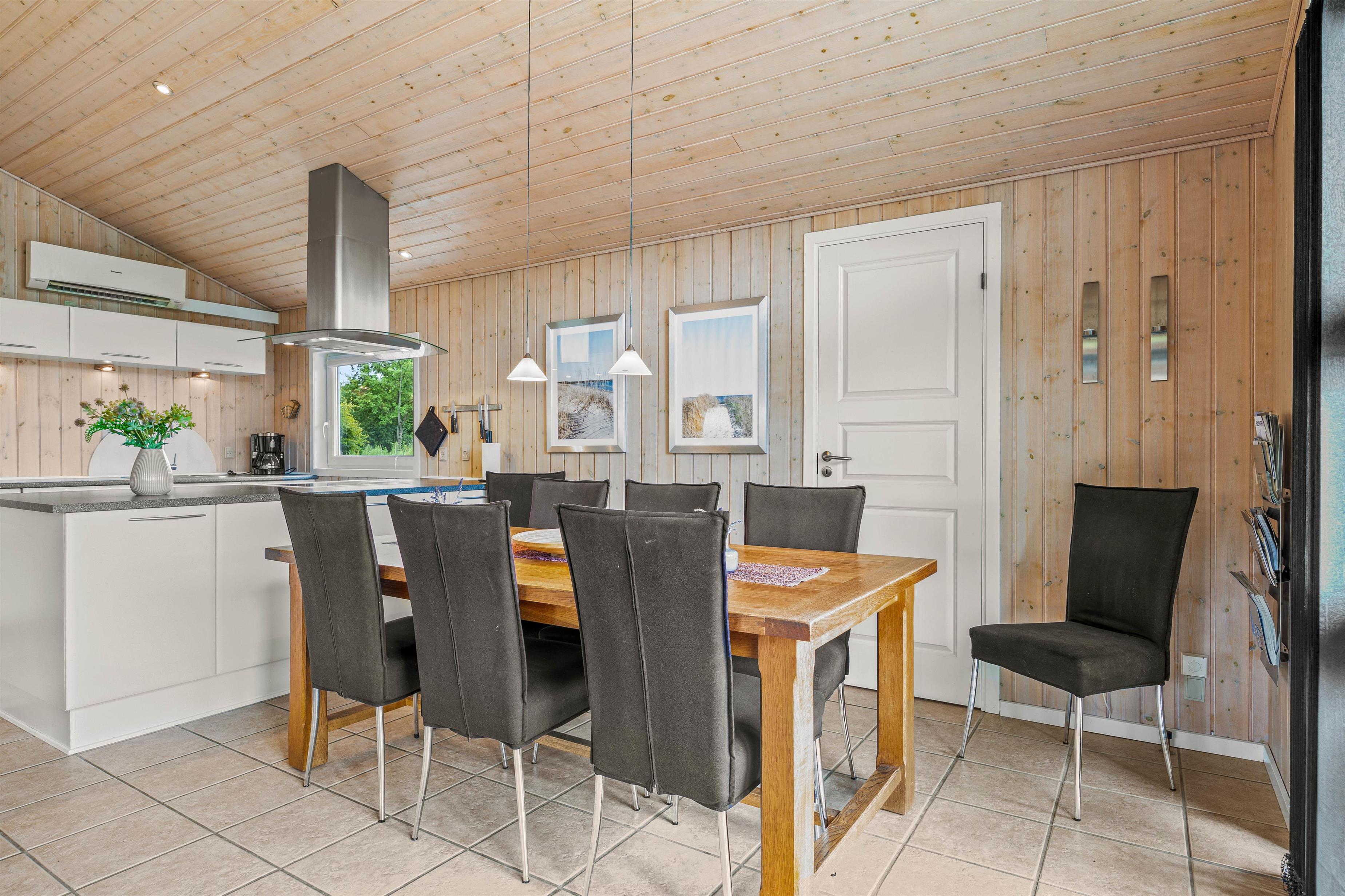 Indendørs byder huset på en lys og indbydende atmosfære med lyse træpaneler, der skaber en varm og behagelig stemning. Det åbne køkken er lavet til både praktisk madlavning og socialt samvær, med udsigt ud mod spisebordet, så I kan fortsætte med jeres brætspil, mens I tilbereder lækre måltider.