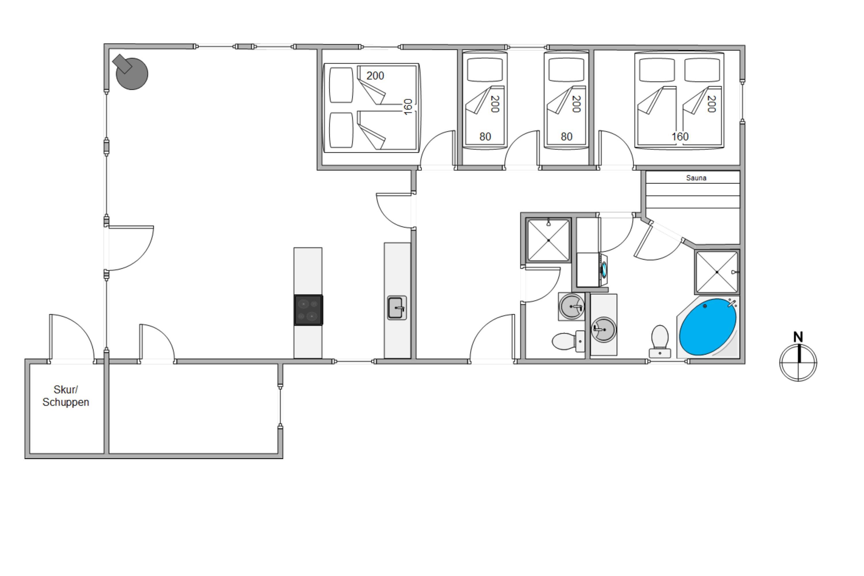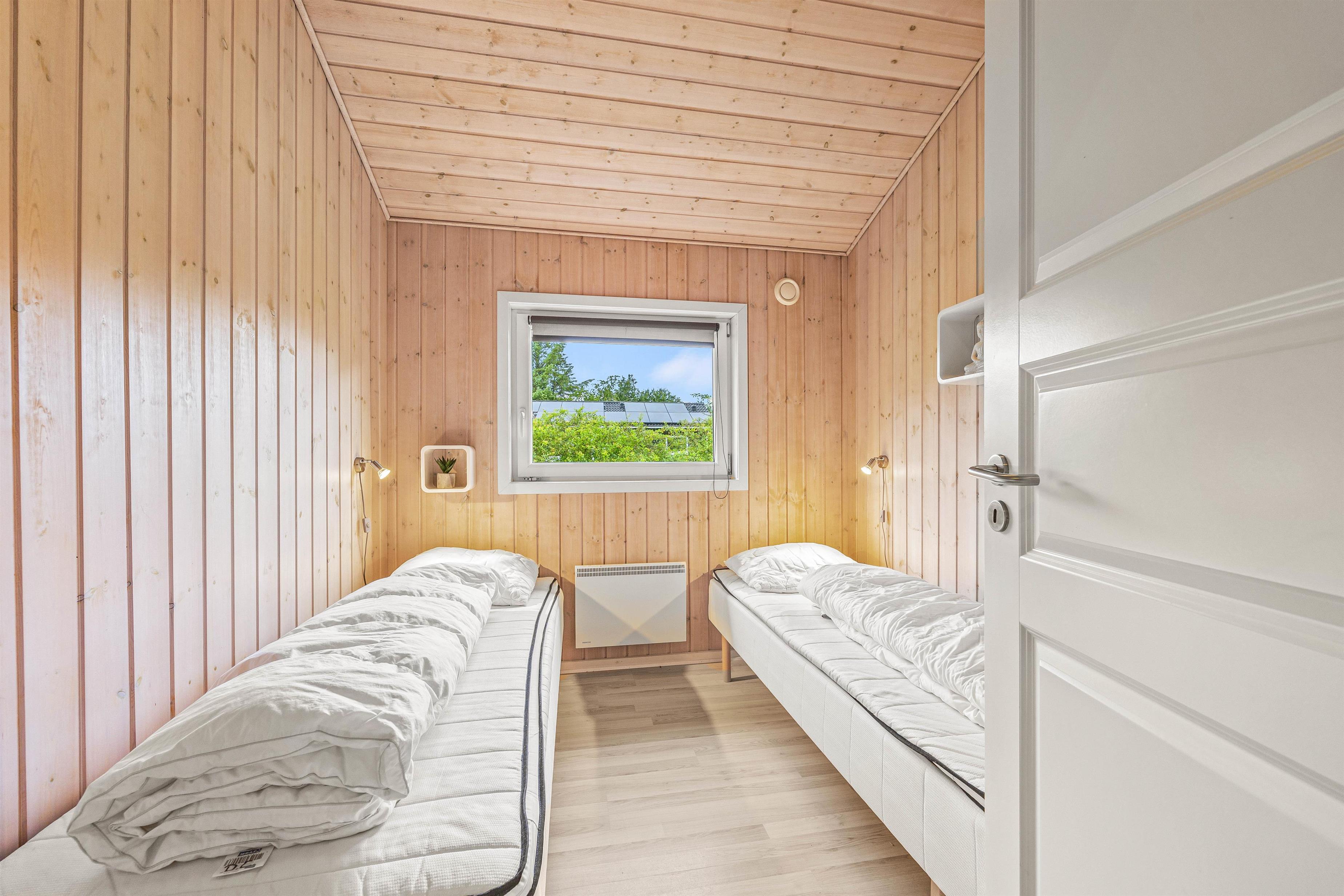 Sommerhuset har 2 soveværelser med dobbeltsenge og et tredje værelse med 2 enkeltsenge - er oplagt sted for børnene at have deres eget rum. Alle værelser er lyst indrettet, hvilket skaber en behagelig atmosfære.