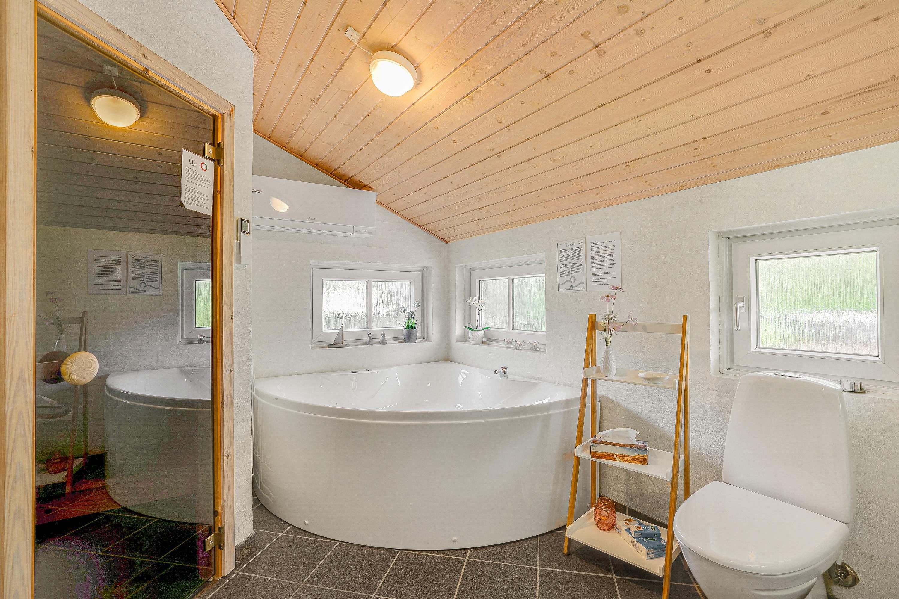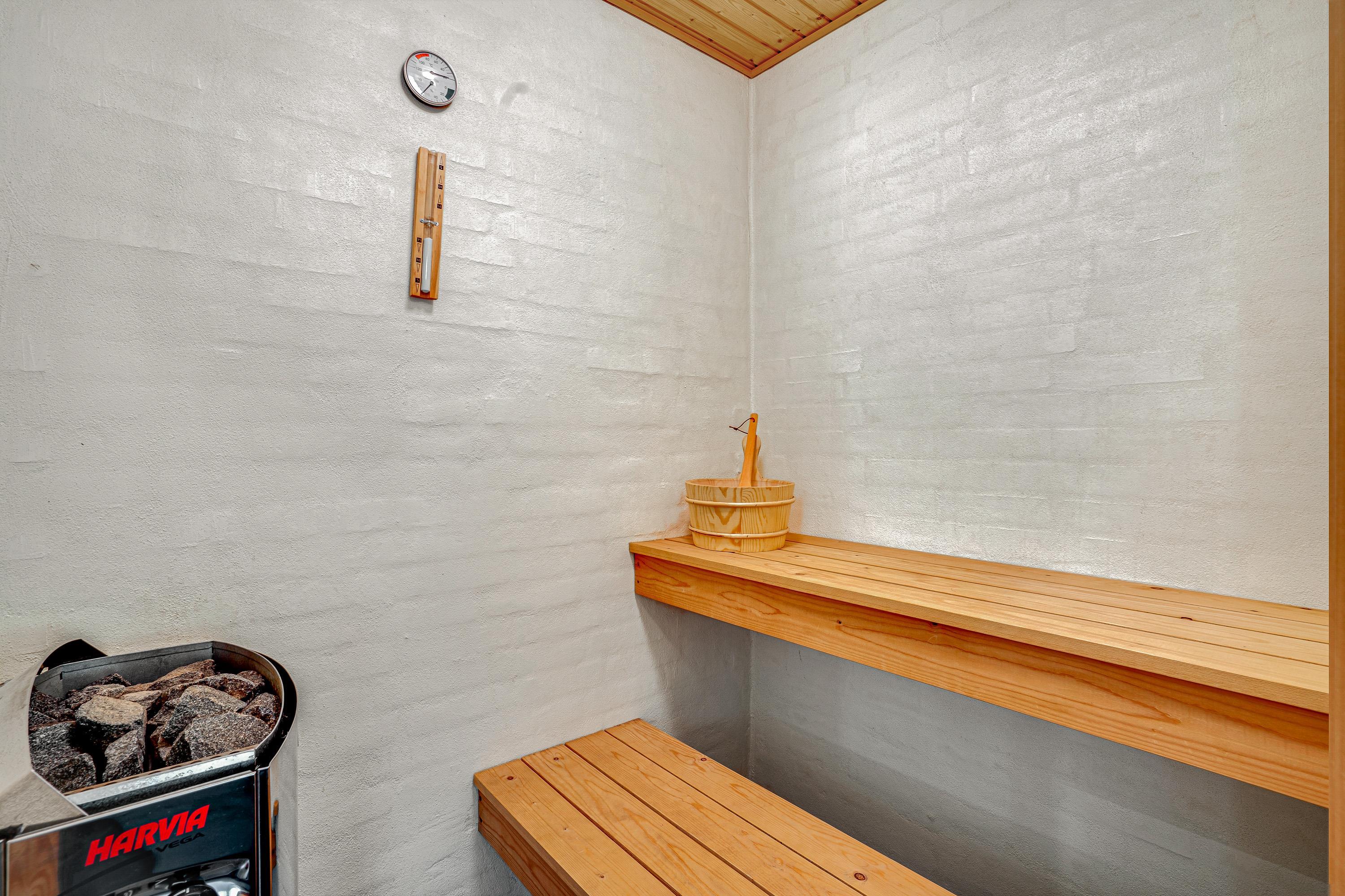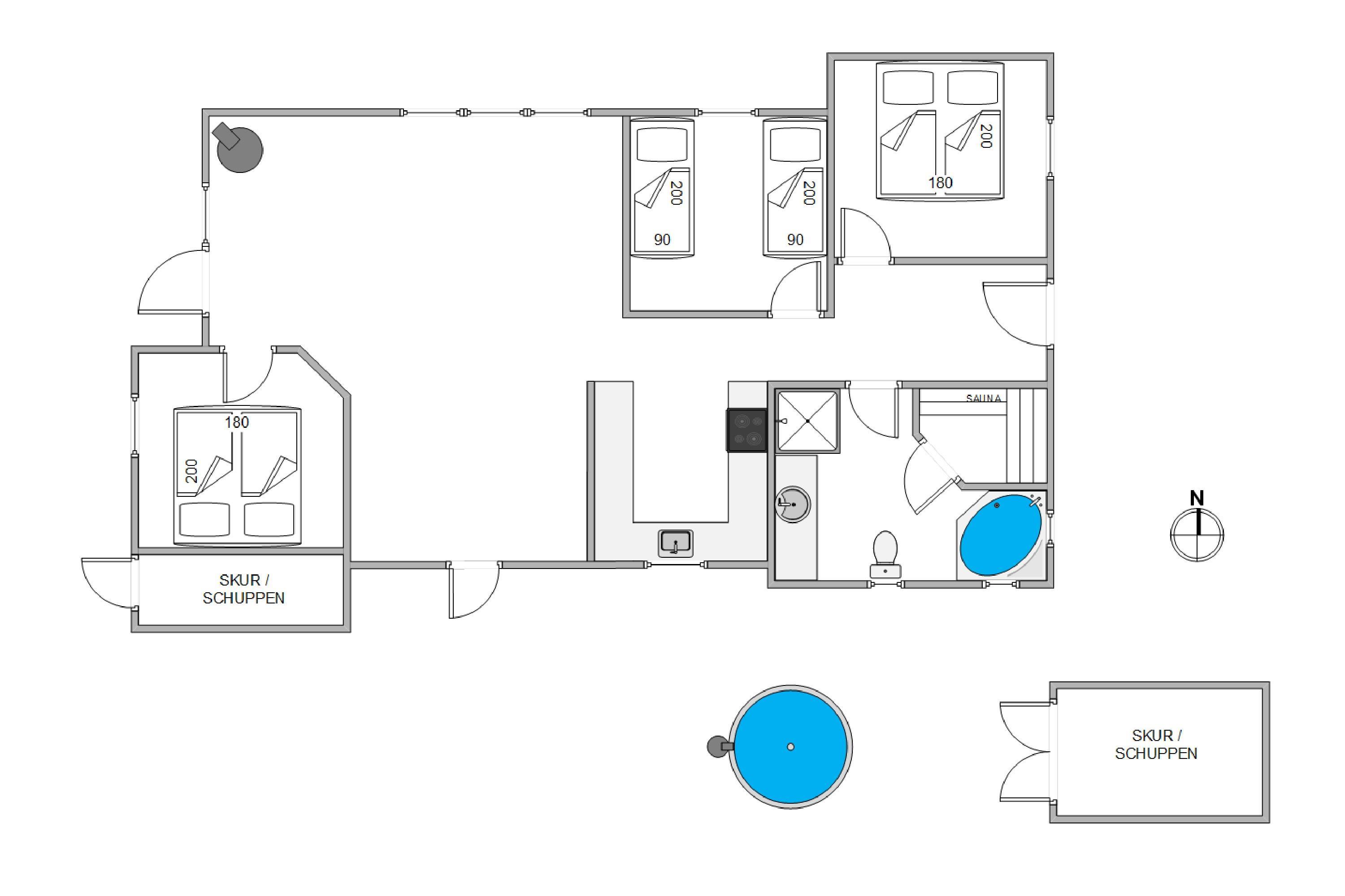 De 3 soveværelser i sommerhuset byder på komfort og ro. 2 af disse er indrettet med dobbeltsenge, hvor det sidste har 2 enkeltsenge, hvilket giver jer fleksibilitet og masser af plads til afslapning. Badeværelset er veludstyret med gulvvarme, tømmespa og en sauna, så I kan nyde ren afslapning og fornyet energi efter en dag fyldt med aktiviteter.