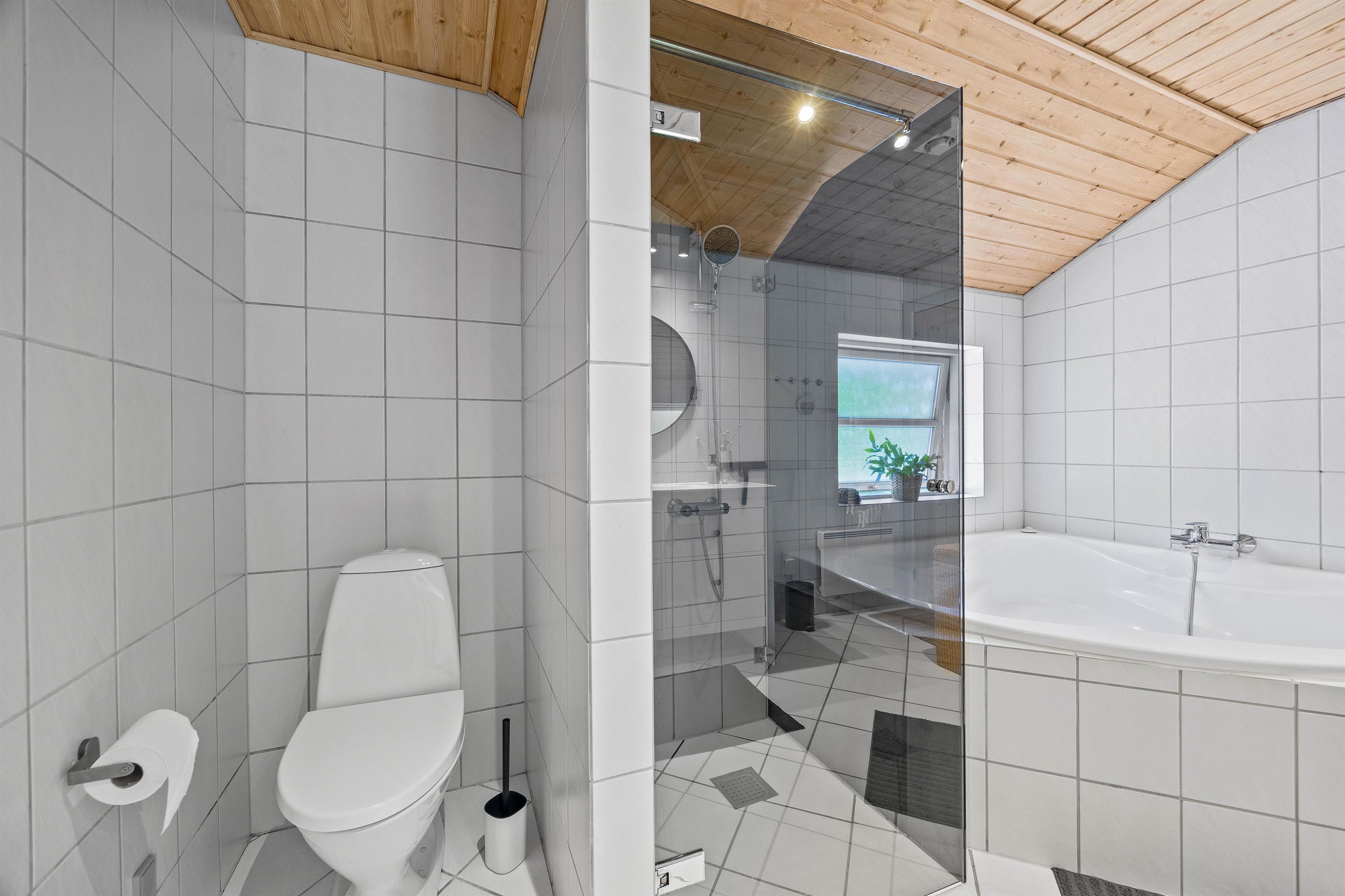 I sommerhuset er der ét badeværelse, som byder på både tømmespa og sauna, hvor I kan slappe af og nyde lidt luksus, efter en lang dag fyldt med intryk og oplevelser. Der er også et separat gæstetoilet for ekstra bekvemmelighed. Badeværelset indeholder en praktisk vaskesøjle med vaskemaskine og tørretumbler, så I kan holde styr på garderoben under hele ferien.