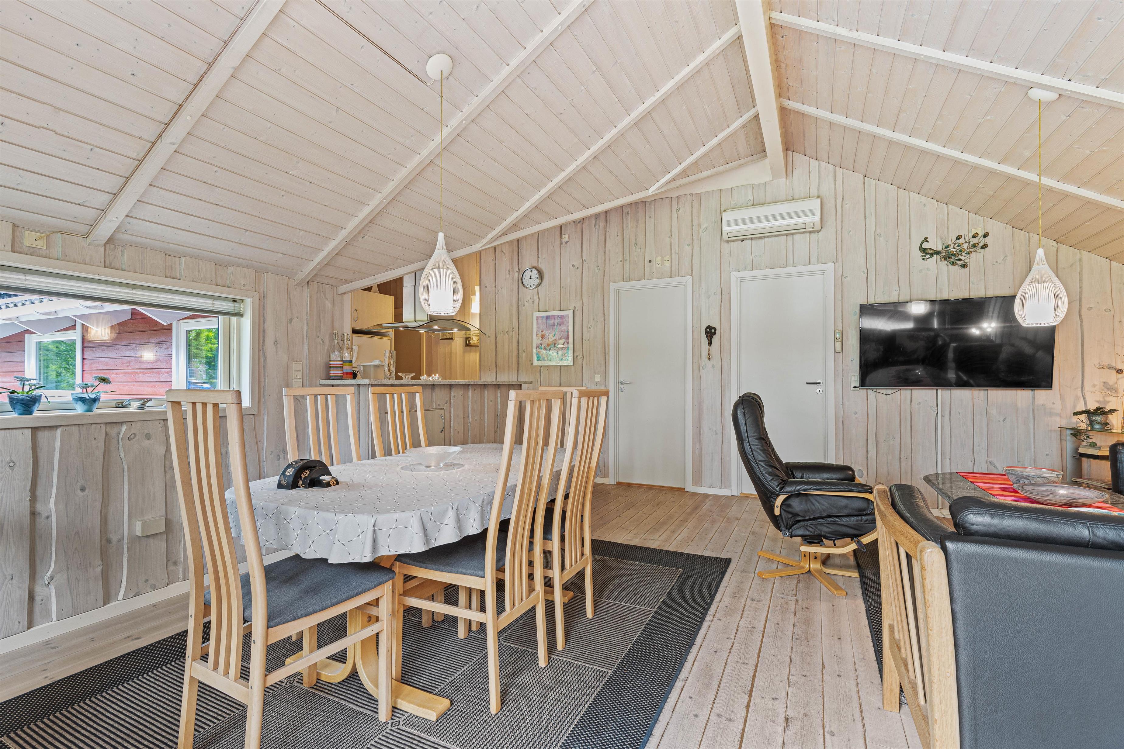 Det åbne køkken er udstyret med en opvaskemaskine, hvilket gør dit ophold behageligt og komfortabelt. Der er også en airfryer, hvilket gør madlavningen endnu nemmere.
