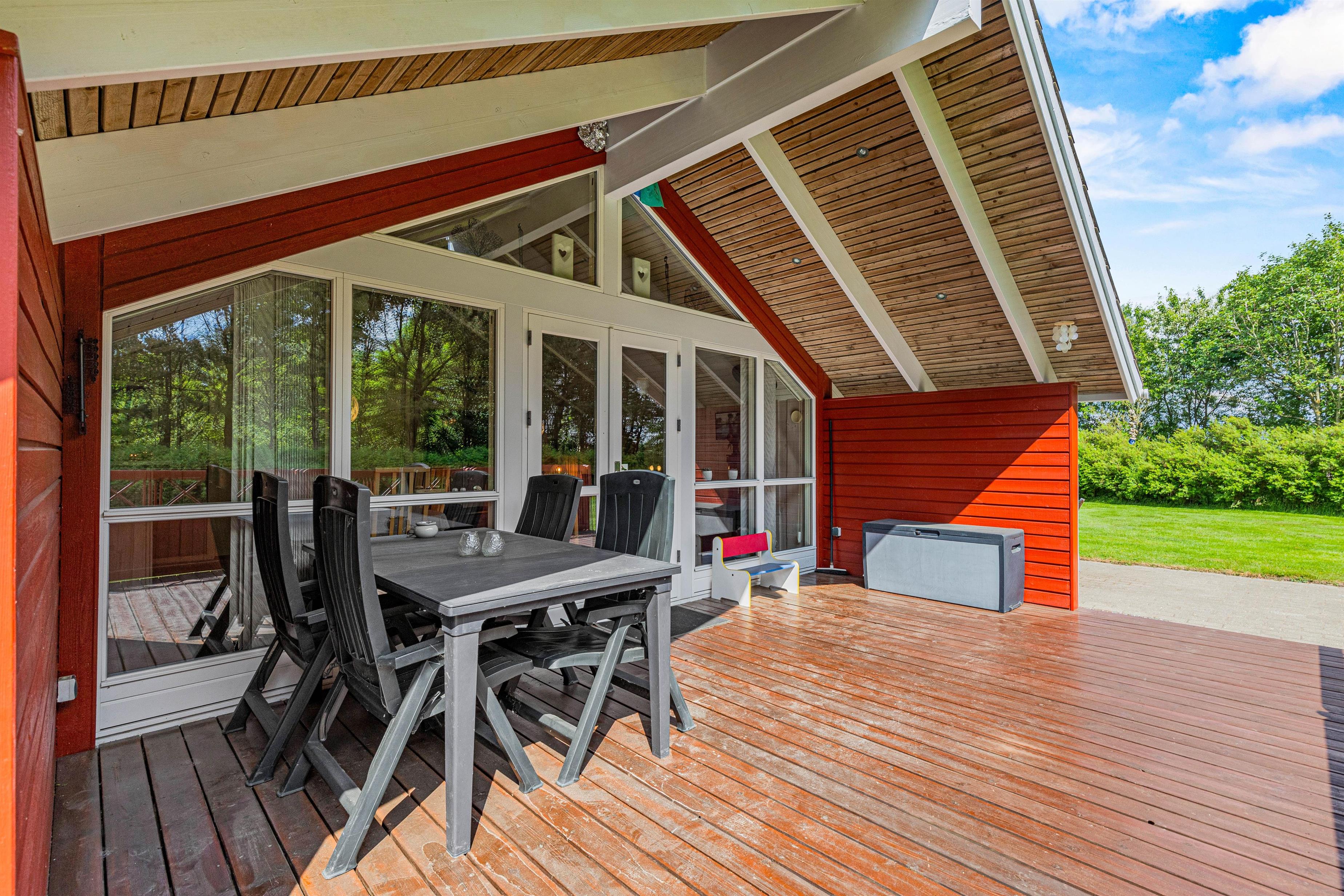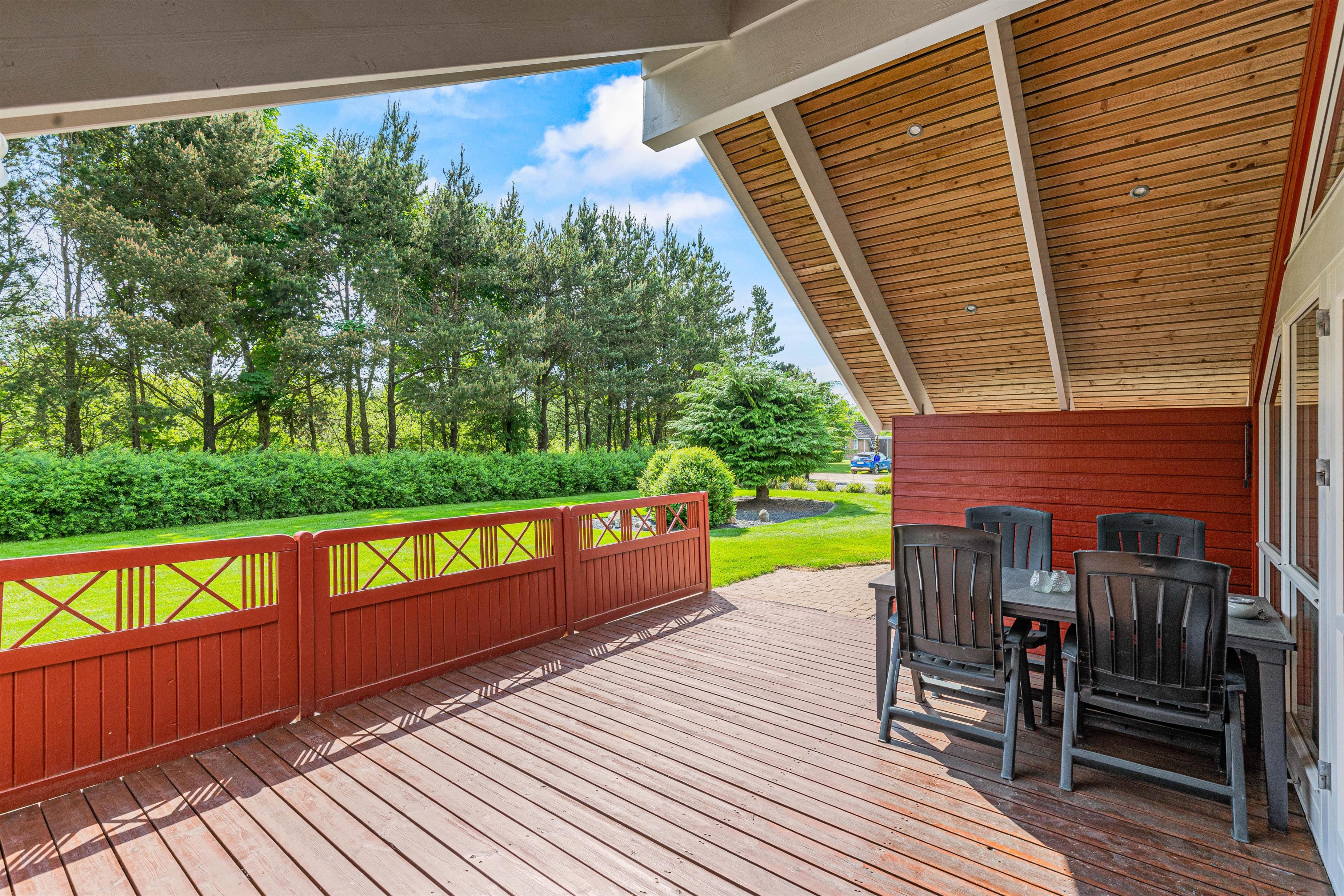 Fra terrassen har I en flot udsigt ud over området, og de fine omgivelser kan nydes selv i mindre godt vejr, da terrassen er delvist overdækket.
