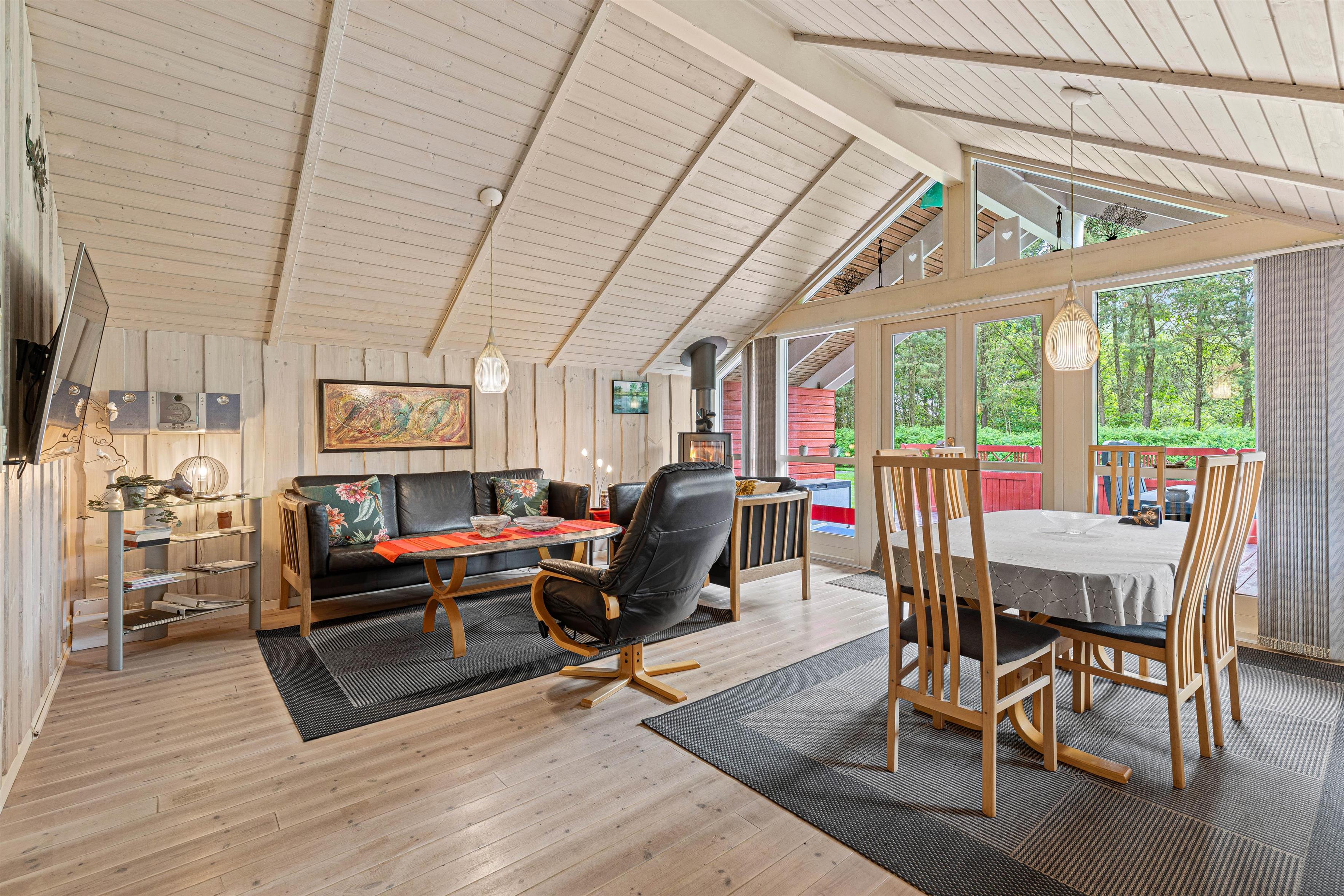 På Rønnebærvangen 14 er der sørget for ægte feriehygge hele året rundt. På de kølige dage kan I tænde op i brændeovnen og lade den varme spisestuen op, mens I sætter jer godt til rette i sofaen med en god bog eller et spil kort. I både køkkenet og gangen er der gulvvarme, så I holder fødderne lune. Hvad mere har man brug for?