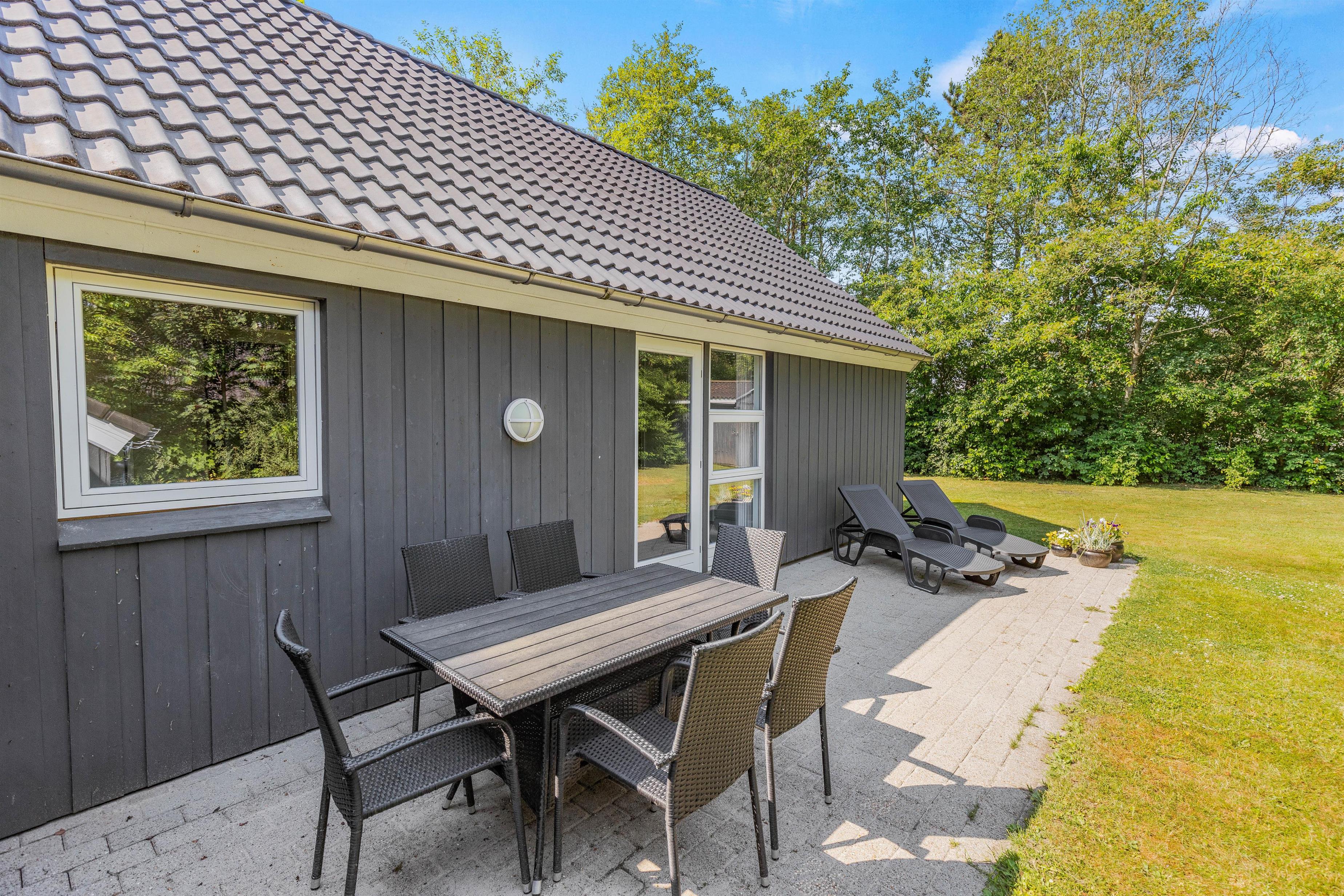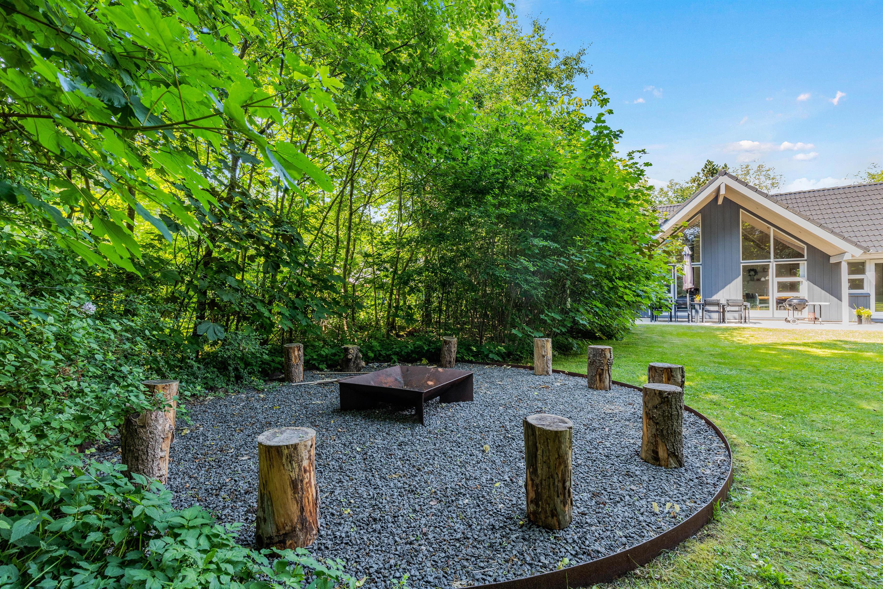 Det afskærmede og overdækkede terrasseområde er perfekt til at nyde måltider i det fri, uanset vejret. Her kan I samle jer omkring grillen og tilberede lækre retter, mens I nyder den fredelige atmosfære og fuglesang fra de omkringliggende træer. Terrassen fungerer som et perfekt sted til både frokost i solen og hyggelige aftener under de stjerneklare himmelstræk.