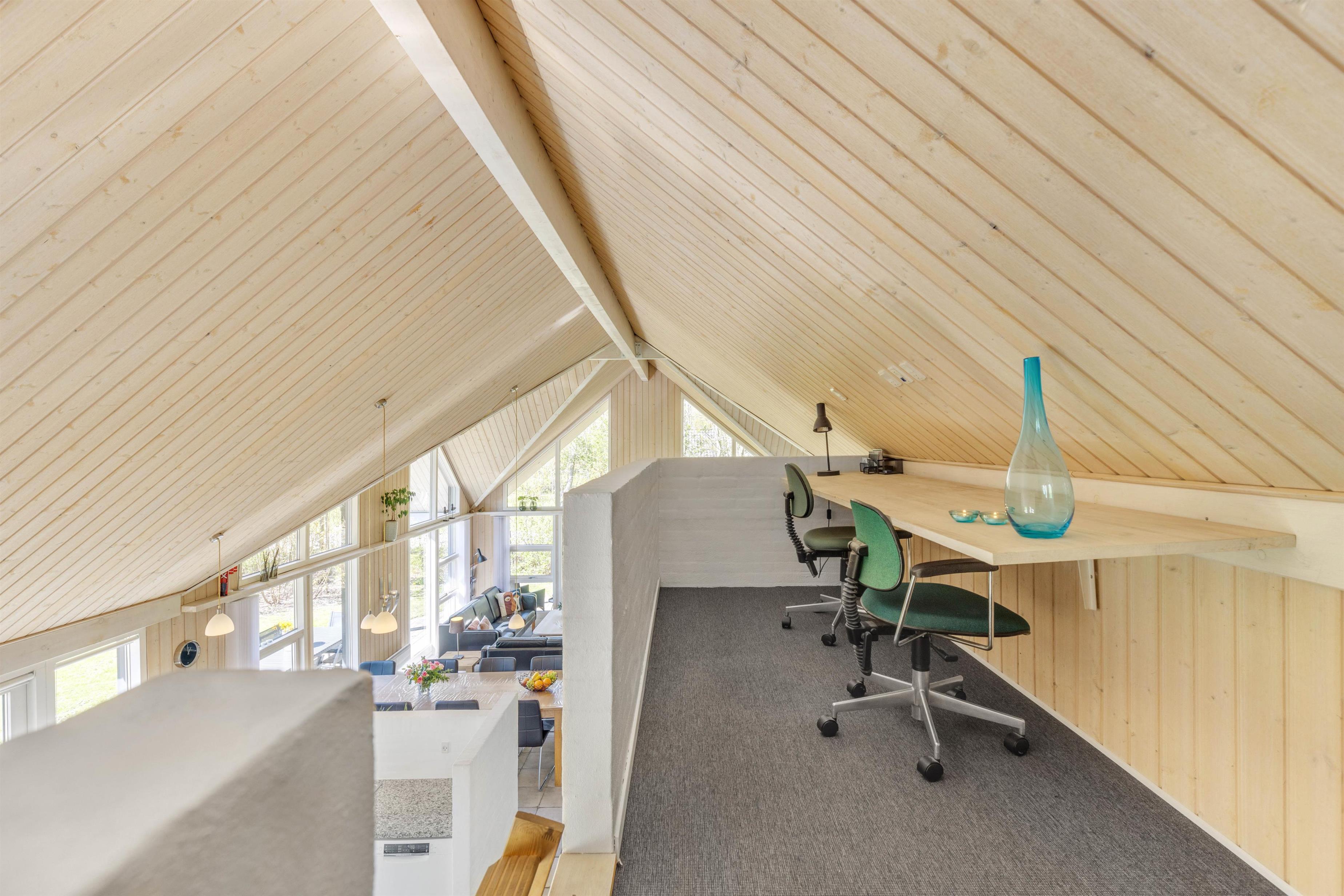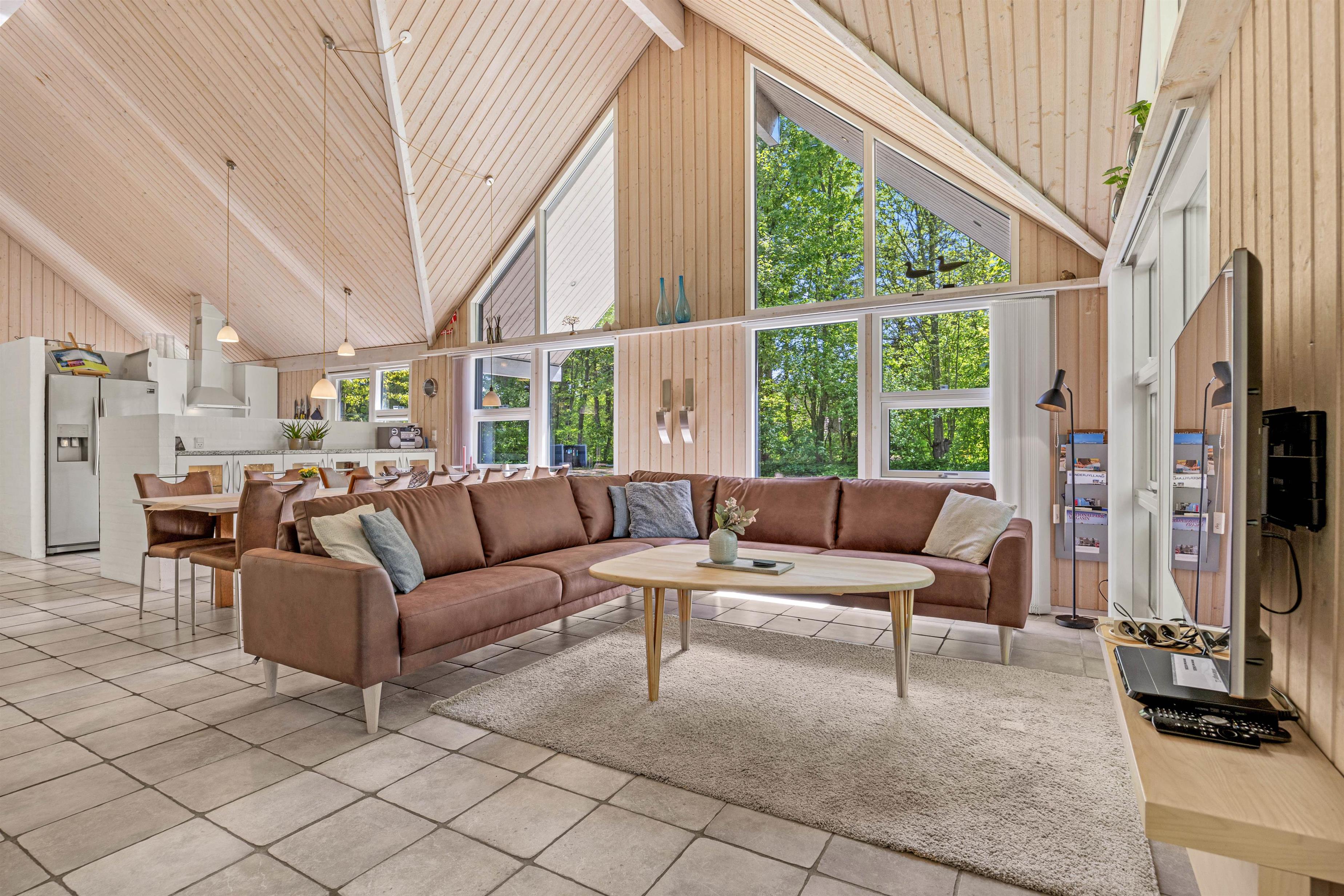 Opholdsrummene er nøje indrettet for at sikre både fredfyldte stunder ved den knitrende brændeovn og livligt samvær i det åbne og lyse fællesareal. Store vinduer slipper et blødt lys ind, der smukt falder over køkkenet, spisestuen og stuen, der glider sammen i en elegant symbiose, med lækre møbler og bordtennis.
