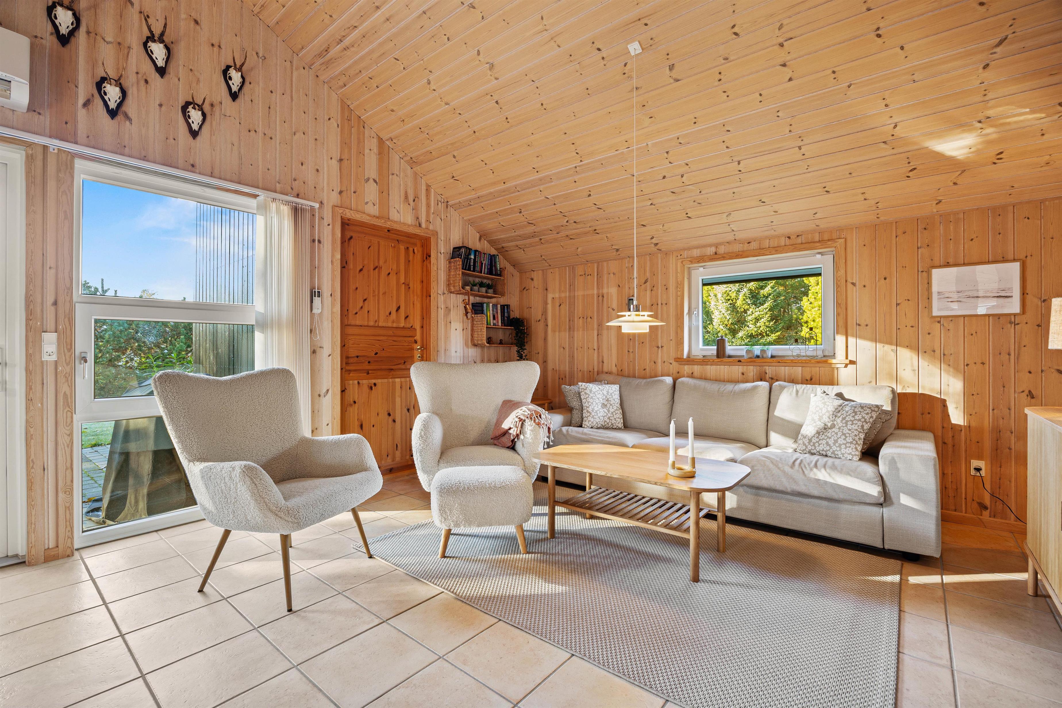 Indenfor byder ferieboligen på en smagfuldt indrettet stue med komfortable møbler. Foran fjernsynet kan I nyde afslappende timer på sofaen med en god film, mens brændeovnen skaber den perfekte stemning til hyggelige aftener. Den energibesparende varmepumpe sørger for et behageligt indeklima, uanset årstiden.