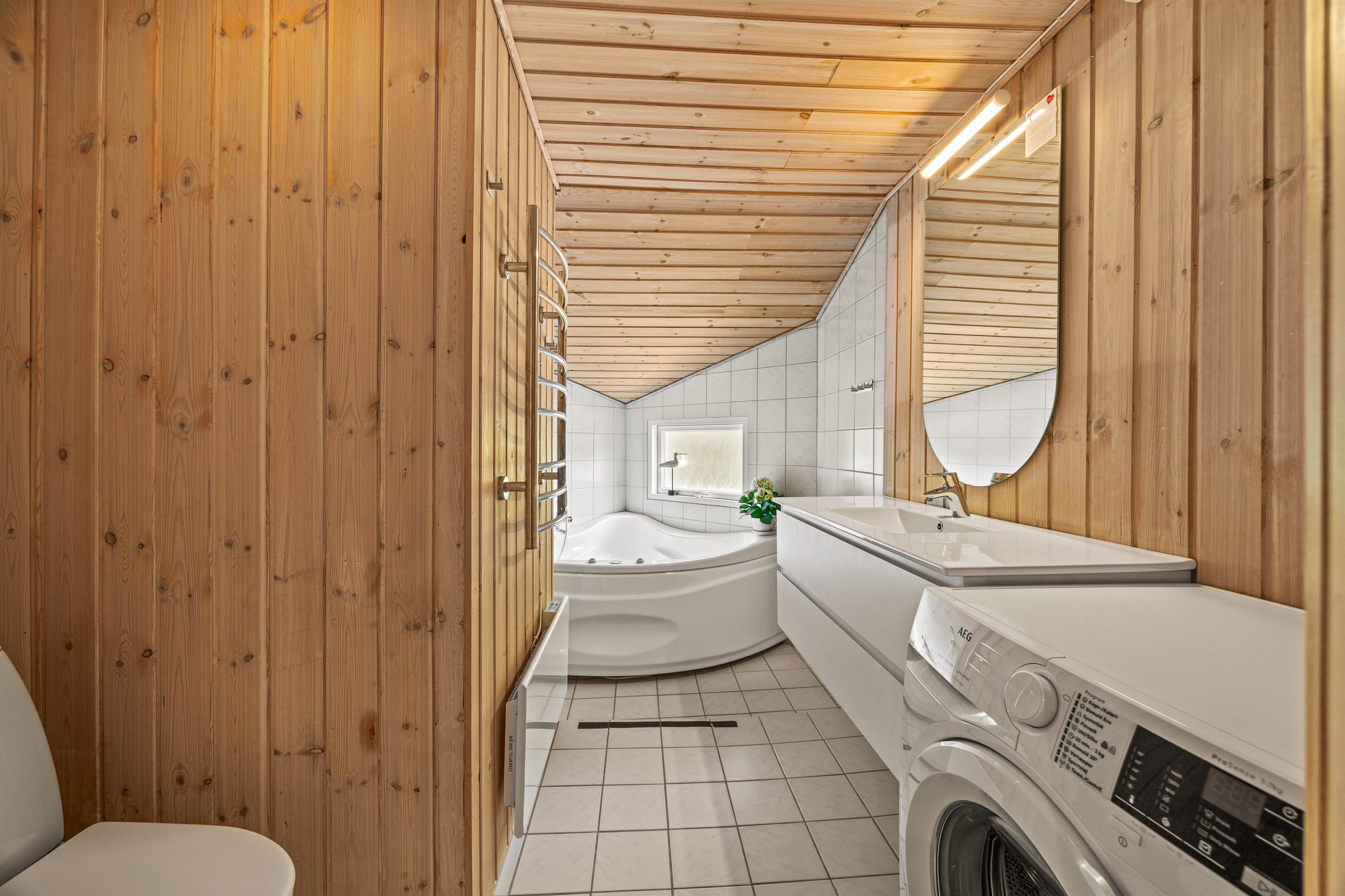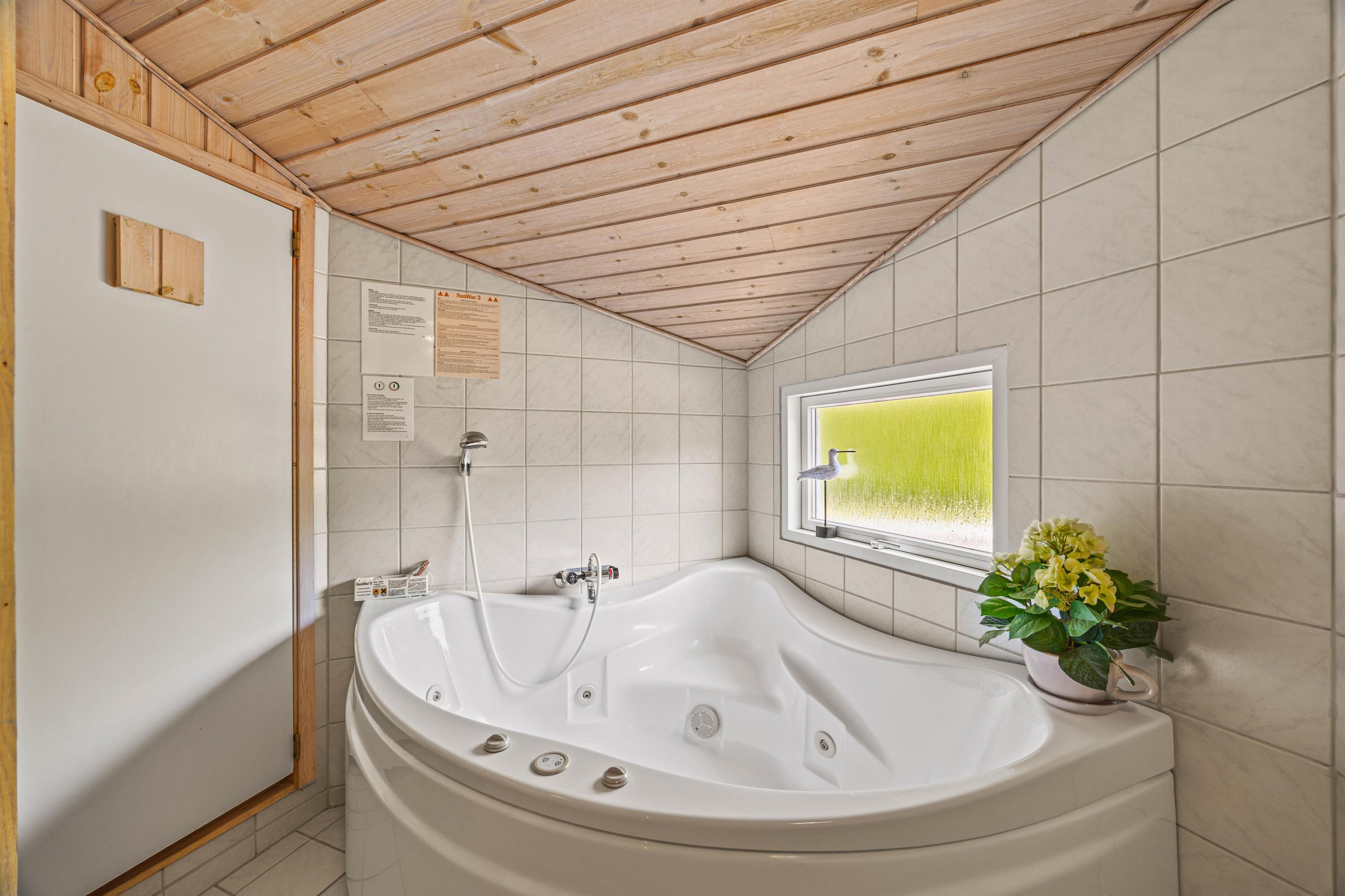 På sommerhusets badeværelse venter jer nemlig et lille wellnessområde, hvor I virkelig kan få slappet af. I spabadet kan I læne jer tilbage i det dejlige, varme og boblende vand og slappe helt af. Efterfølgende kan I sætte jer ind i den varme sauna, der også byder på masser af afslapning.