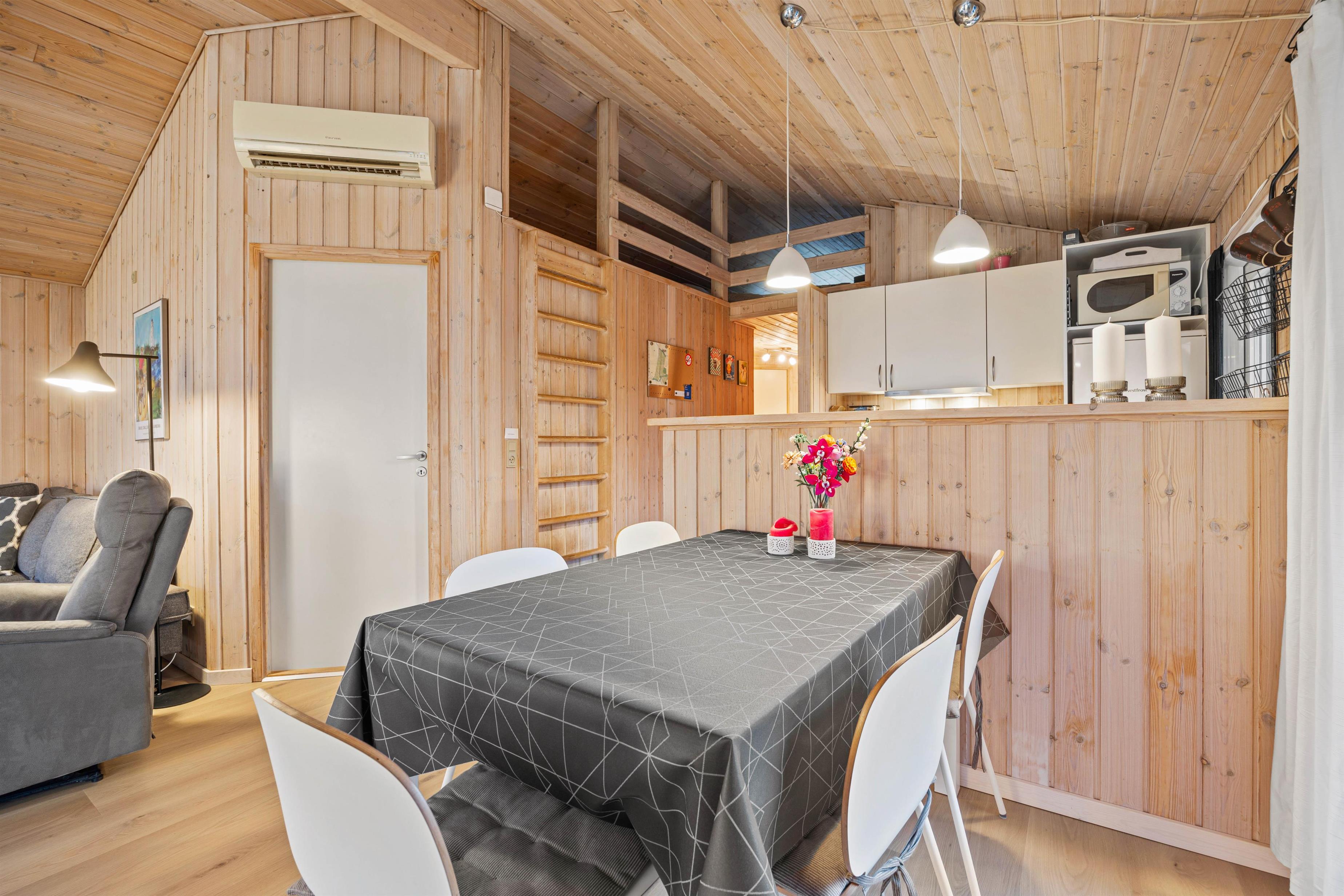 I sommerhusets opholdsrum kan I samles til hyggelige feriestunder for hele familien. Her kan I blandt andet være sammen om madlavningen eller se en god film i tv’et - I kan streame jeres yndlingsfilm takket være Chromecasten. I opholdsrummet sørger brændeovnen for at sætte prikken over i’et for den hyggelige feriestemning.