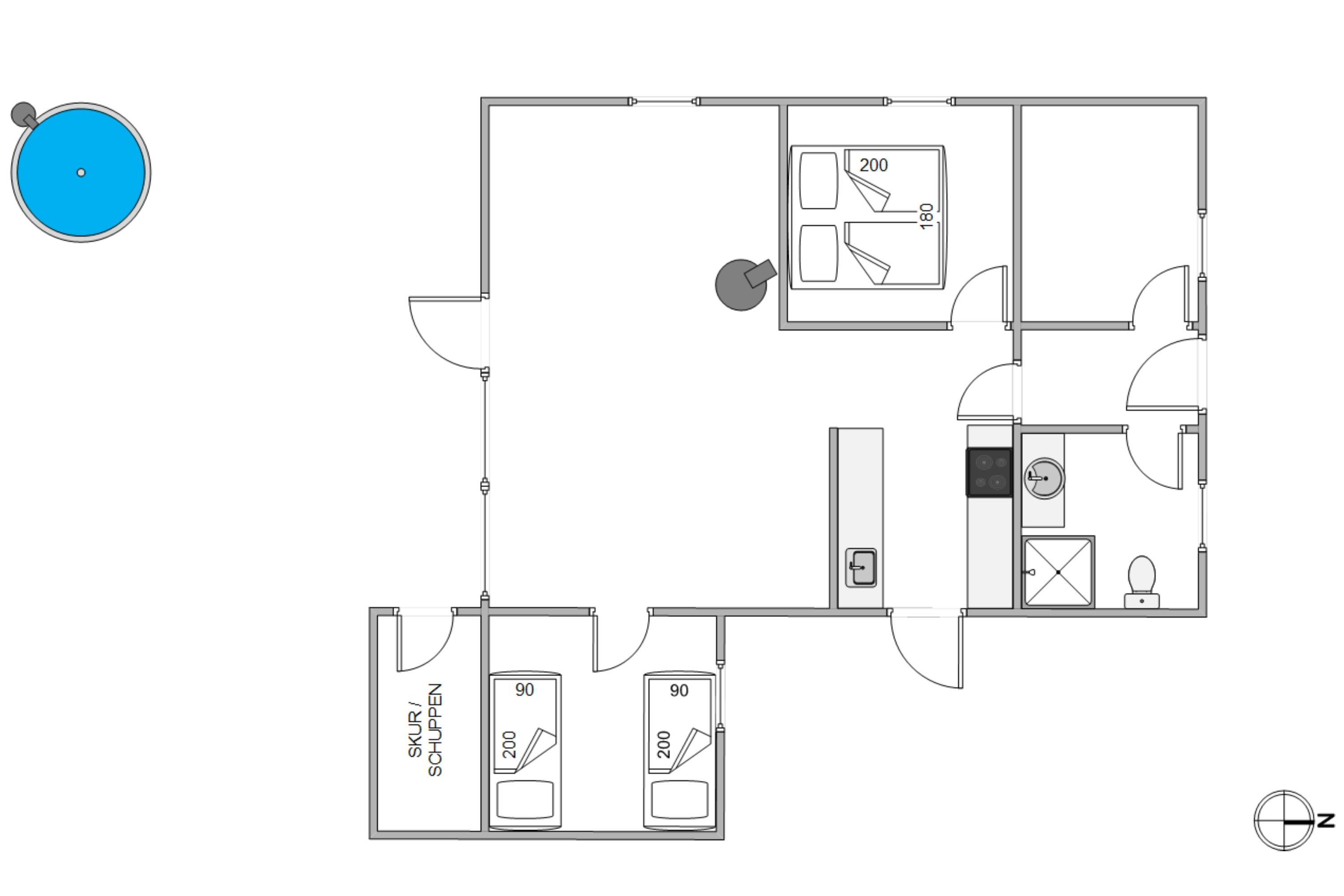 Sommerhuset har 2 soveværelser, hvor det ene har en dobbeltseng og det andet har to enkeltsenge. Udover de to soveværelser har sommerhuset et ekstra soveværelse hvor der er en udtræksseng, der kan være perfekt som legeområde for børn eller til ekstra opbevaring.