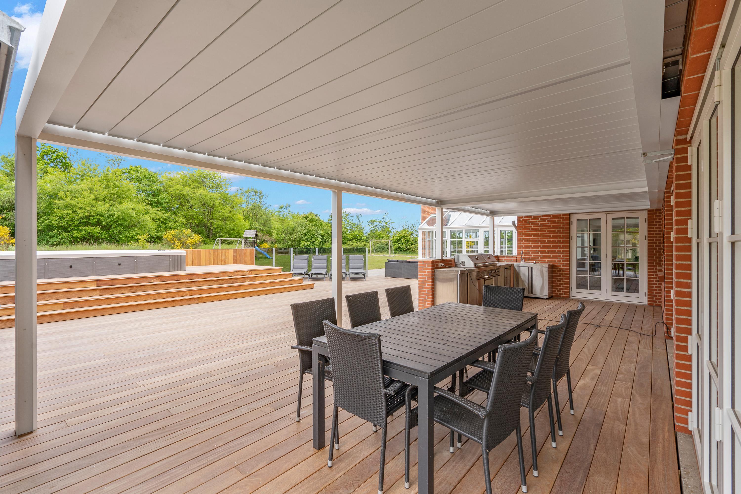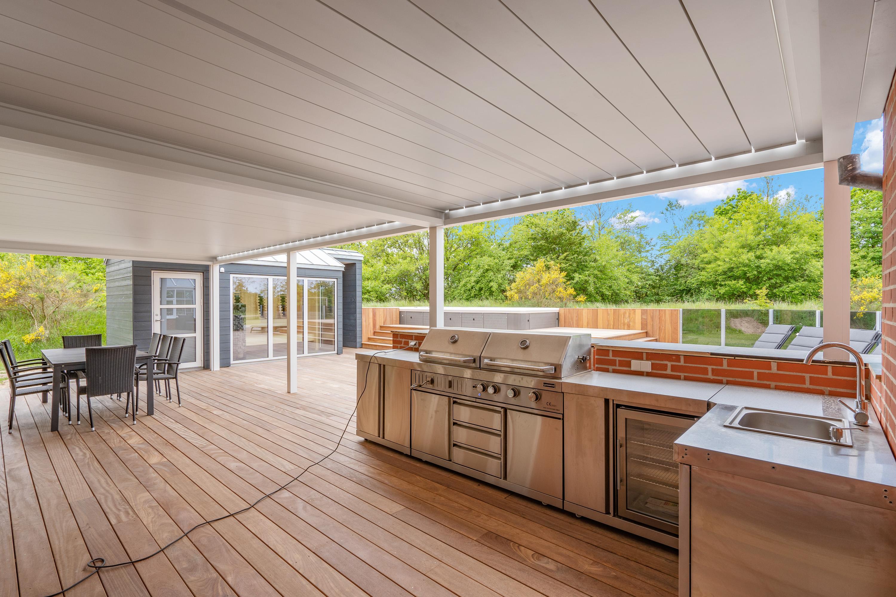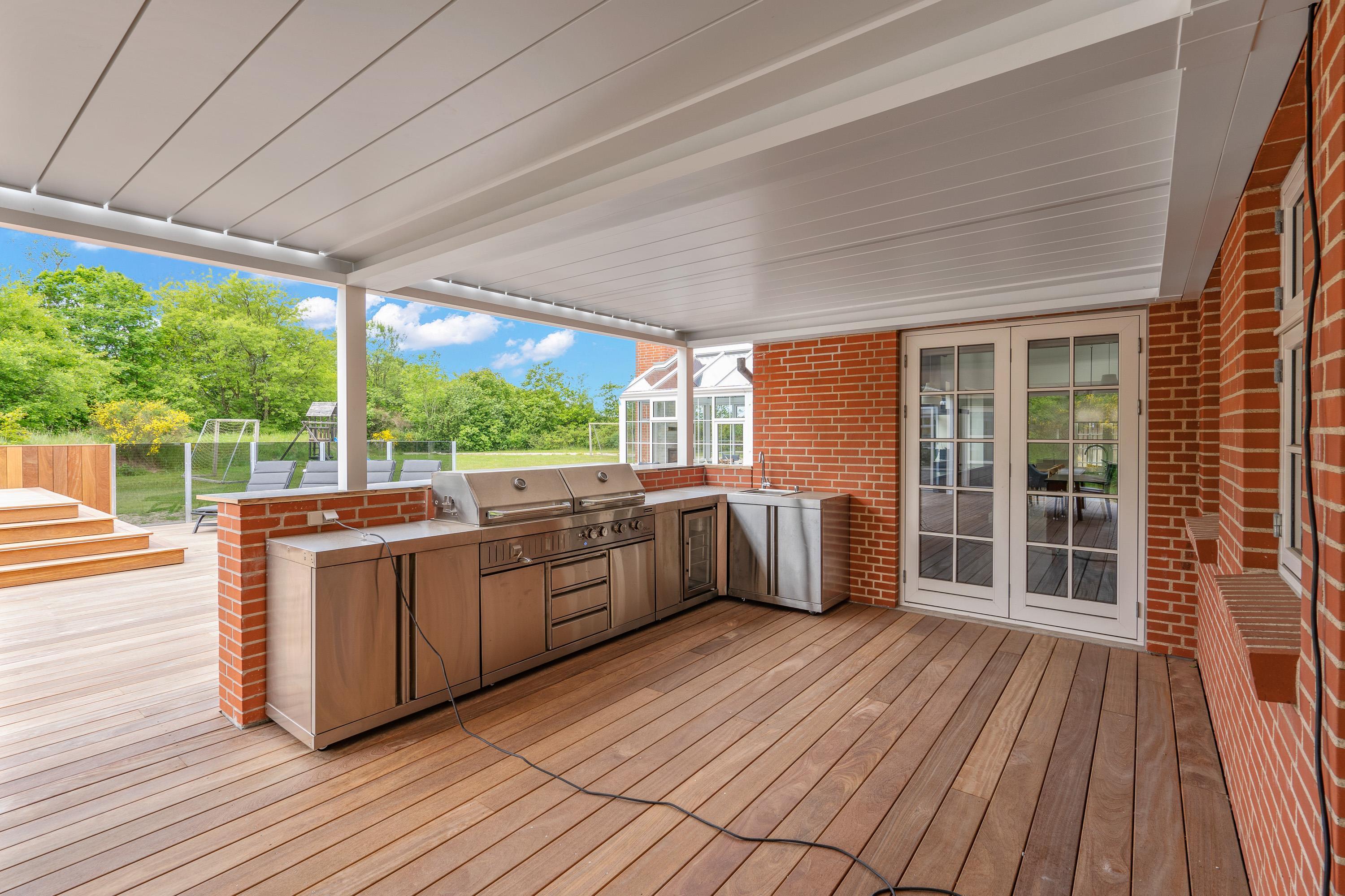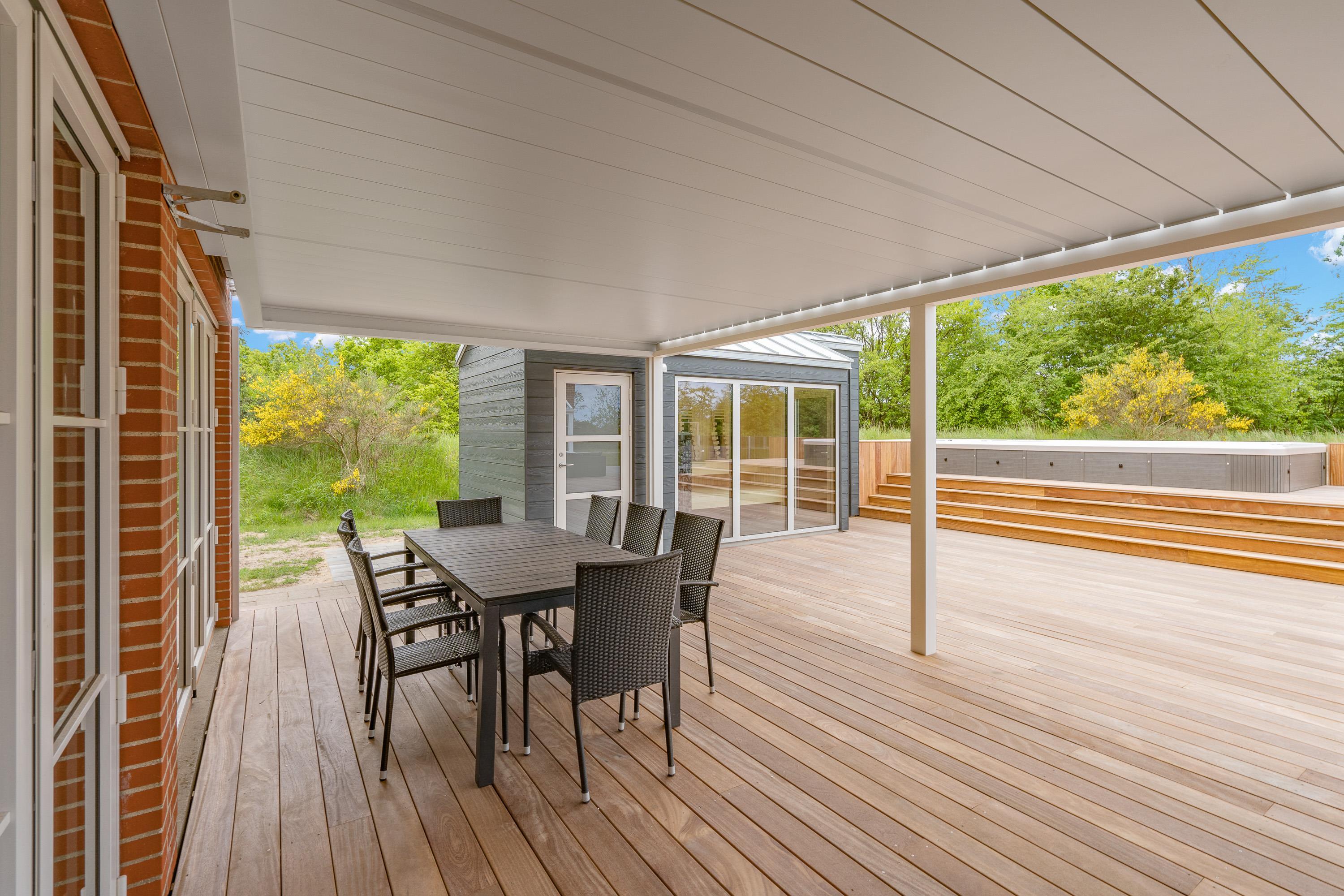 I haven er der både rutsjebane og en stor gynge til børnene, der ikke ligger langt fra sommerhusets store terrasse på hele 80 kvadratmeter, hvor en del også er overdækket. Her kan I tilberede lækre feriemåltider på gas- eller trækulgrillen og slappe af i ferieboligens havemøbler. I finder også et lækkert udekøkken, som er delvist overdækket og afskærmet. Når det bliver køligt, kan I tænde op i den udendørs pejs og nyde varmen under åben himmel.