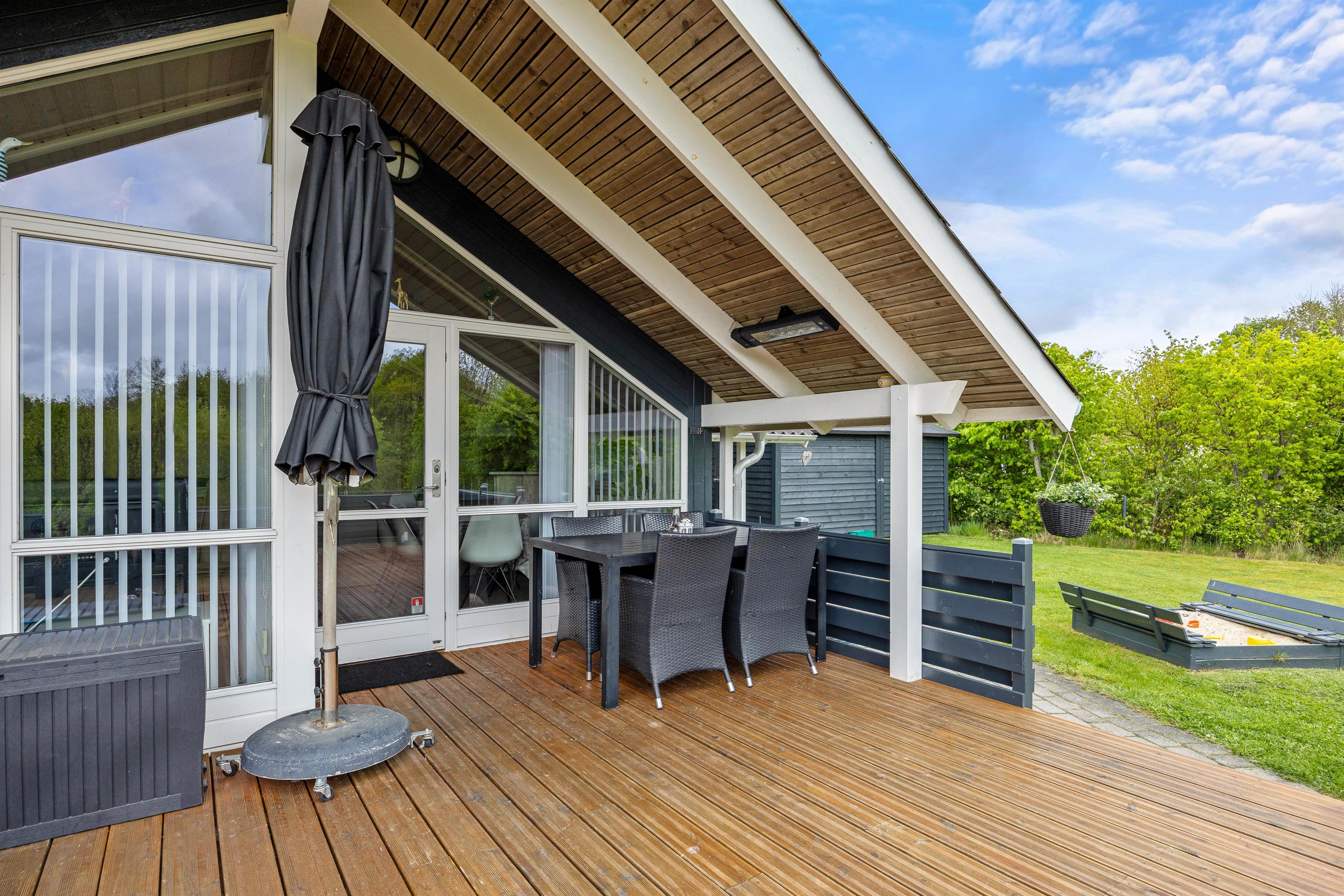 Terrassen har plankeværk hele vejen rundt, så også her kan I nemt holde jeres firbenede venner. En del af den store terrasse er overdækket, så I også kan sidde ude, selvom det skulle dryppe lidt, eller hvis I blot foretrækker skyggen på de solrige dage. På terrassen kan I afslutte enhver perfekt feriedag med at grille de lækreste måltider og nyde dem med et velsmagende glas vin til.