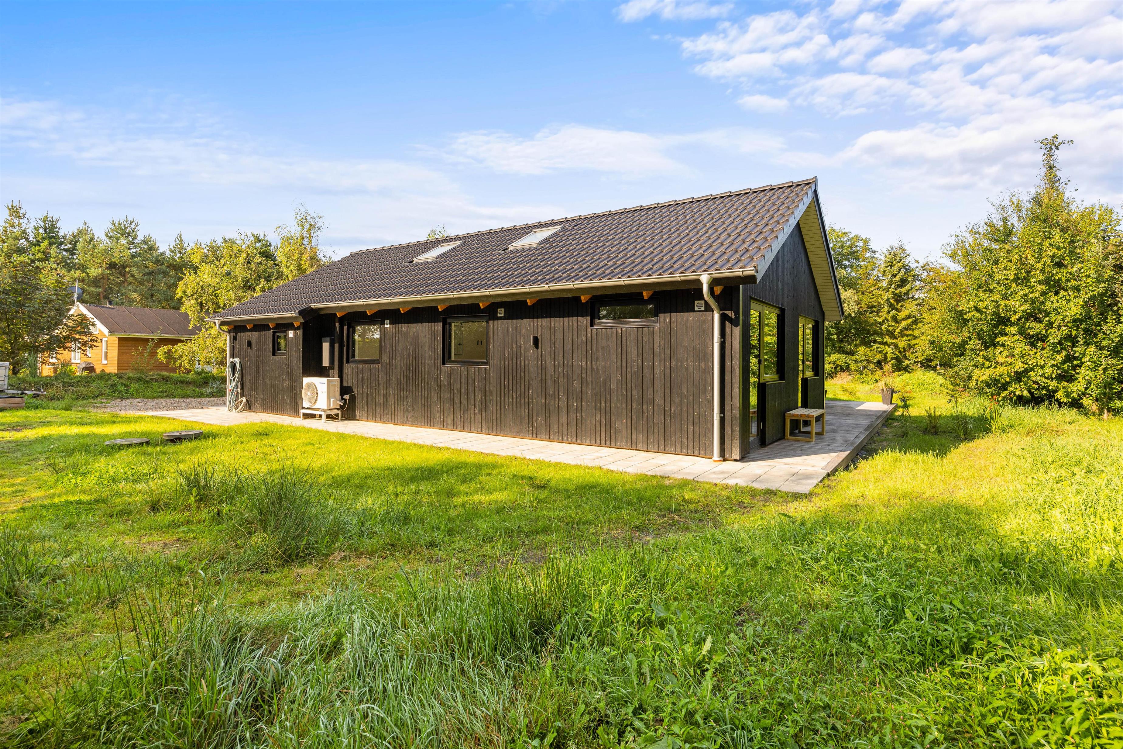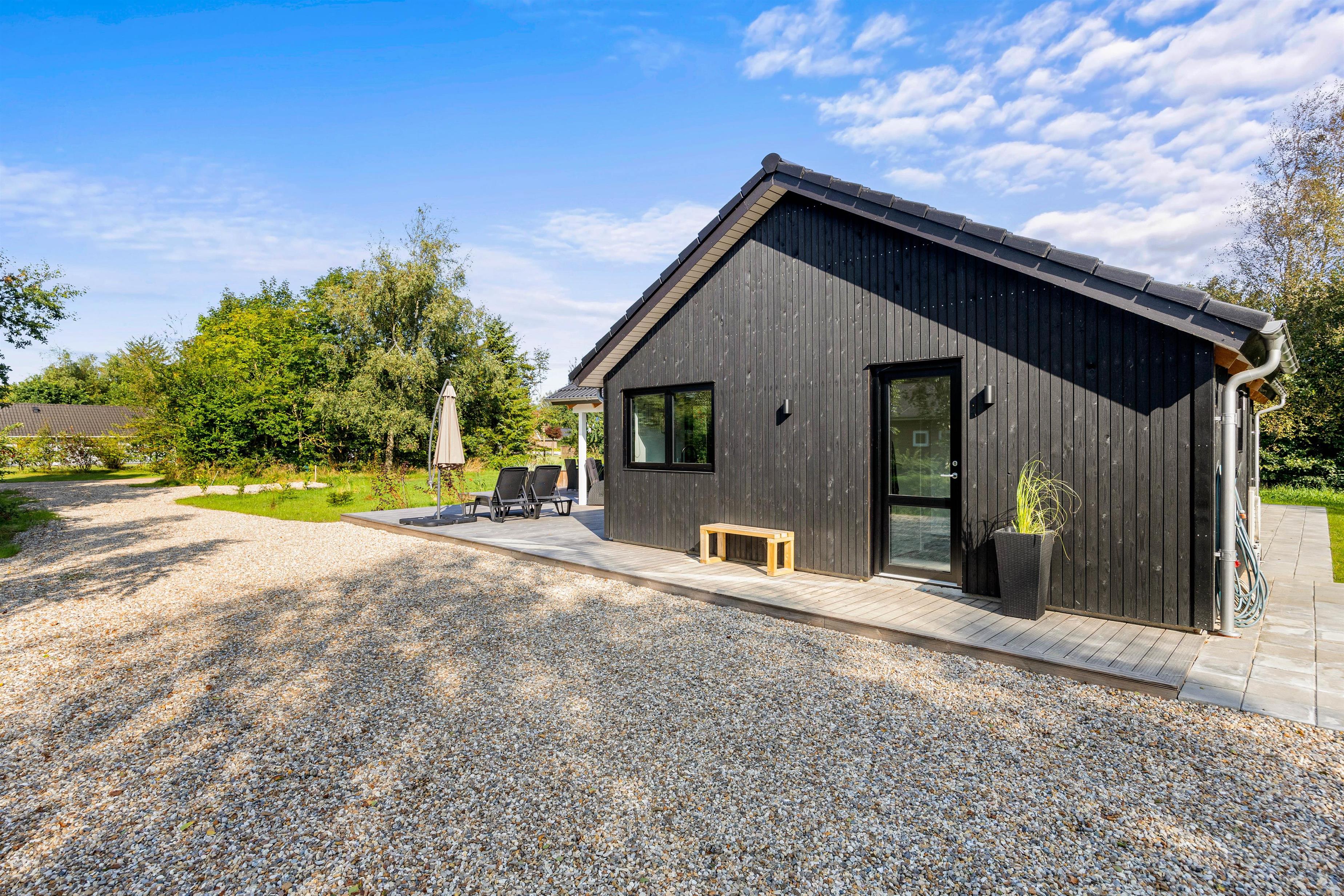 Den store træterrasse er helt fantastisk og indbyder til mange timers hygge i solskinnet. Terrassen er delvist overdækket, hvor I kan søge over i skyggen eller sidde og nyde morgenkaffe en tidlig forårsdag med udsigt over den store naturgrund. Her kan hunden trisse frit rundt.