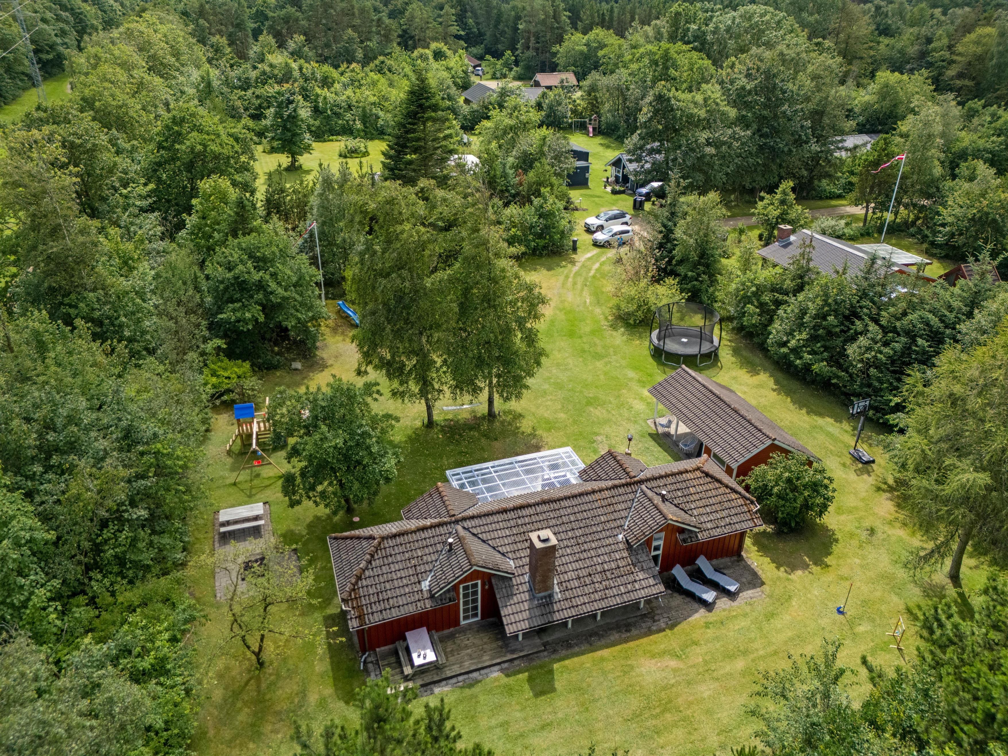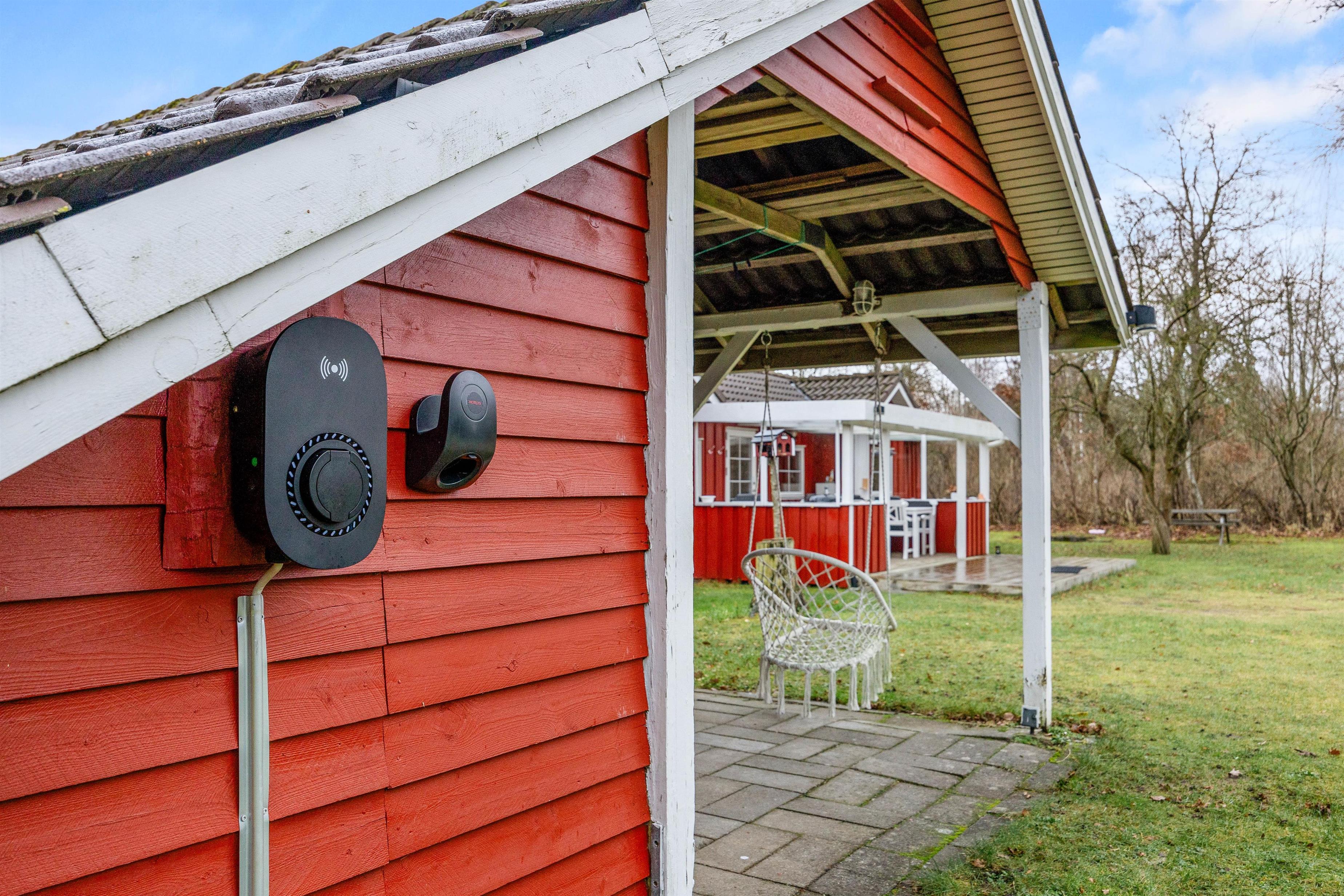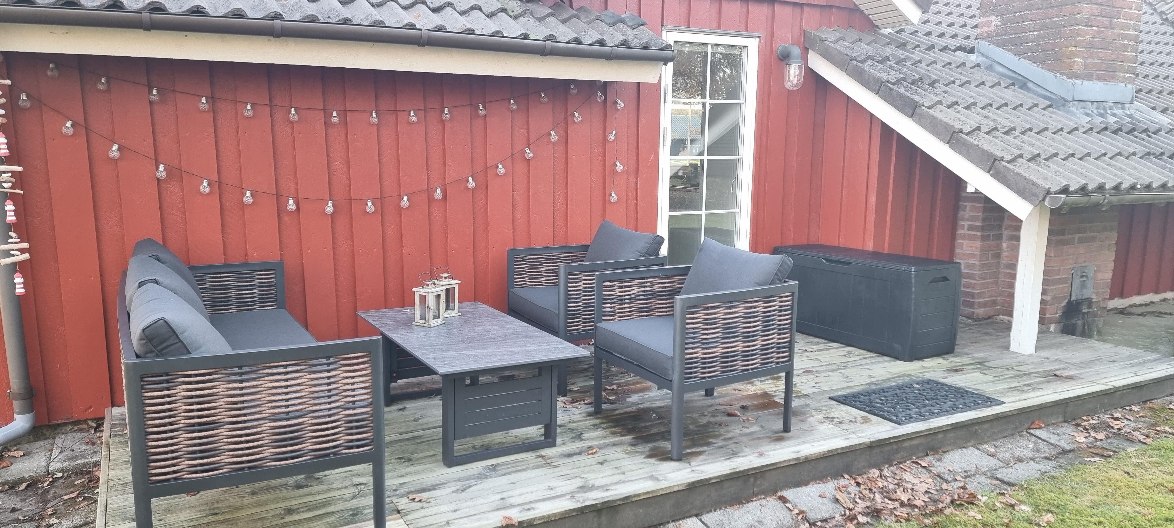 Fra stuen kan I træde ud på den overdækkede terrasse, som indbyder til hygge og samvær. Terrassen er veludstyret med komfortable havemøbler og en grill, så I kan nyde lækre måltider under åben himmel. Under de varme sommerdage eller hyggelige aftener, er terrassen det perfekte sted at tilbringe tid med familie og venner. Der er også en hængekøje, hvor I kan slappe af og nyde den friske luft.