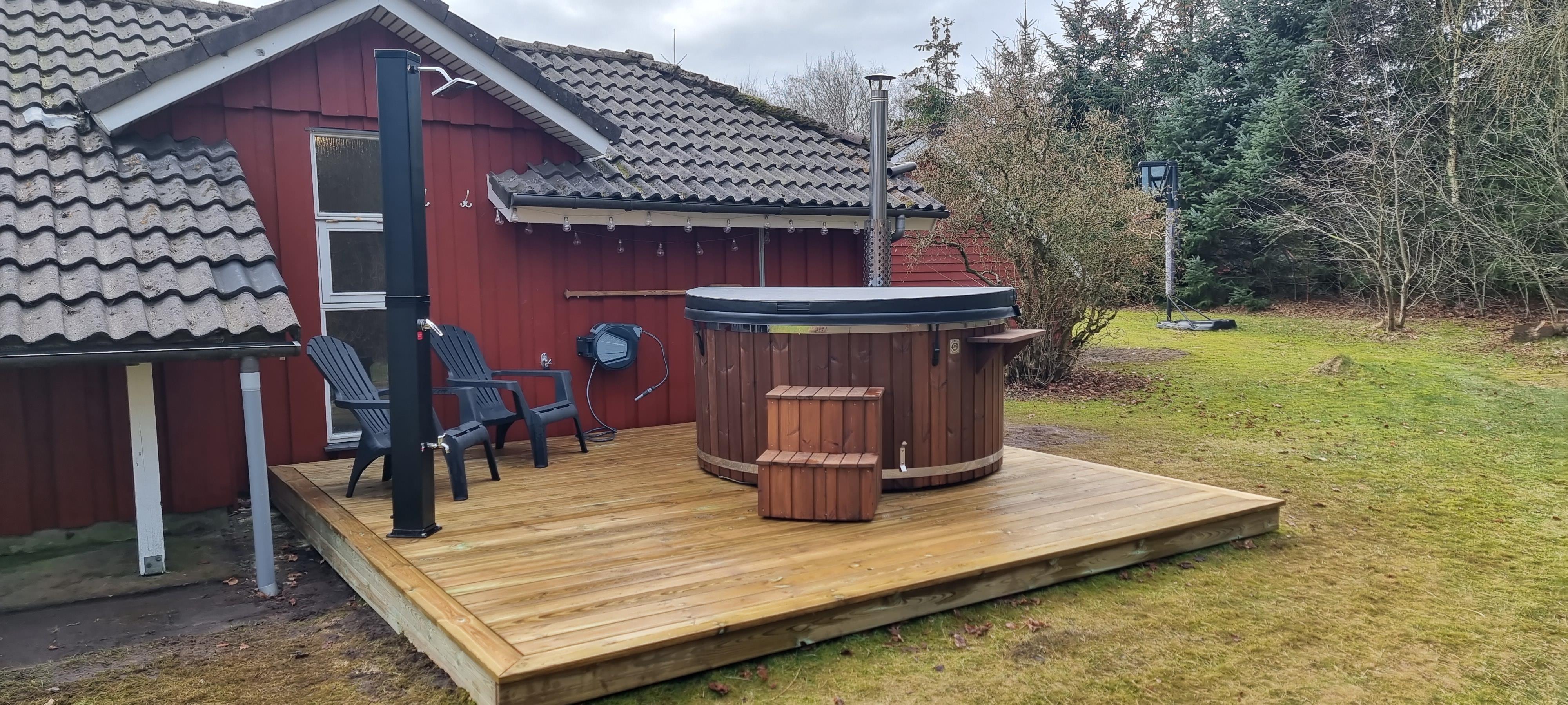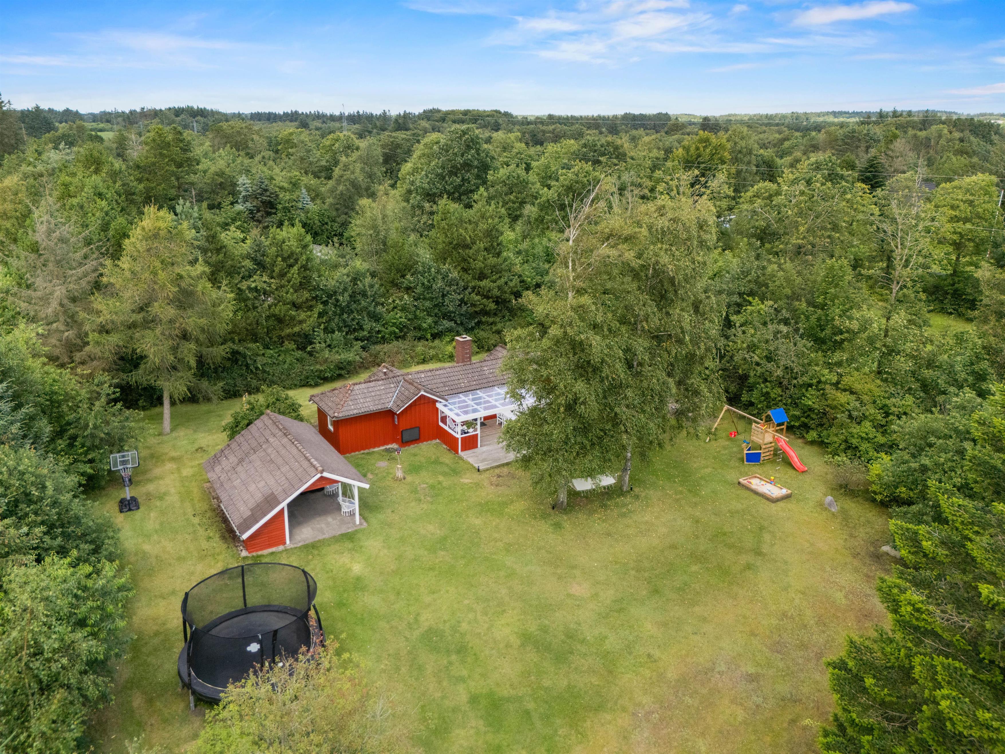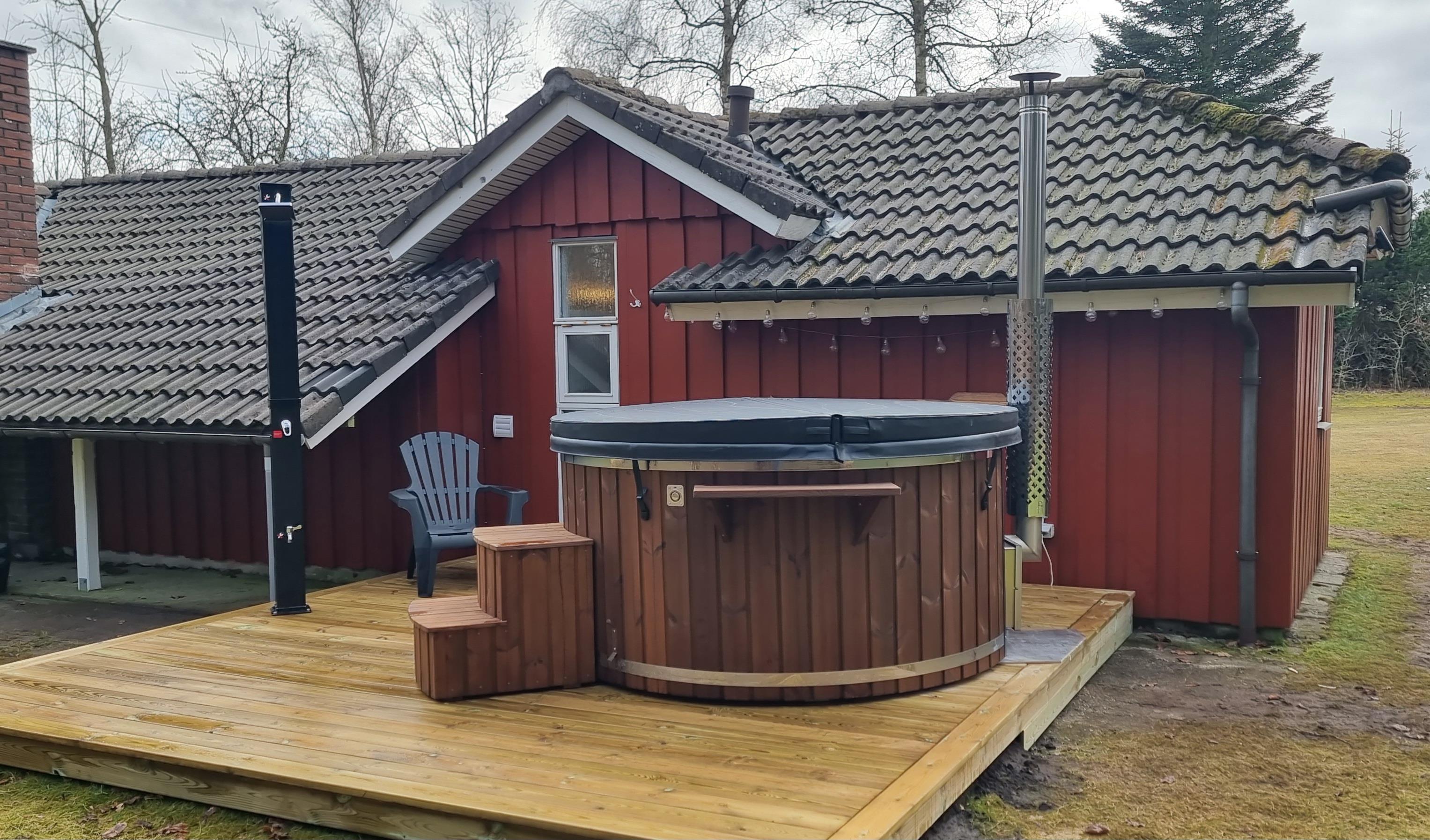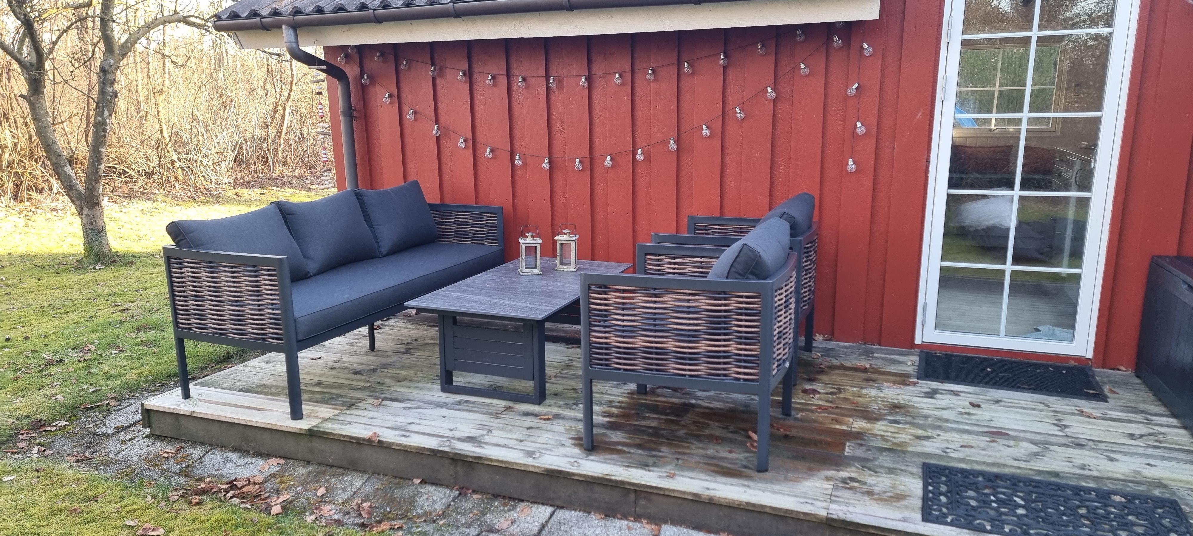 Fra stuen kan I træde ud på den overdækkede terrasse, som indbyder til hygge og samvær. Terrassen er veludstyret med komfortable havemøbler og en grill, så I kan nyde lækre måltider under åben himmel. Under de varme sommerdage eller hyggelige aftener, er terrassen det perfekte sted at tilbringe tid med familie og venner. Der er også en hængekøje, hvor I kan slappe af og nyde den friske luft.
