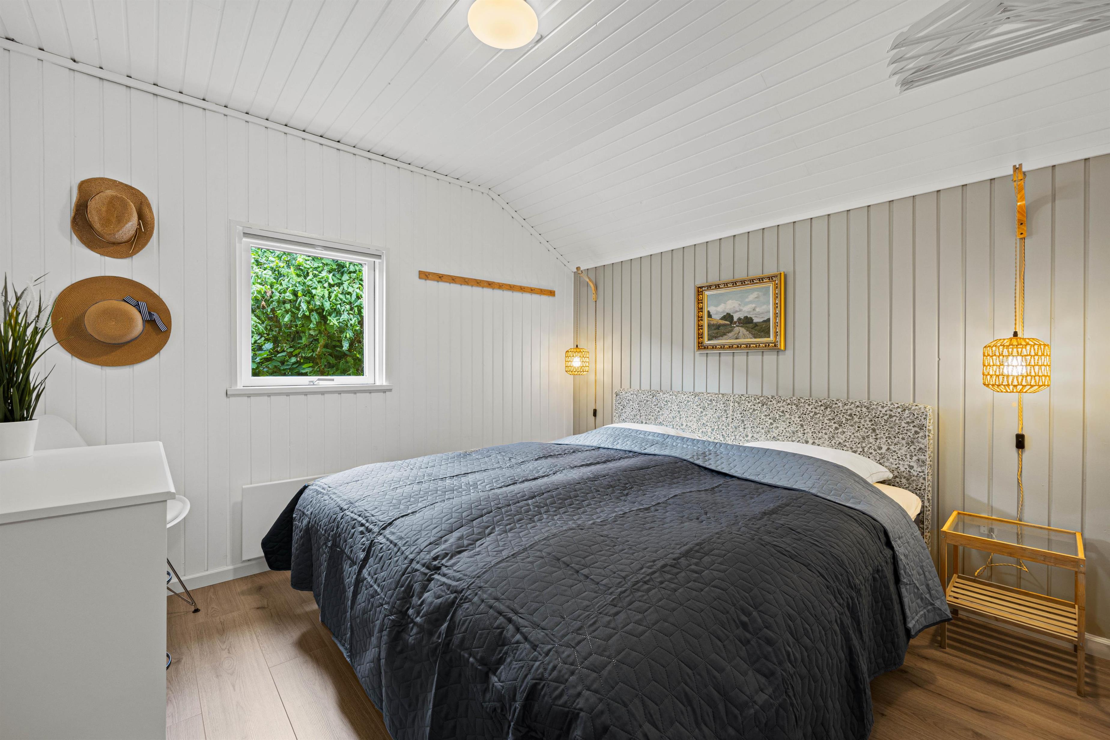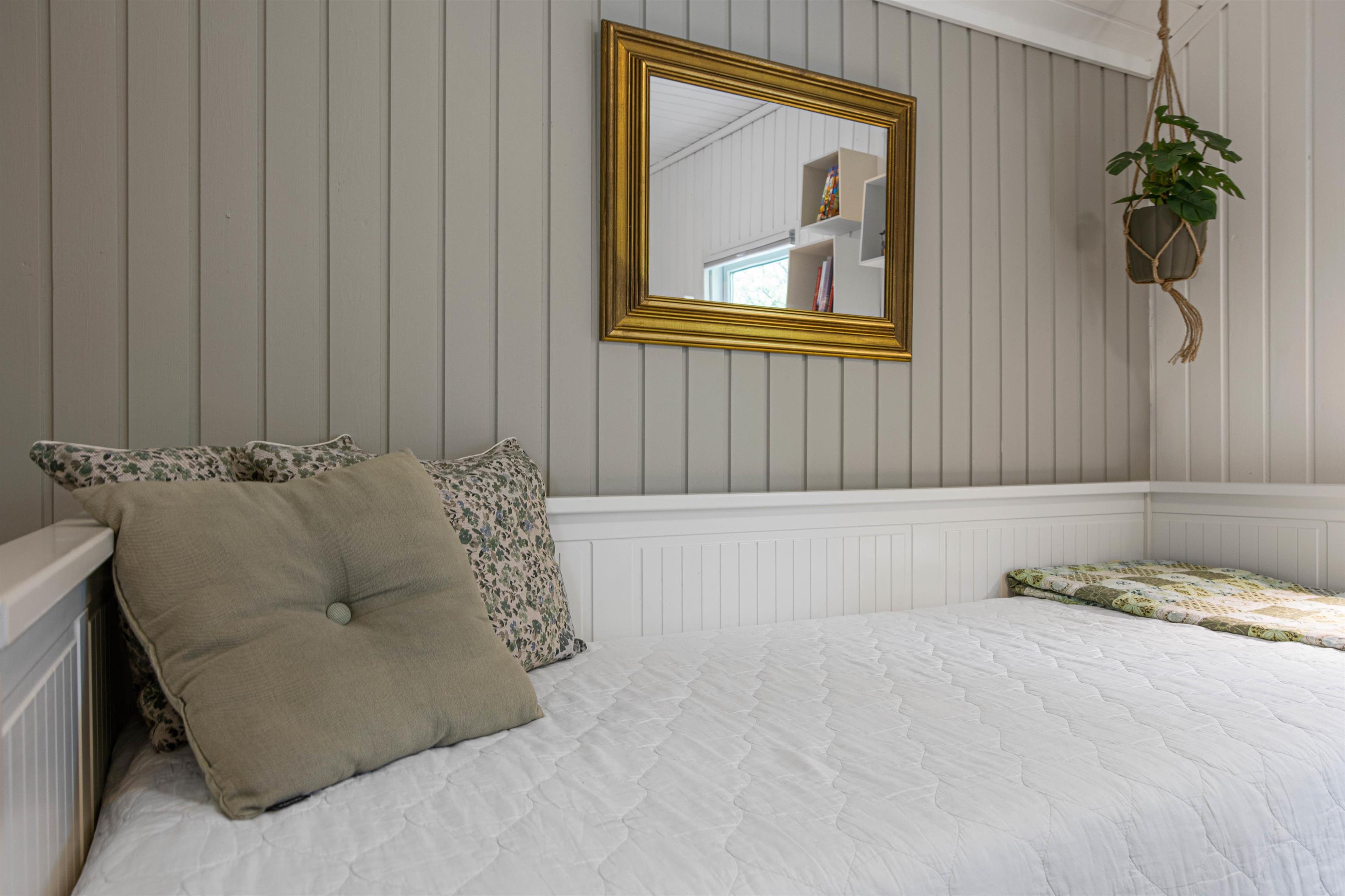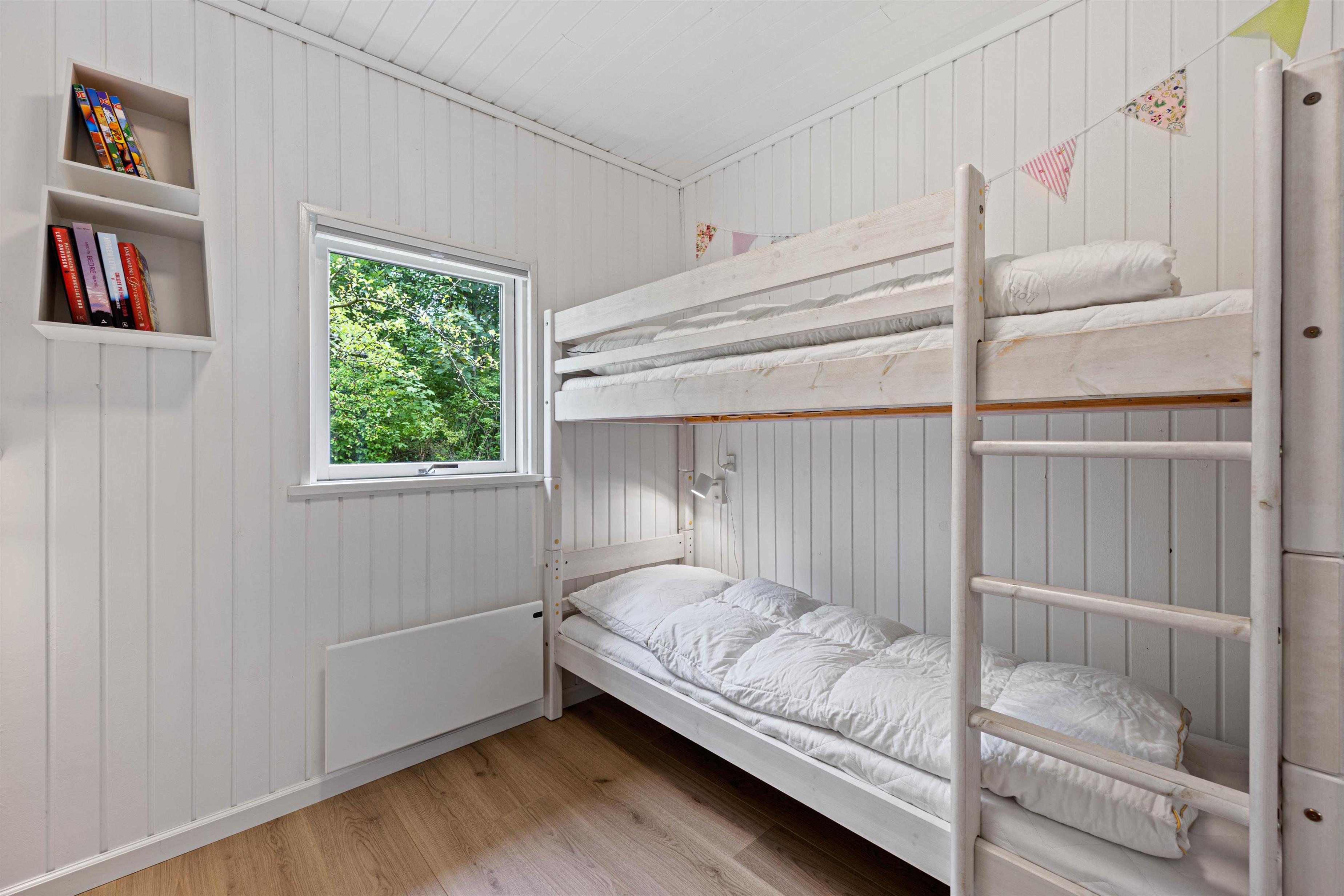 I sommerhuset finder I to charmerende soveværelser, der er velegnede til både voksne og børn. Det ene soveværelse indeholder en dobbeltseng, mens det andet værelse har en køjeseng og en udtræks-dobbeltseng. Denne indretning sikrer fleksible og komfortable sovemuligheder for hele familien.