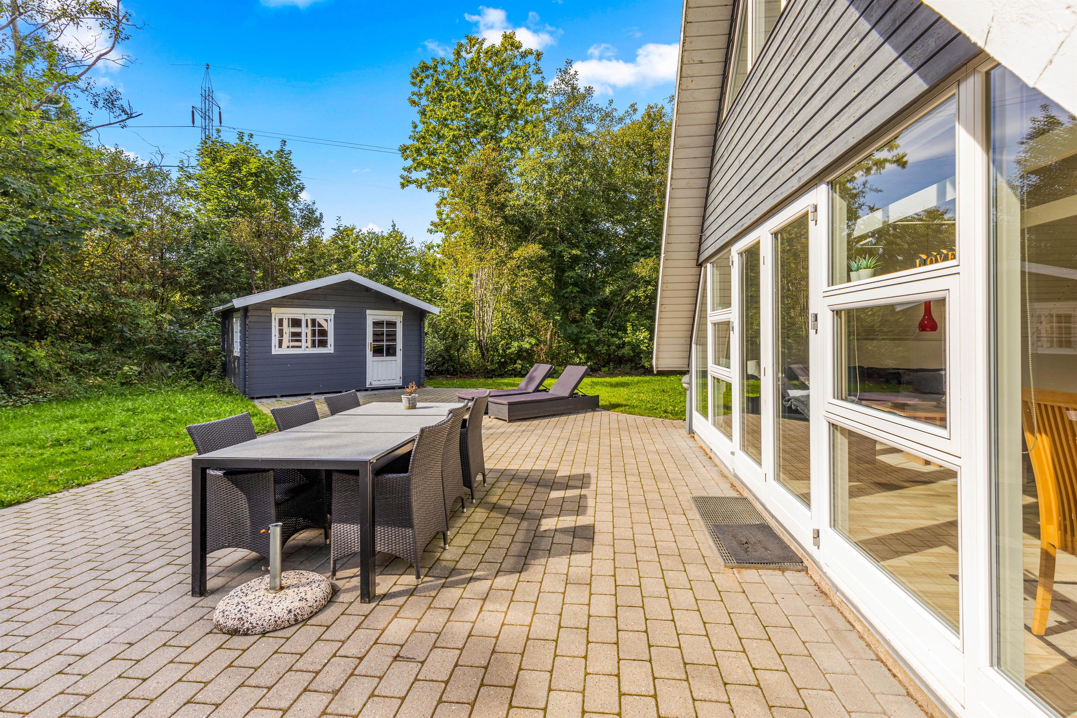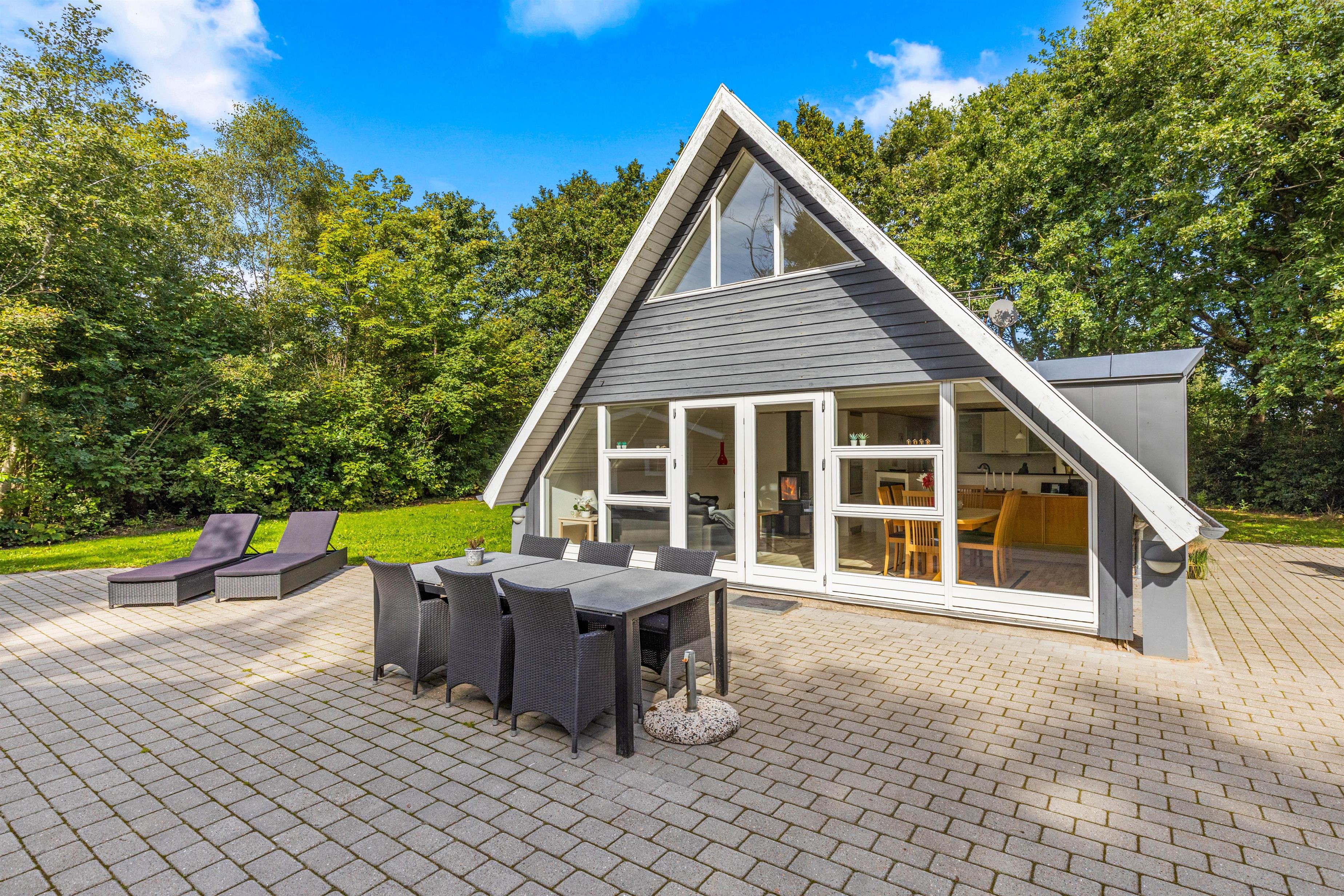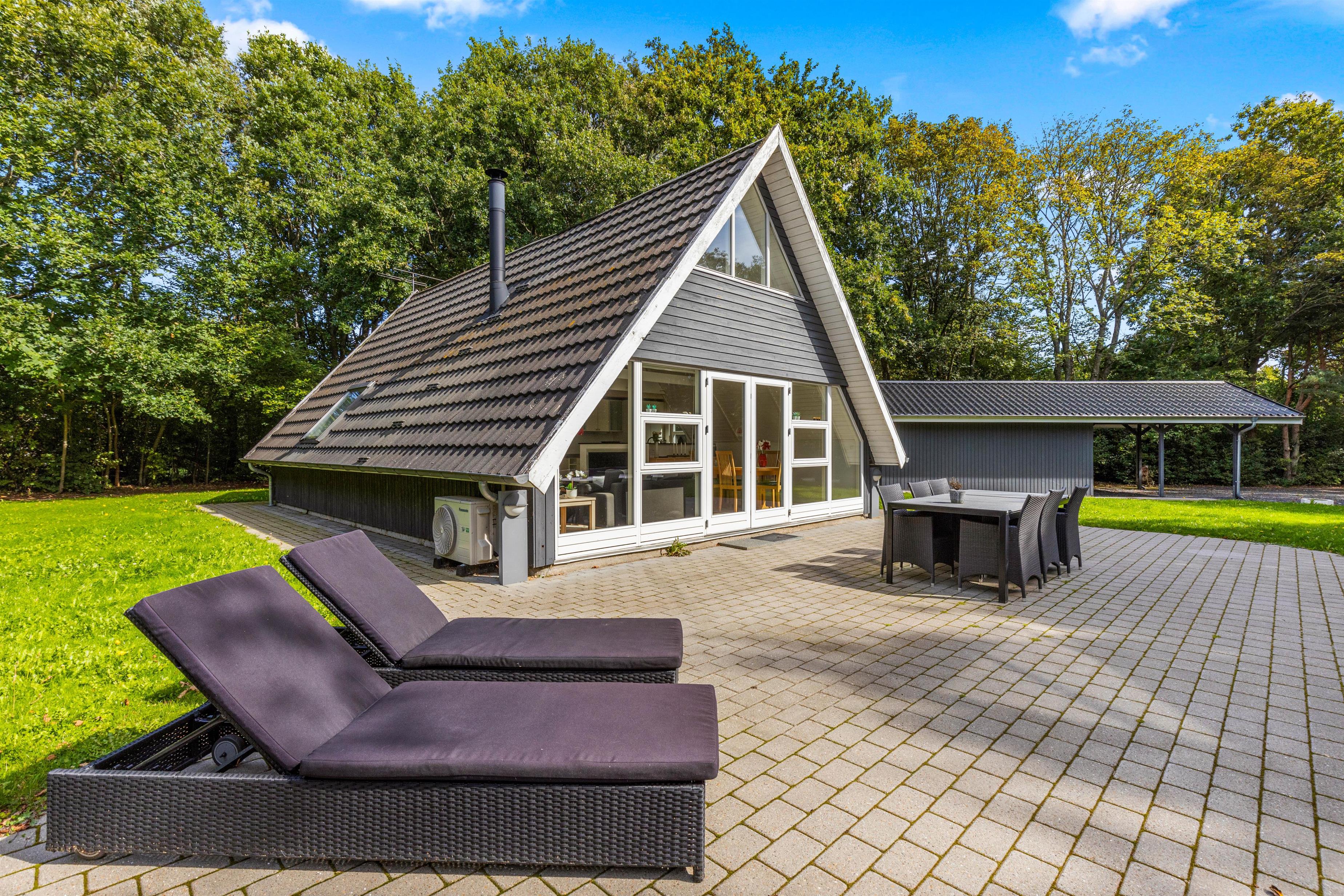 Udenfor finder I en skøn åben terrasse, der er tilgængelig direkte fra stuen. Her kan I slå jer ned i liggestolene og nyde sommerhusets afslappende atmosfære. De omkringliggende høje træer skaber en naturlig afskærmning, der sikrer jer privatliv og giver jer mulighed for at nyde naturens fred og ro.