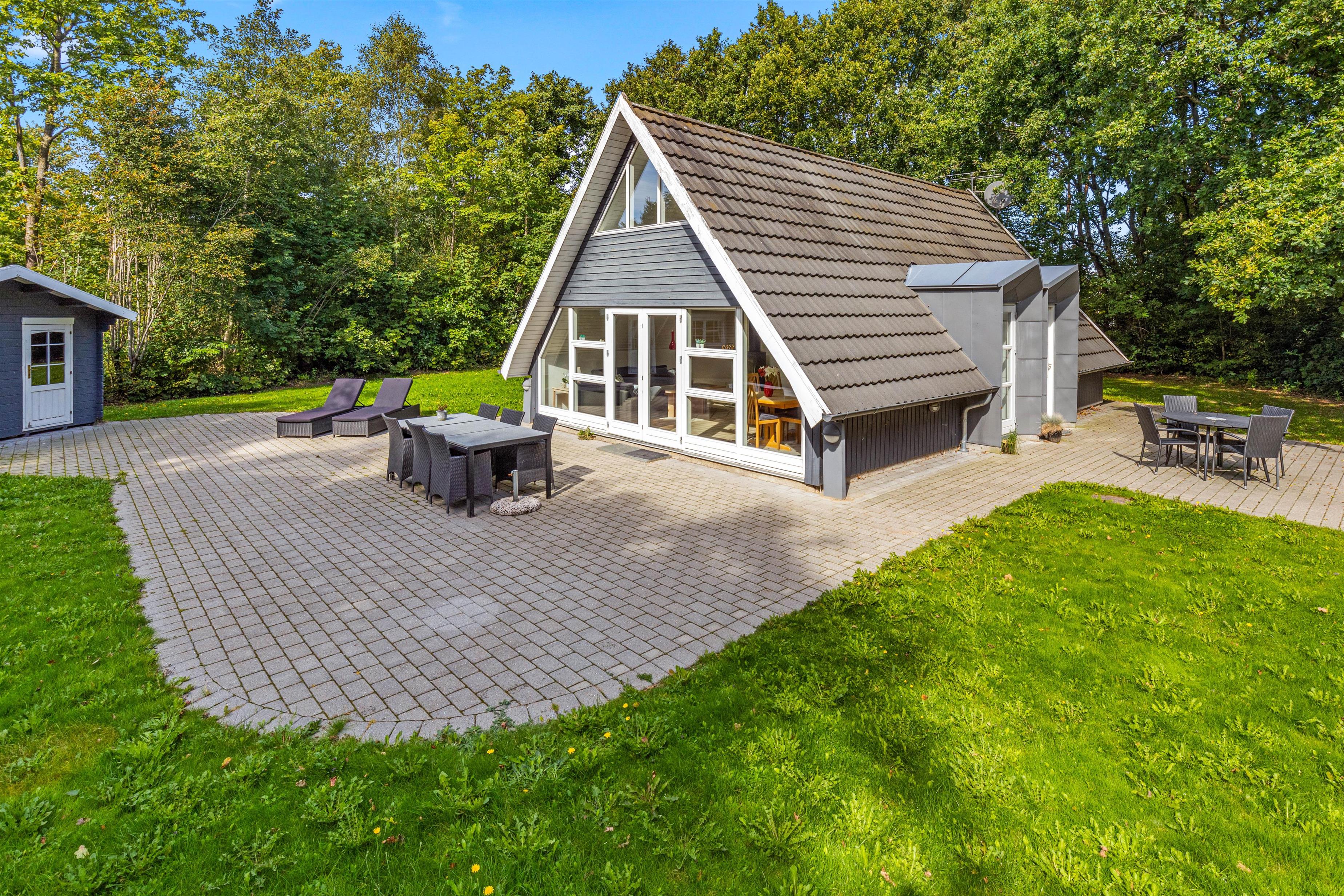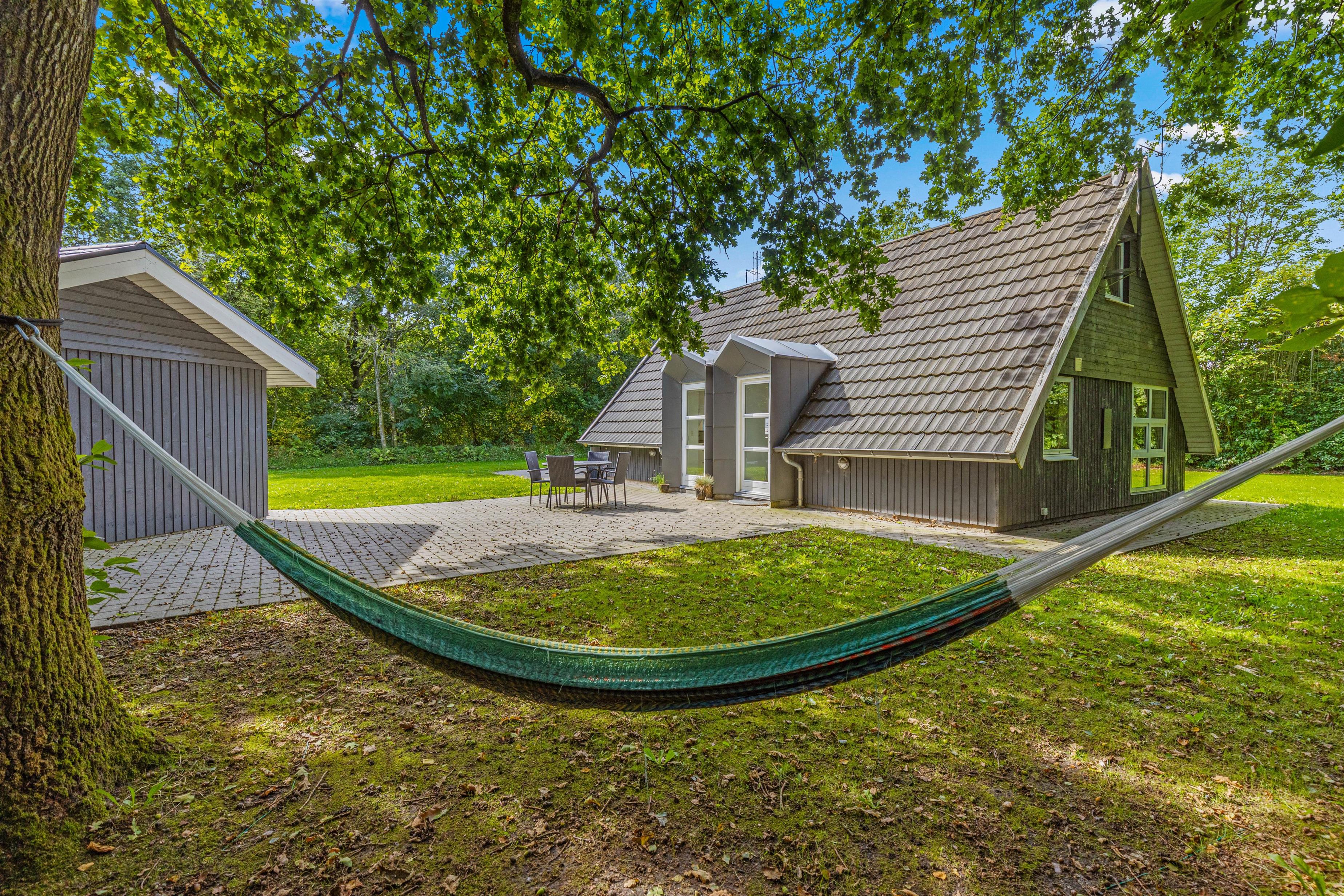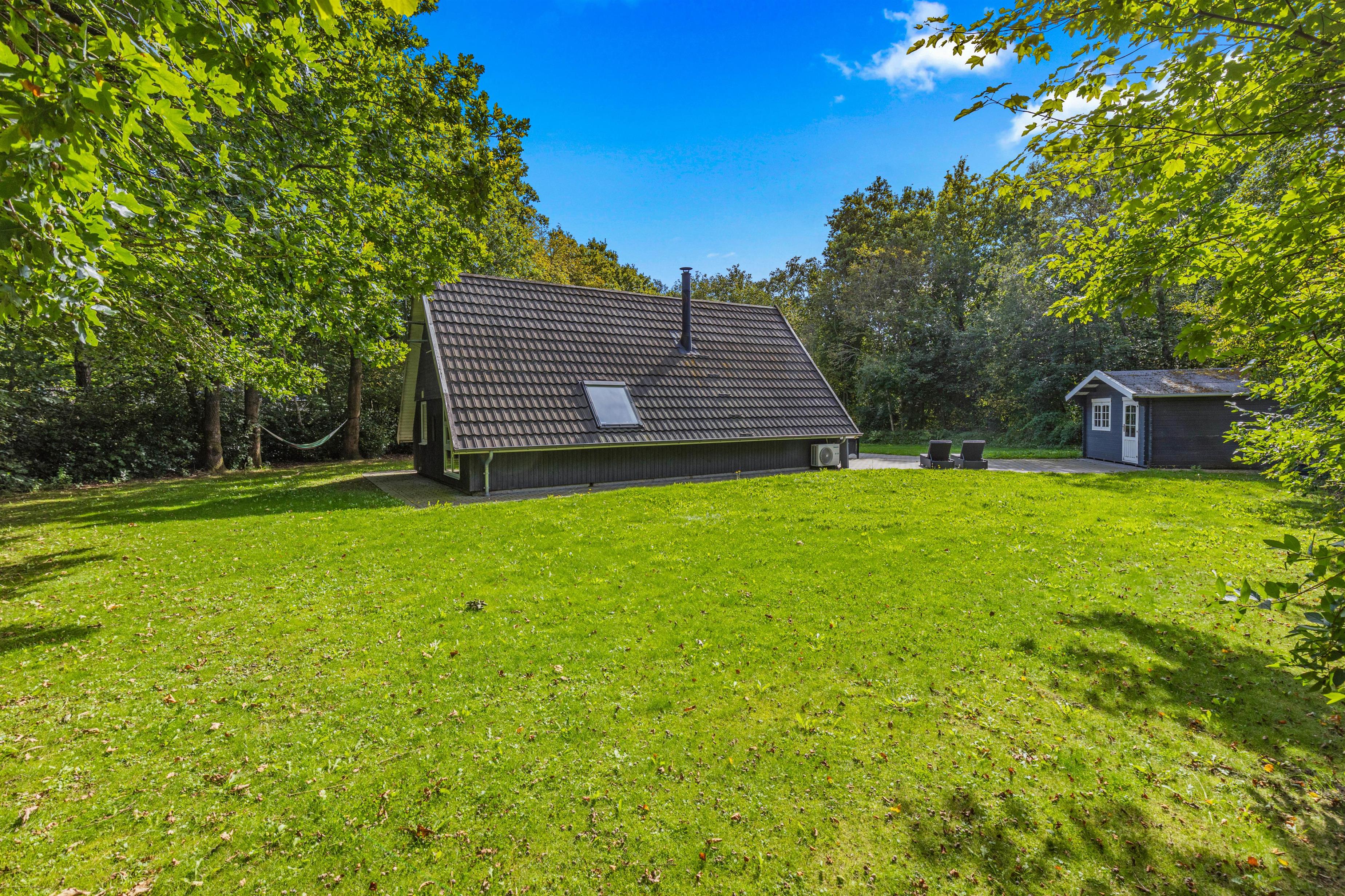 Udenfor finder I en skøn åben terrasse, der er tilgængelig direkte fra stuen. Her kan I slå jer ned i liggestolene og nyde sommerhusets afslappende atmosfære. De omkringliggende høje træer skaber en naturlig afskærmning, der sikrer jer privatliv og giver jer mulighed for at nyde naturens fred og ro.