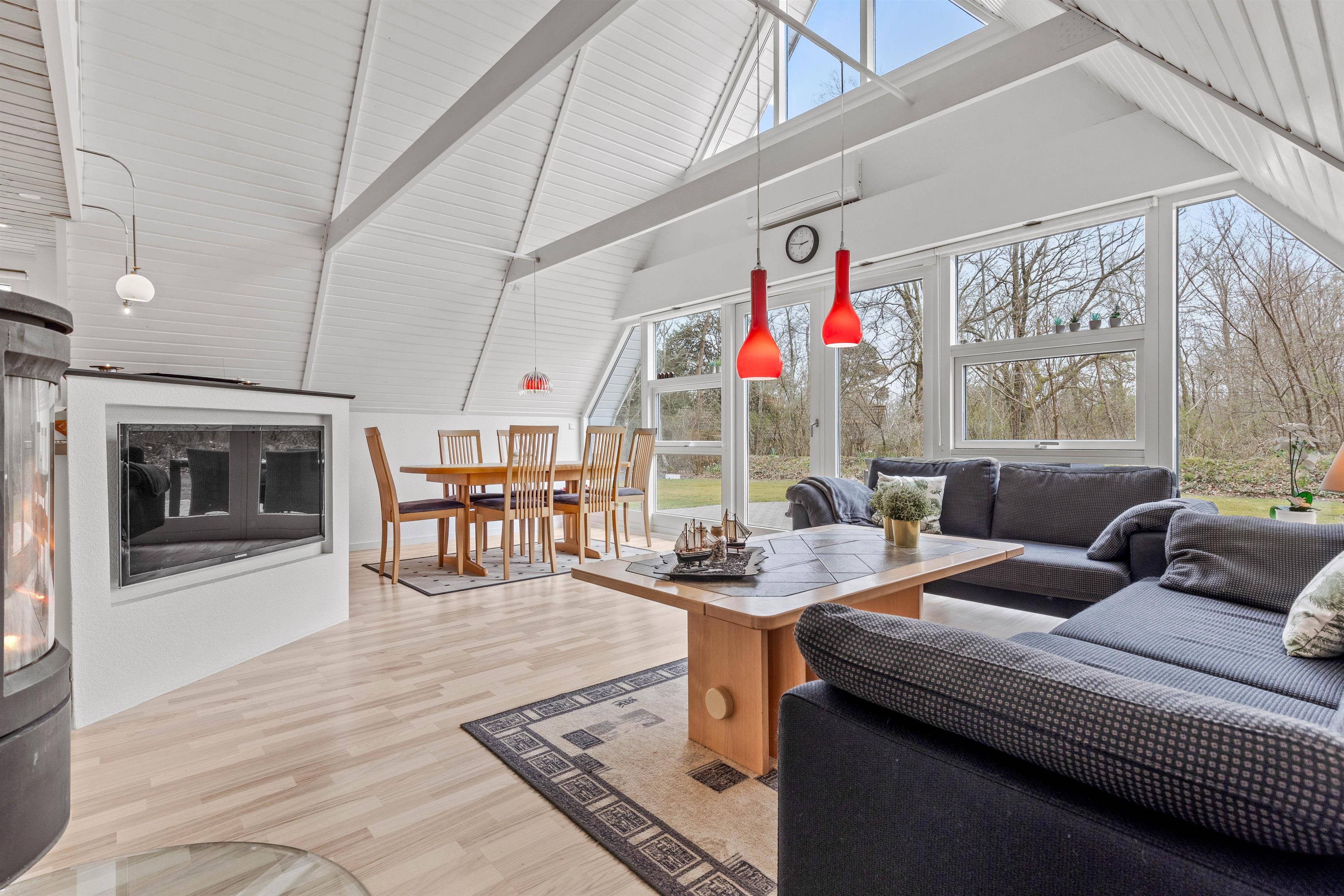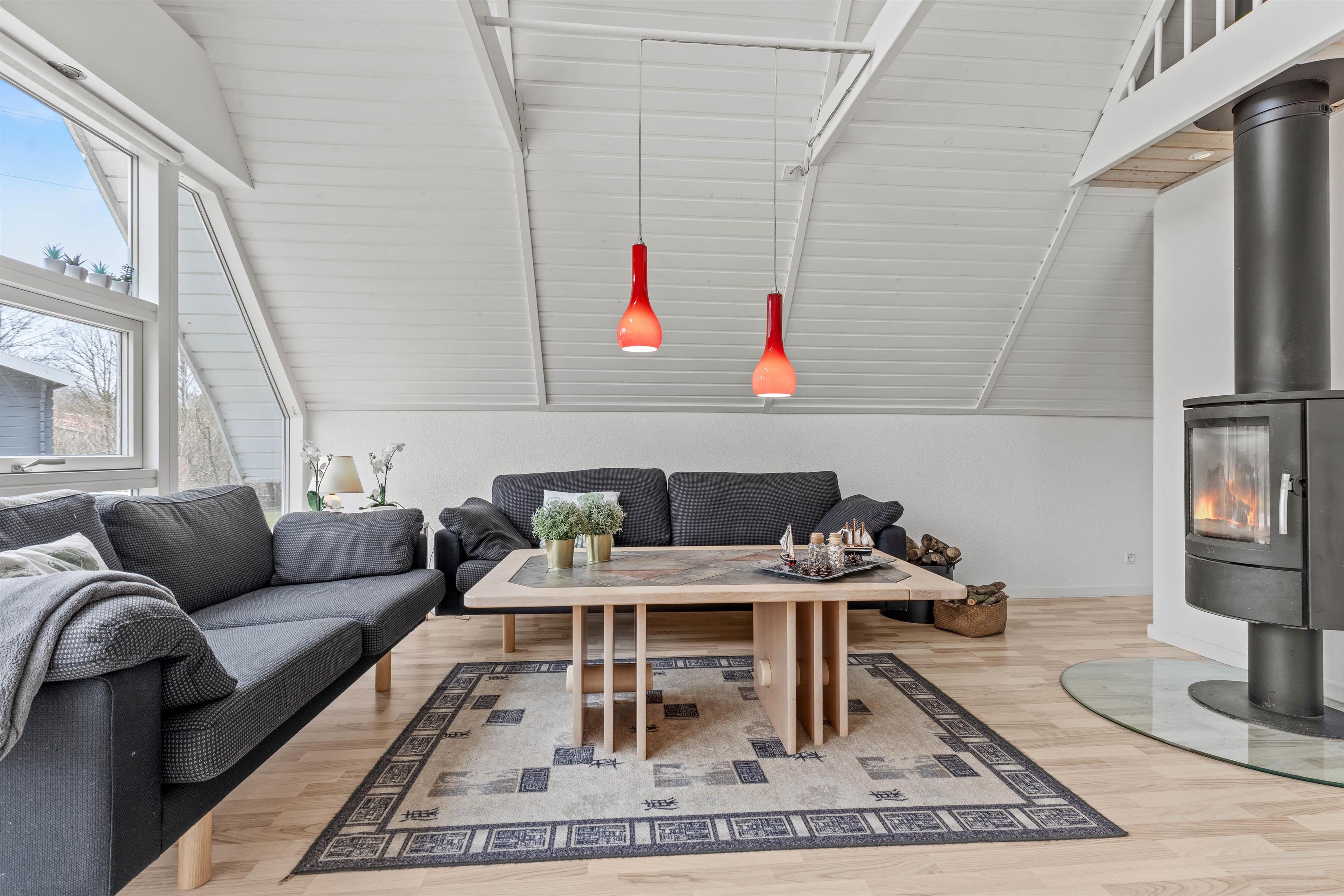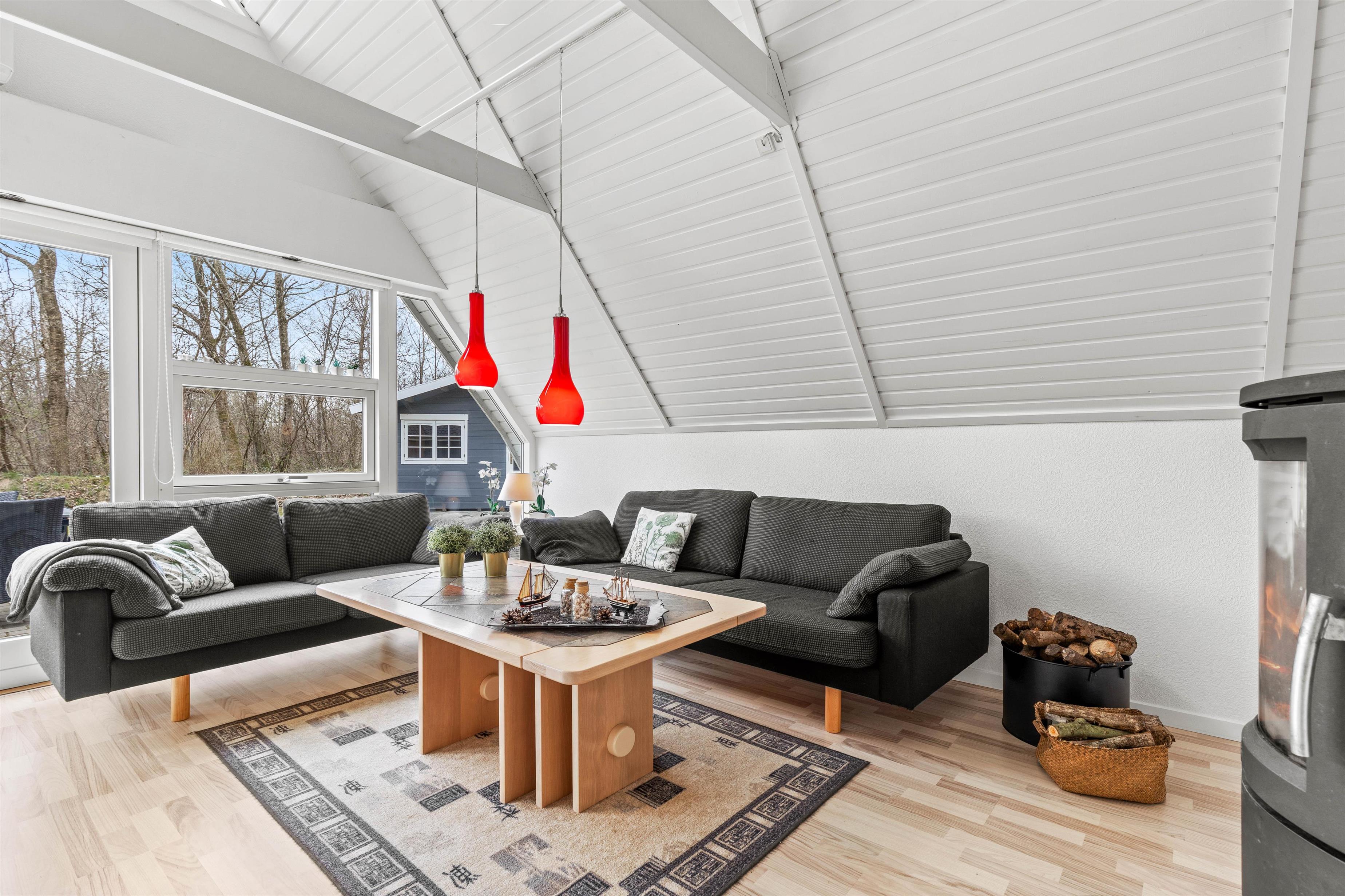 Indenfor byder sommerhuset på et stilfuldt samtalekøkken, der åbner sig op mod spisestue og opholdsstue, hvilket skaber en hyggelig og social atmosfære for alle gæster. I opholdsstuen vil I finde en hyggelig brændeovn, som bliver et naturligt samlingspunkt, hvor man kan nyde varmen og en afslappende aften efter en dag fyldt med oplevelser.