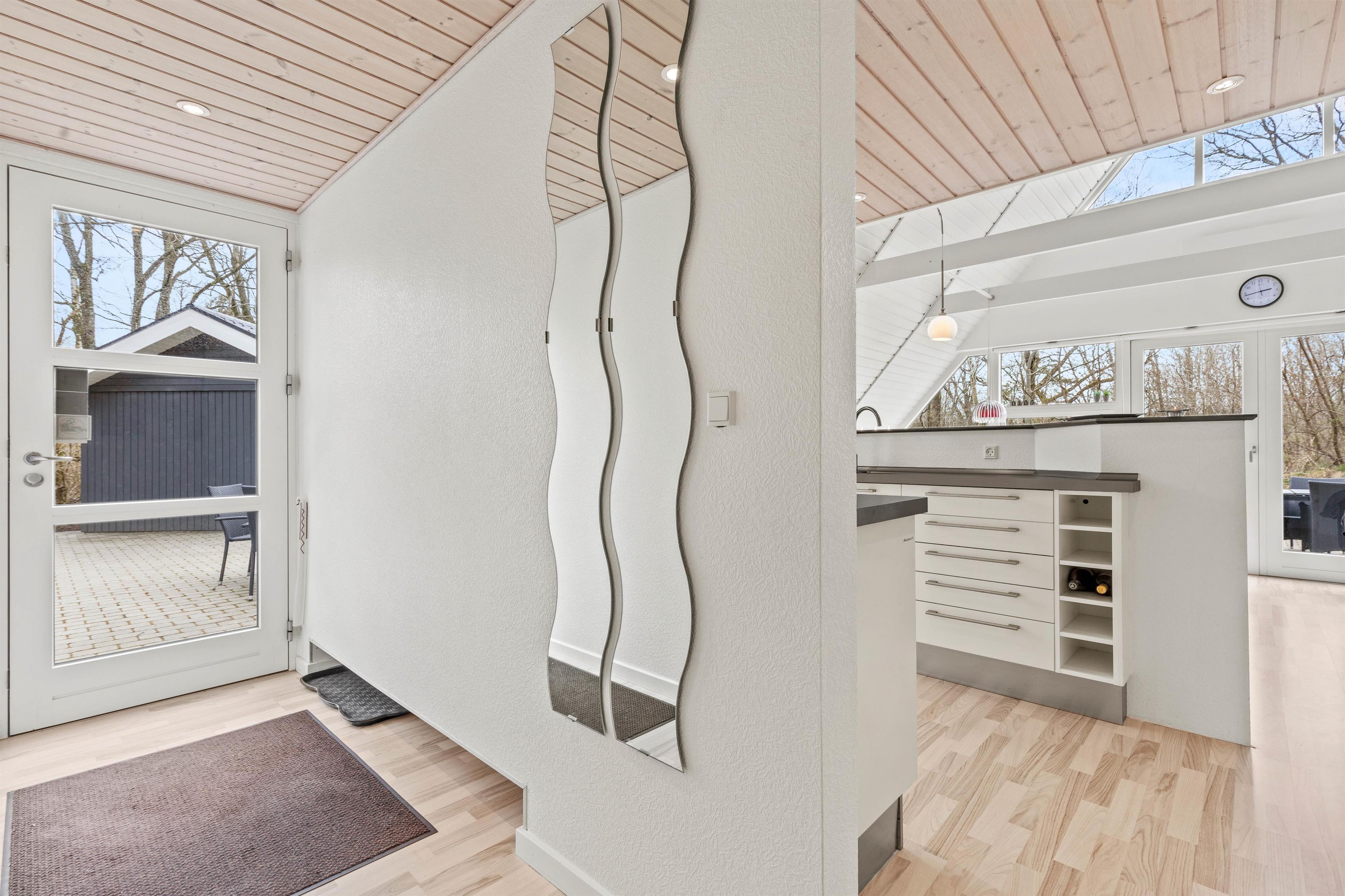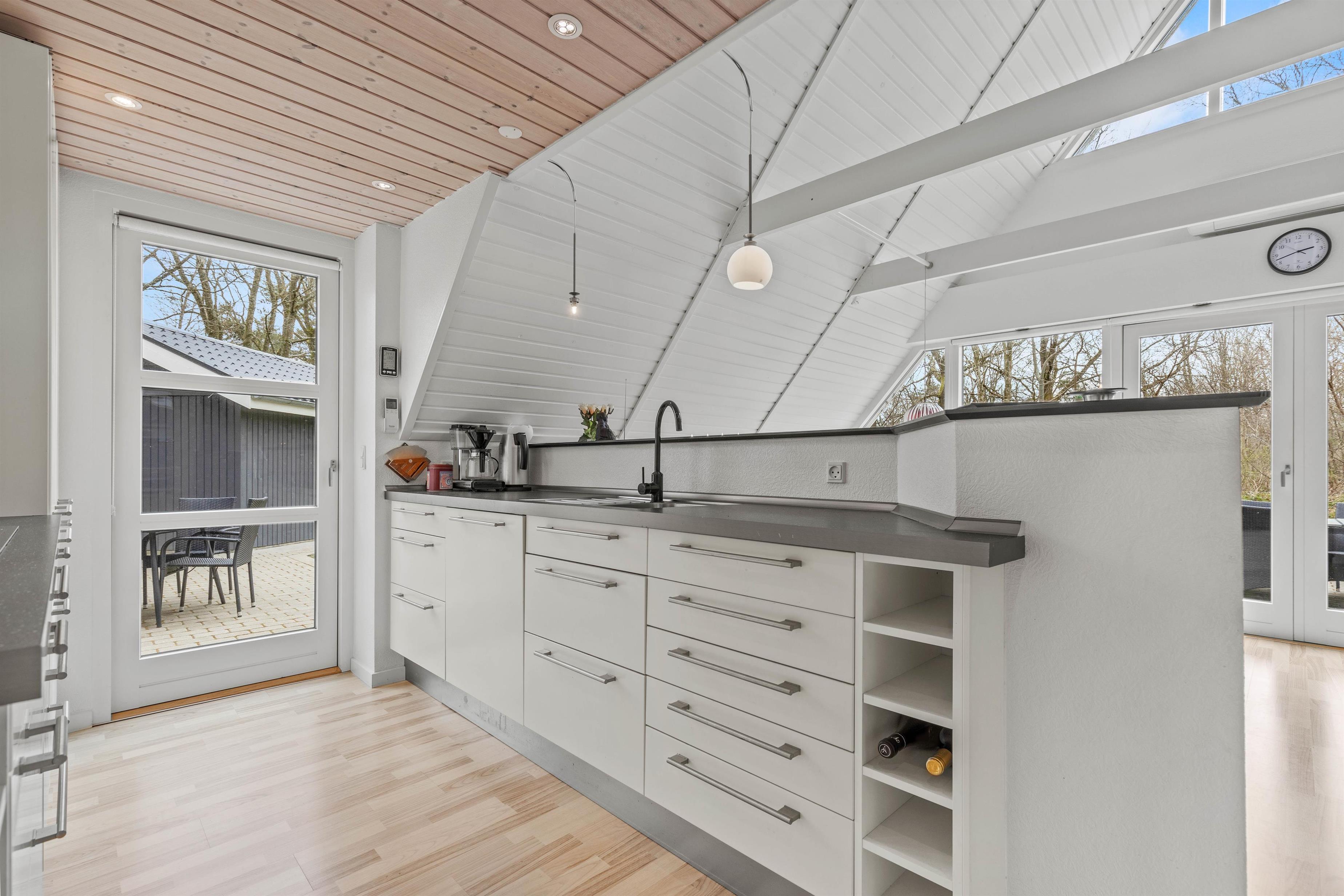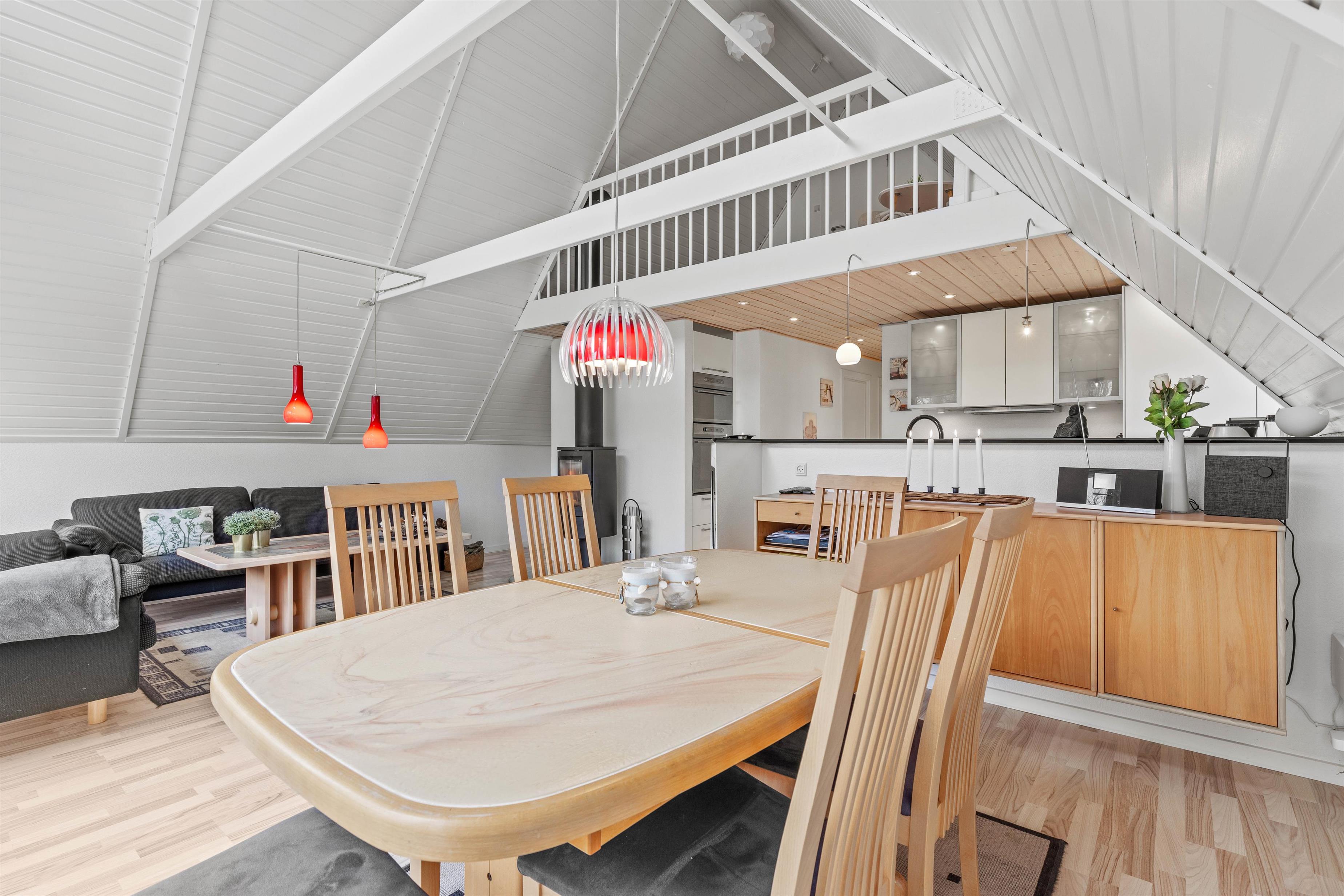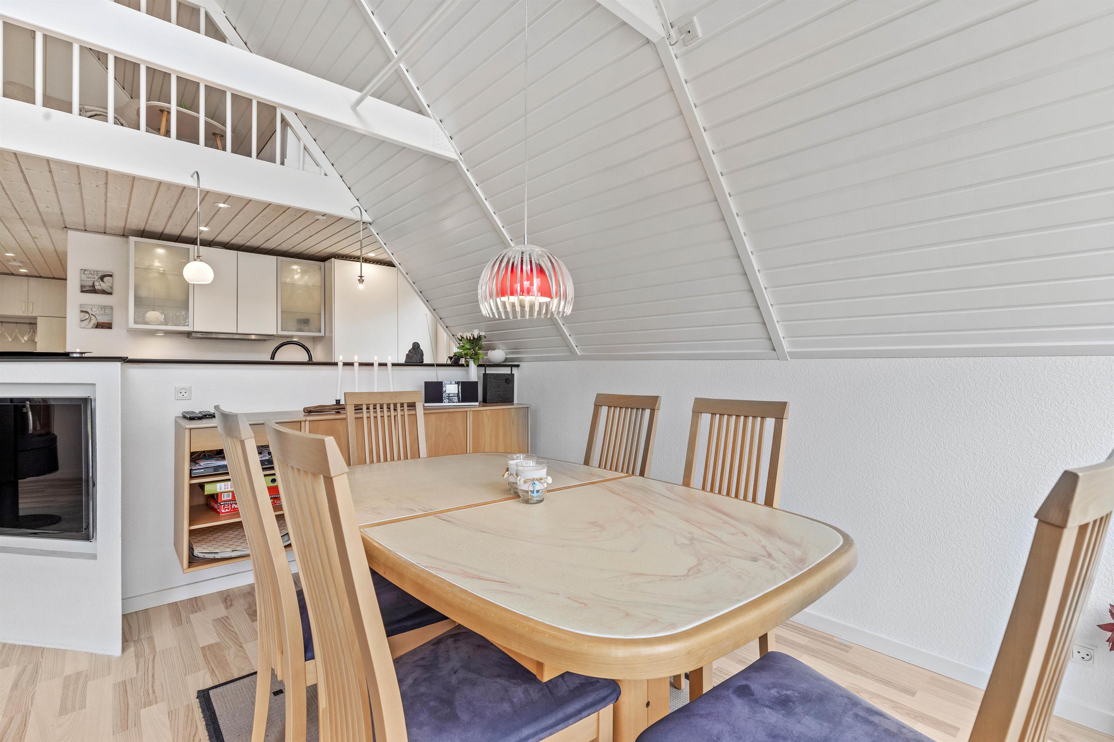 Indenfor byder sommerhuset på et stilfuldt samtalekøkken, der åbner sig op mod spisestue og opholdsstue, hvilket skaber en hyggelig og social atmosfære for alle gæster. I opholdsstuen vil I finde en hyggelig brændeovn, som bliver et naturligt samlingspunkt, hvor man kan nyde varmen og en afslappende aften efter en dag fyldt med oplevelser.