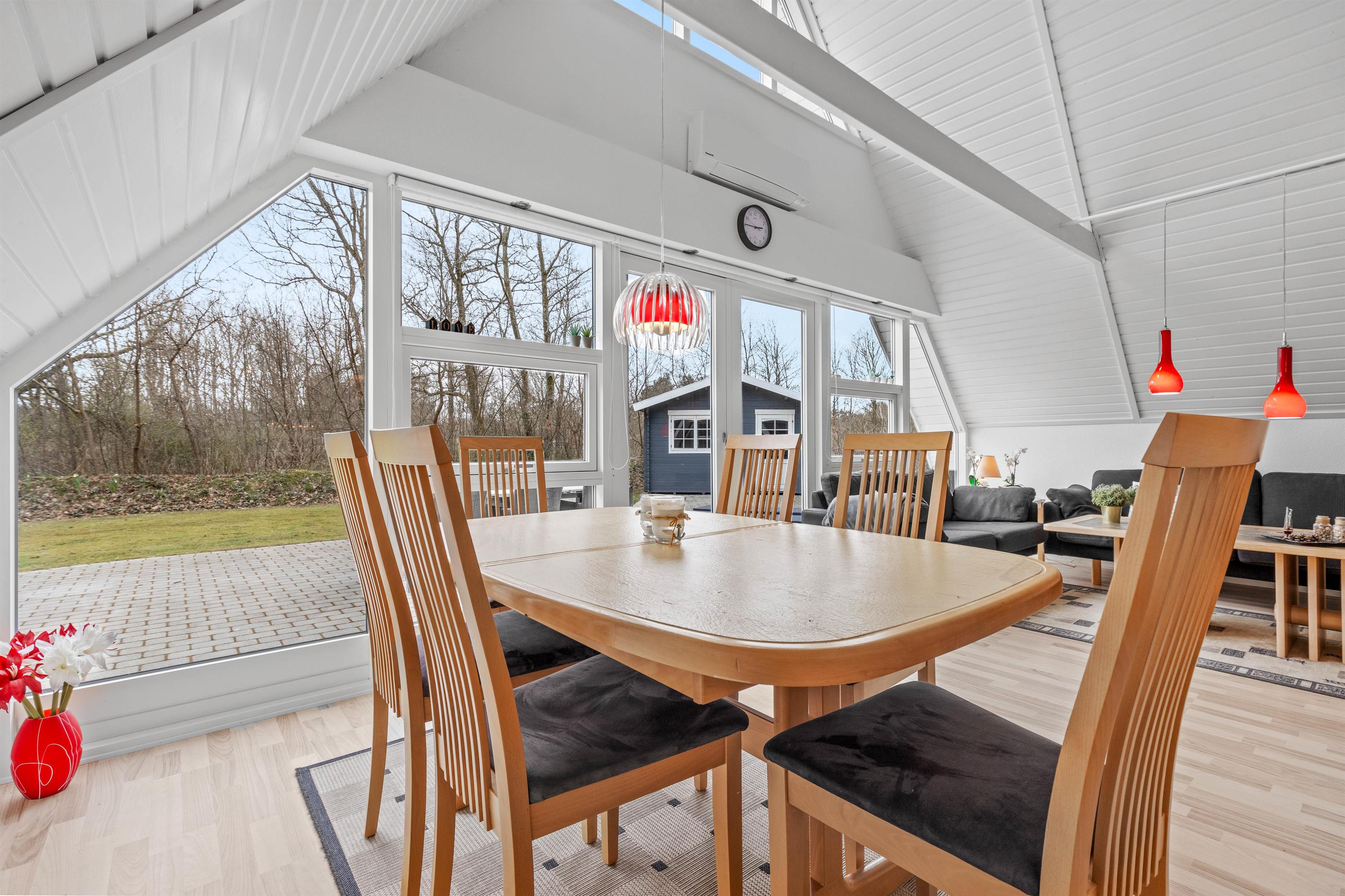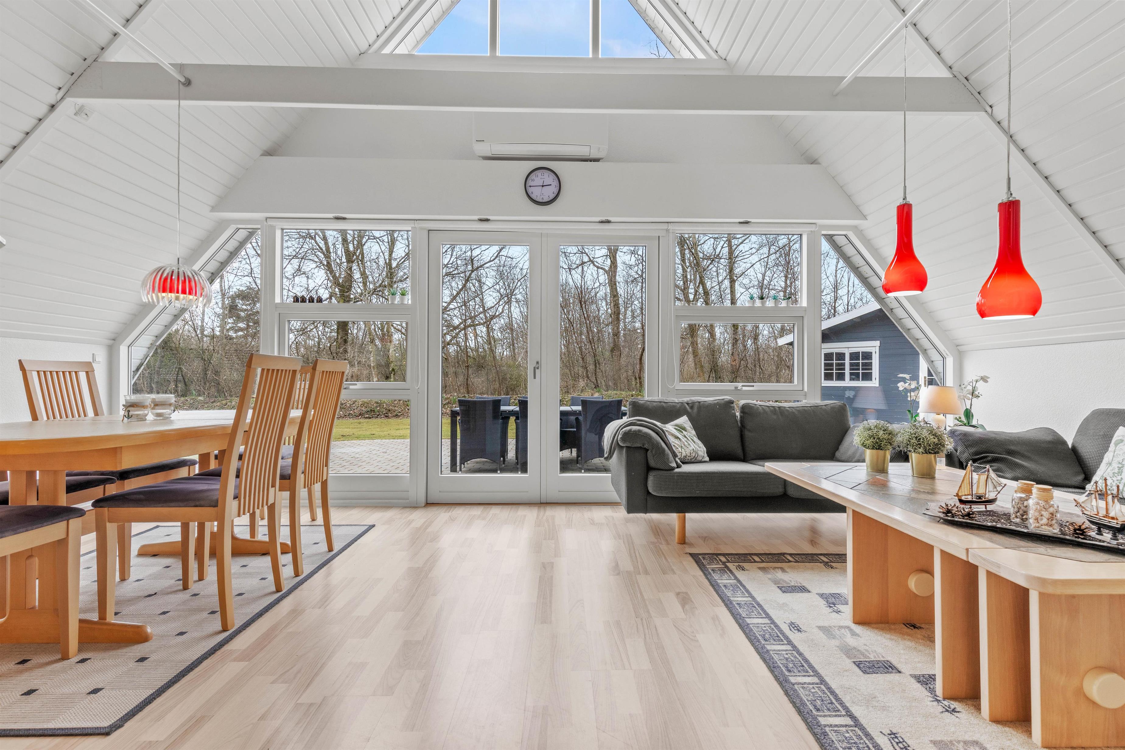 De lyse gulve og vægge samt et loft til kip med synlige bjælker er kendetegnene ved dette sommerhus - dertil en stor vinduesfront med udsigt til det grønne udenfor, der lader naturligt lys strømme ind og bringer naturen helt tæt på.