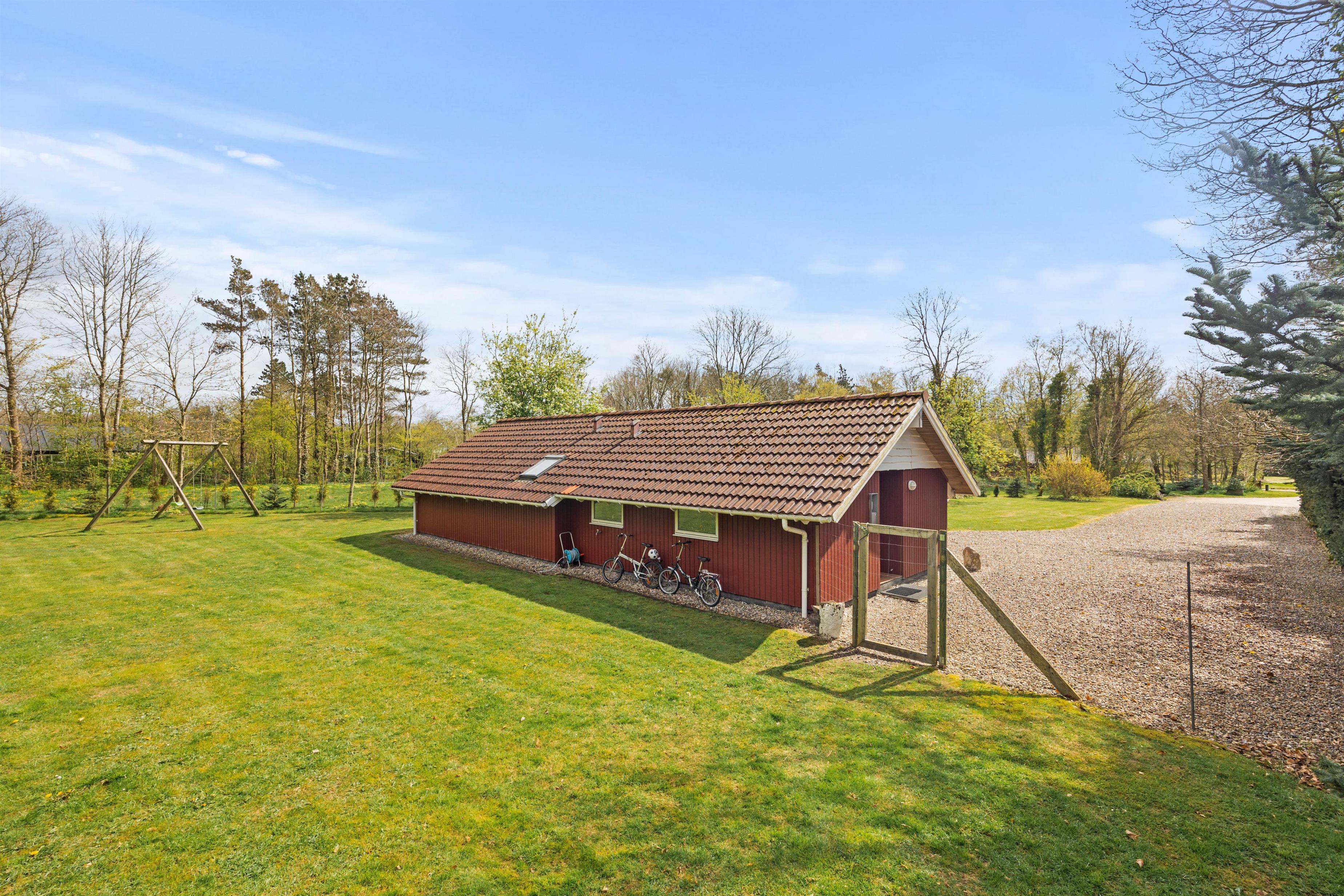 På bagsiden af feriehuset finder I blandt andet sandkasse og gynger. Også her er en del af haven indhegnet, så det er muligt at lade hunden snuse frit omkring.