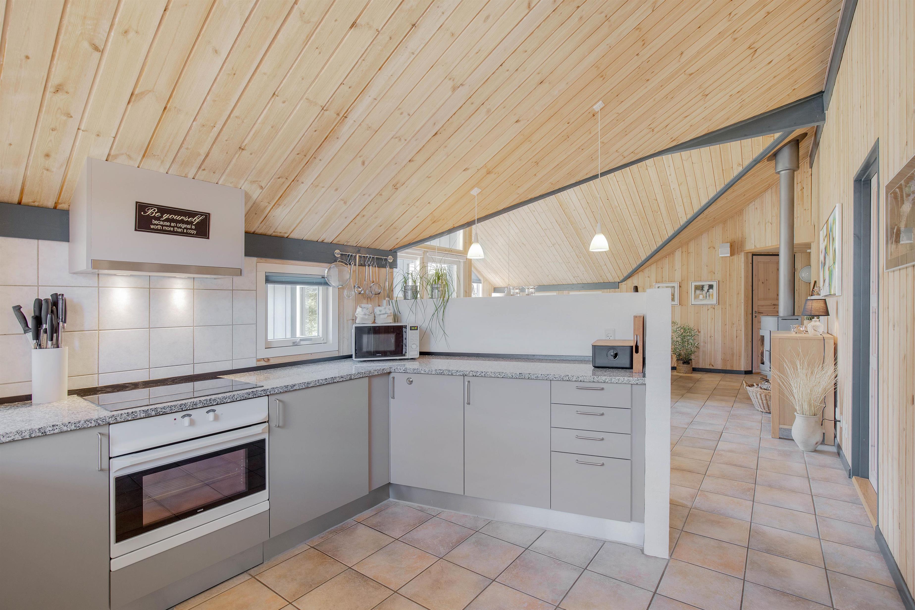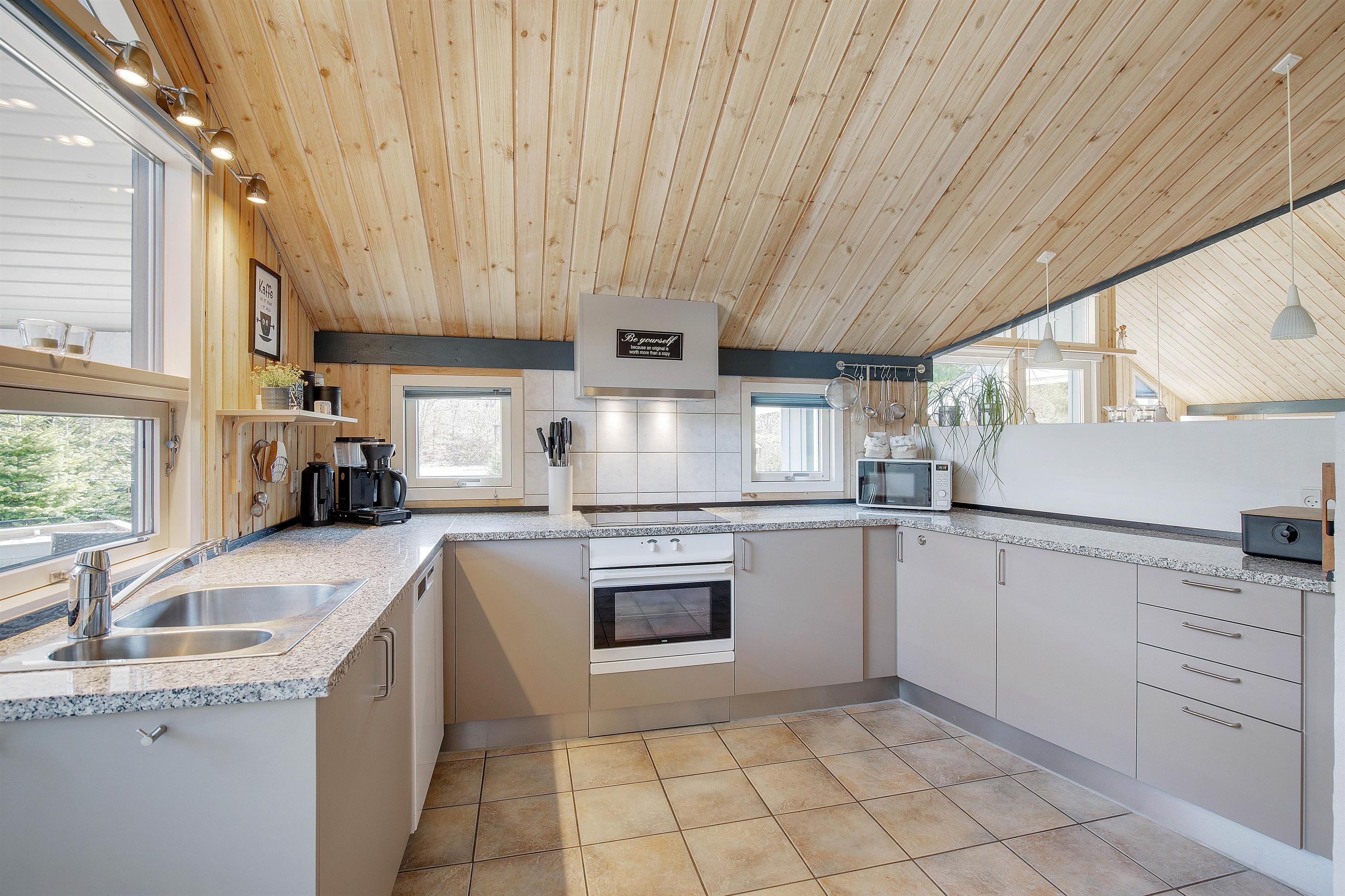 Den åbne planløsning danner det store samlingspunkt i feriehuset, hvor køkken, stue og spiseplads bliver forenet. Her er rammerne sat for mange hyggelige feriestunder med madlavning, spil og film – I kan endda streame familiens favoritfilm via Chromecasten.