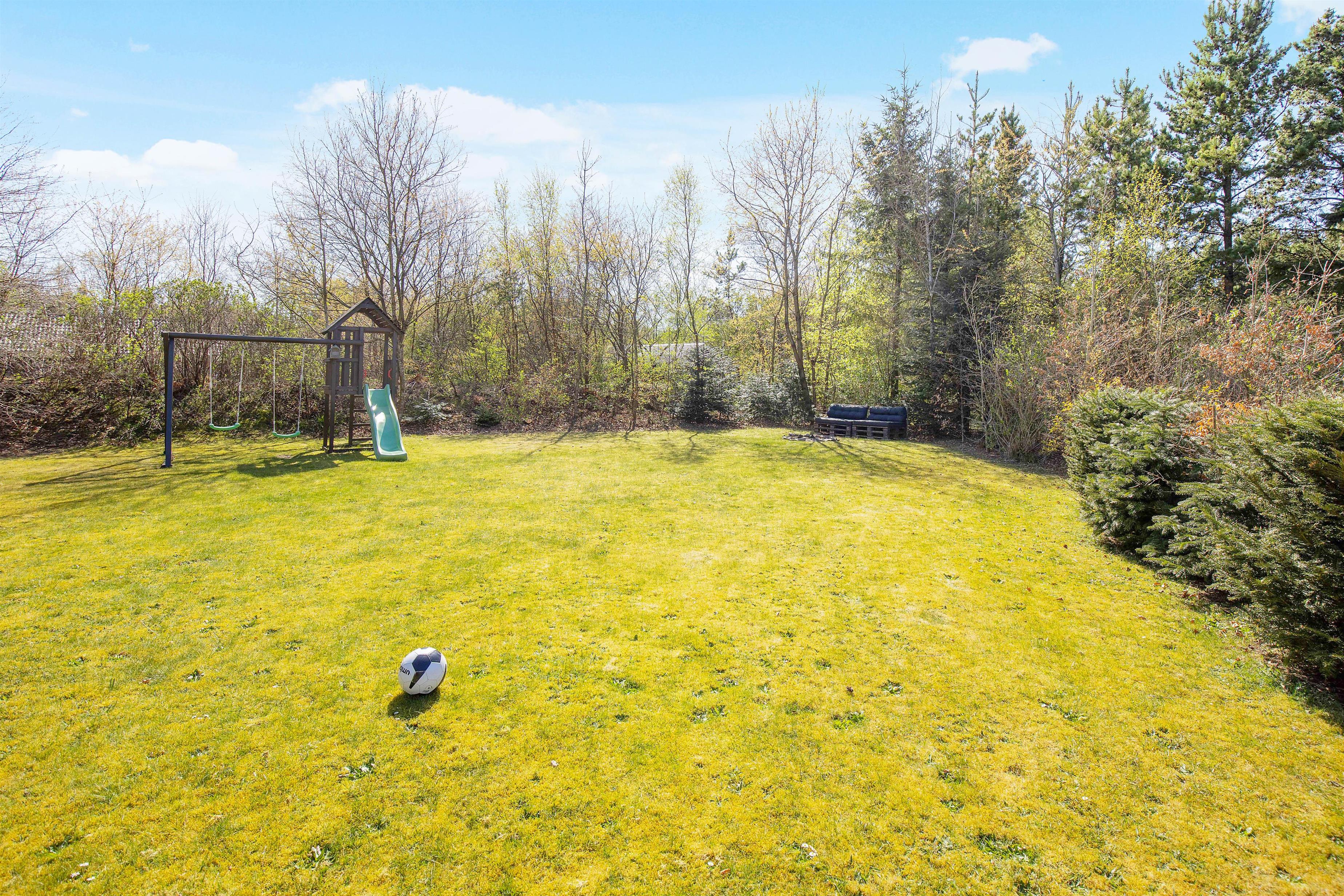Skønt, naturfyldt udeområde med terrasse, sandkasse og gynge