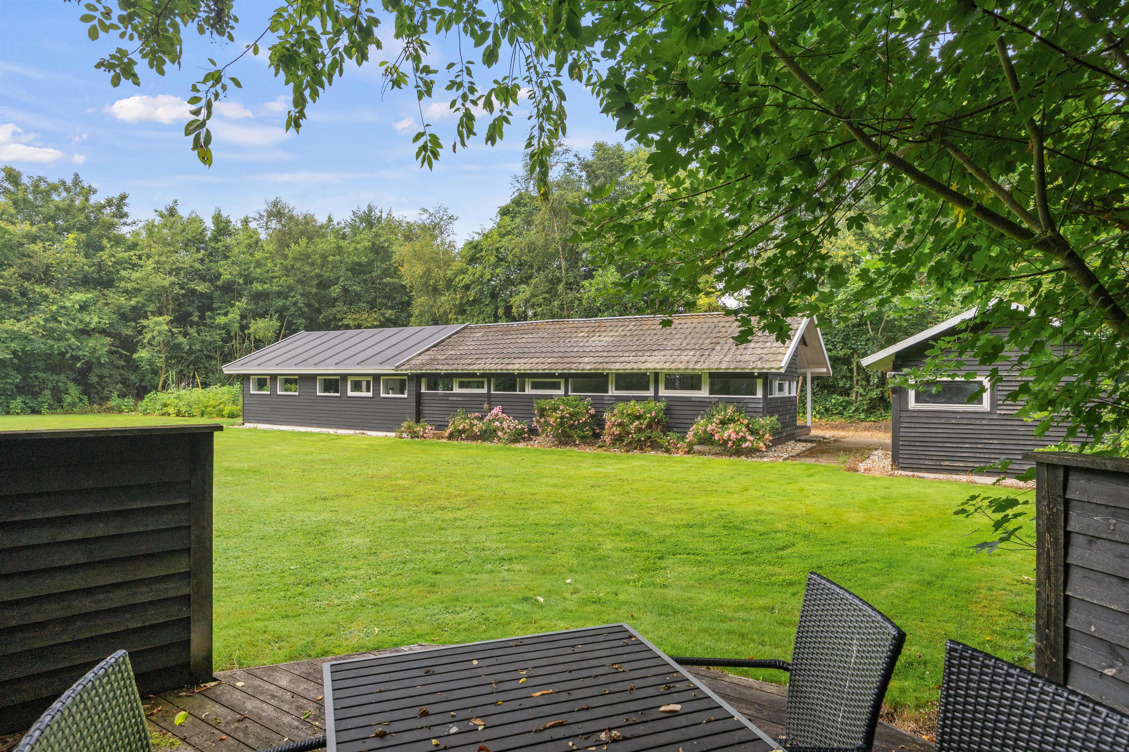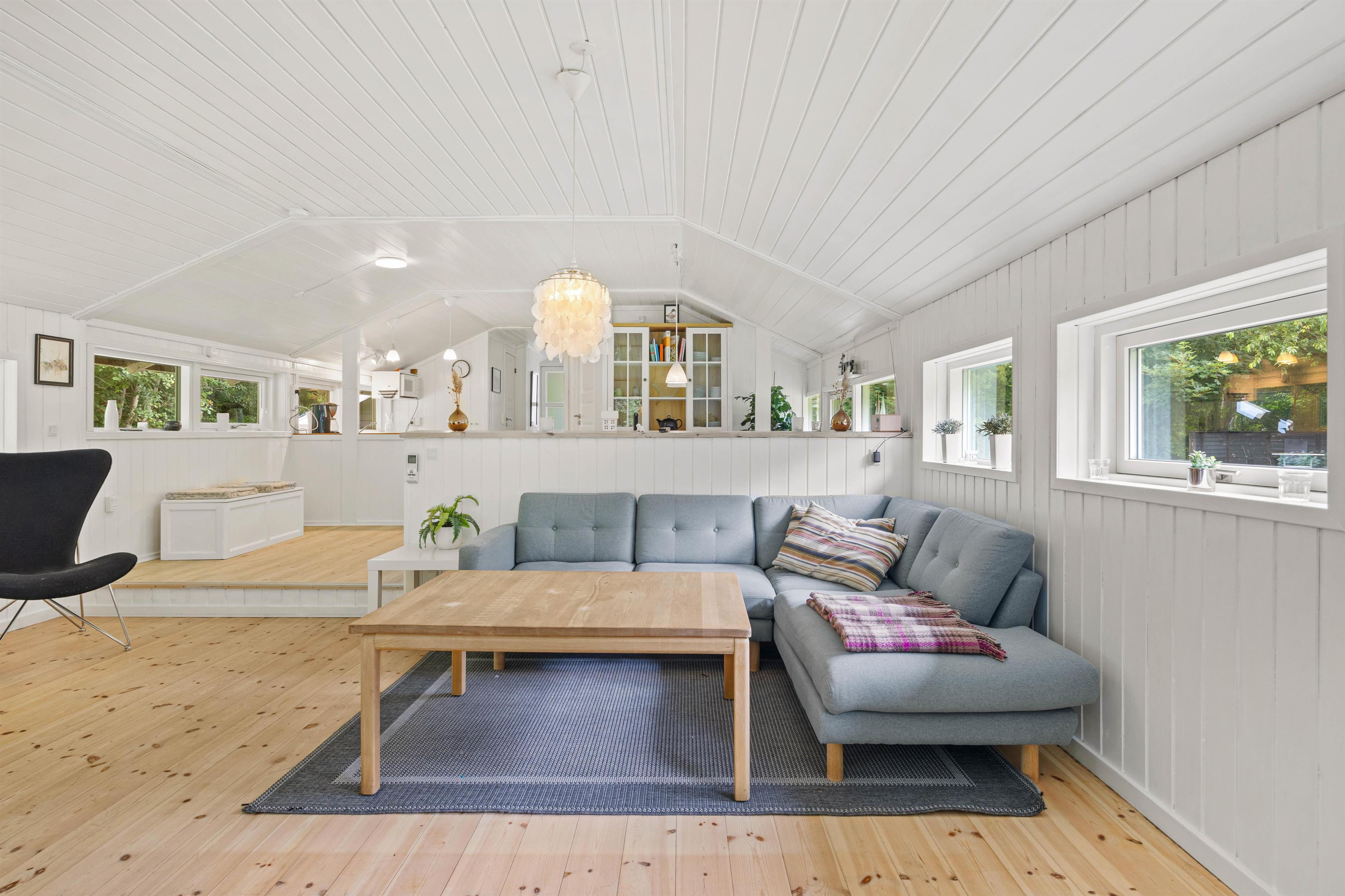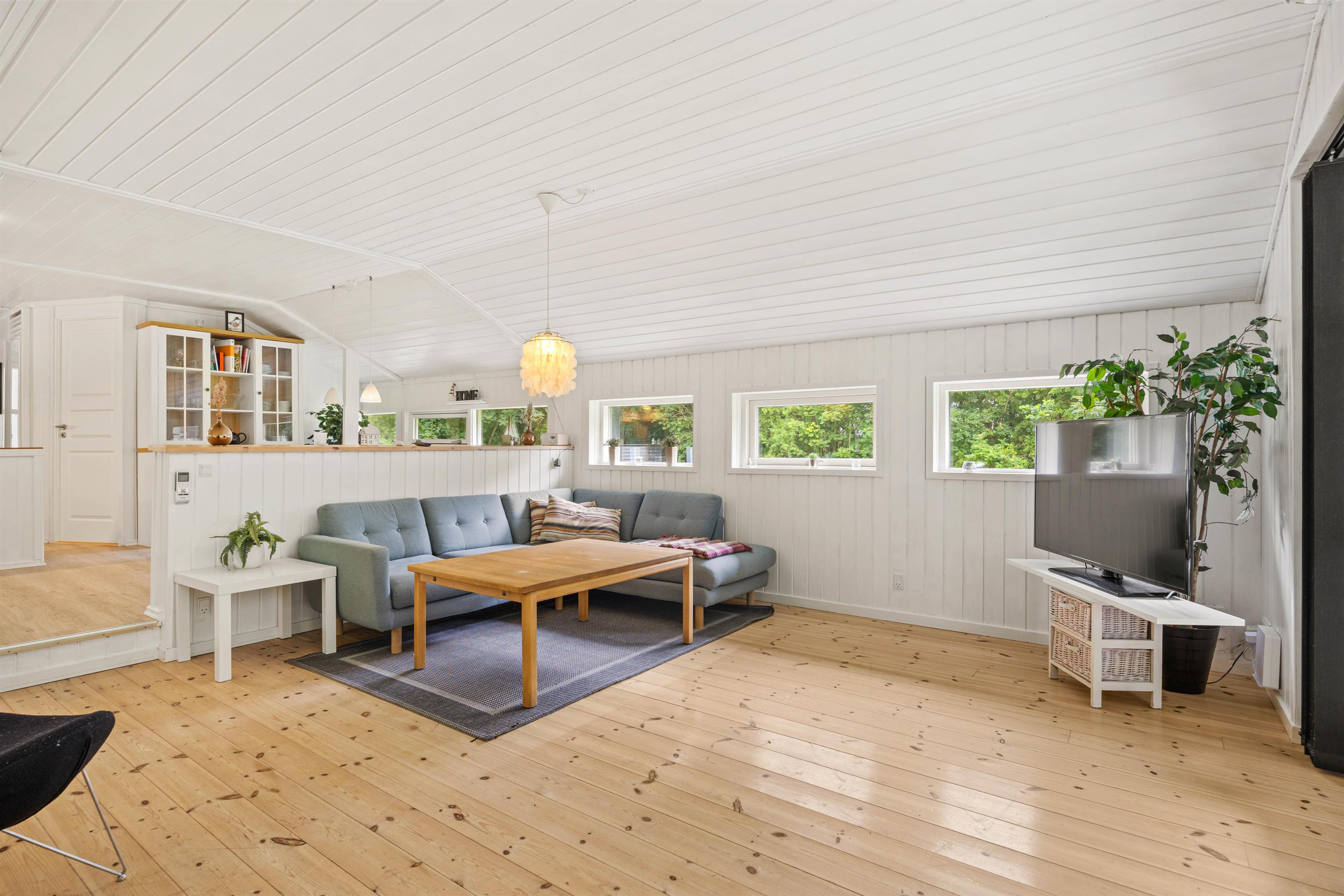 Udenfor er der god plads til leg for børnene på den grønne plæne og mulighed for skønne grillaftener under den delvist overdækkede terrasse, der tillader udeliv året rundt. Store vinduer sikrer masser af naturligt lys, mens den varme brændeovn skaber hyggelige omgivelser indendørs.