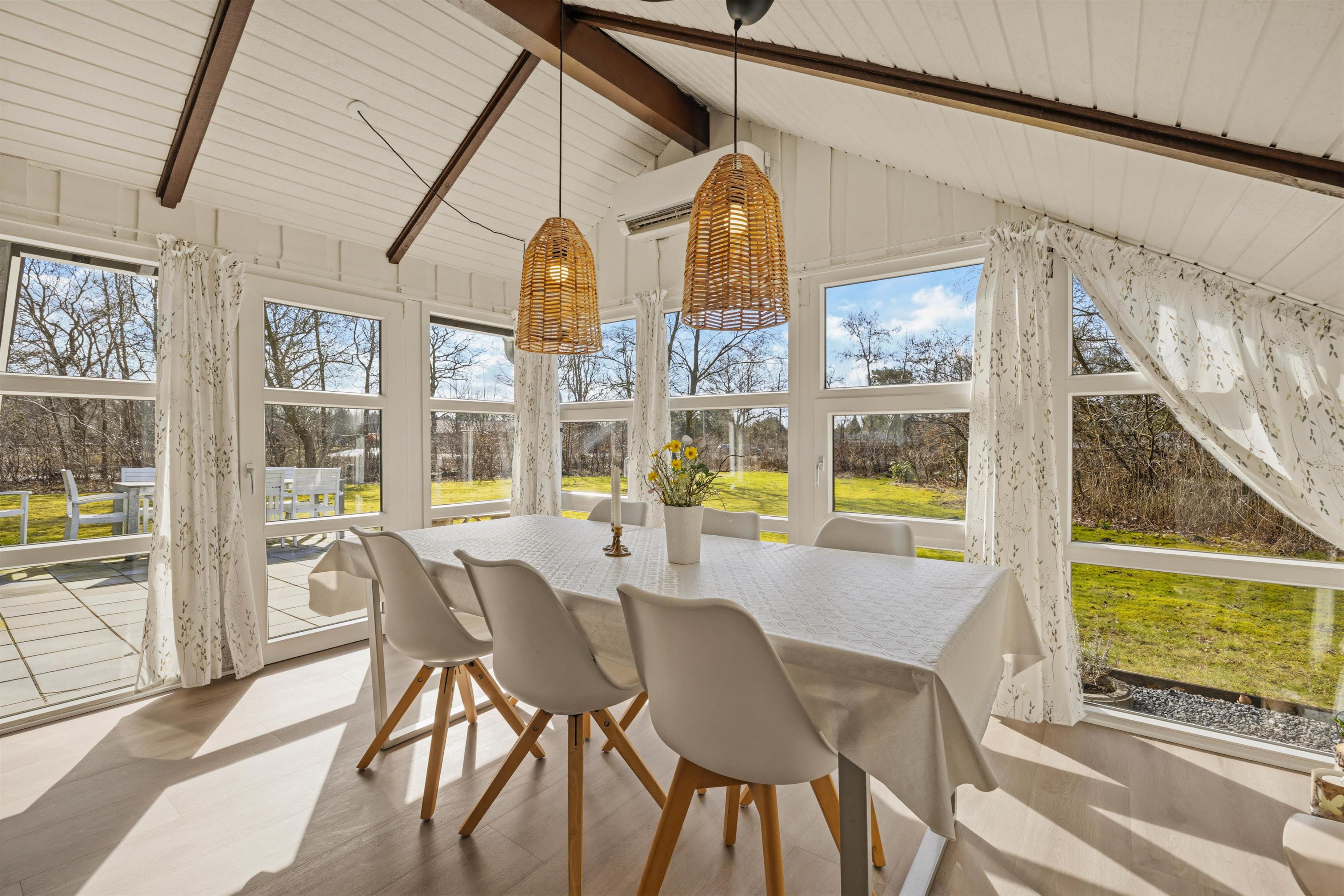 Fra stuen er der direkte adgang til en overdækket terrasse, som gør det nemt at bevæge sig mellem inde- og udeliv. Derudover findes en åben, delvist afskærmet terrasse, hvor du kan slappe af på solvogne eller nyde skyggen under parasollen.
