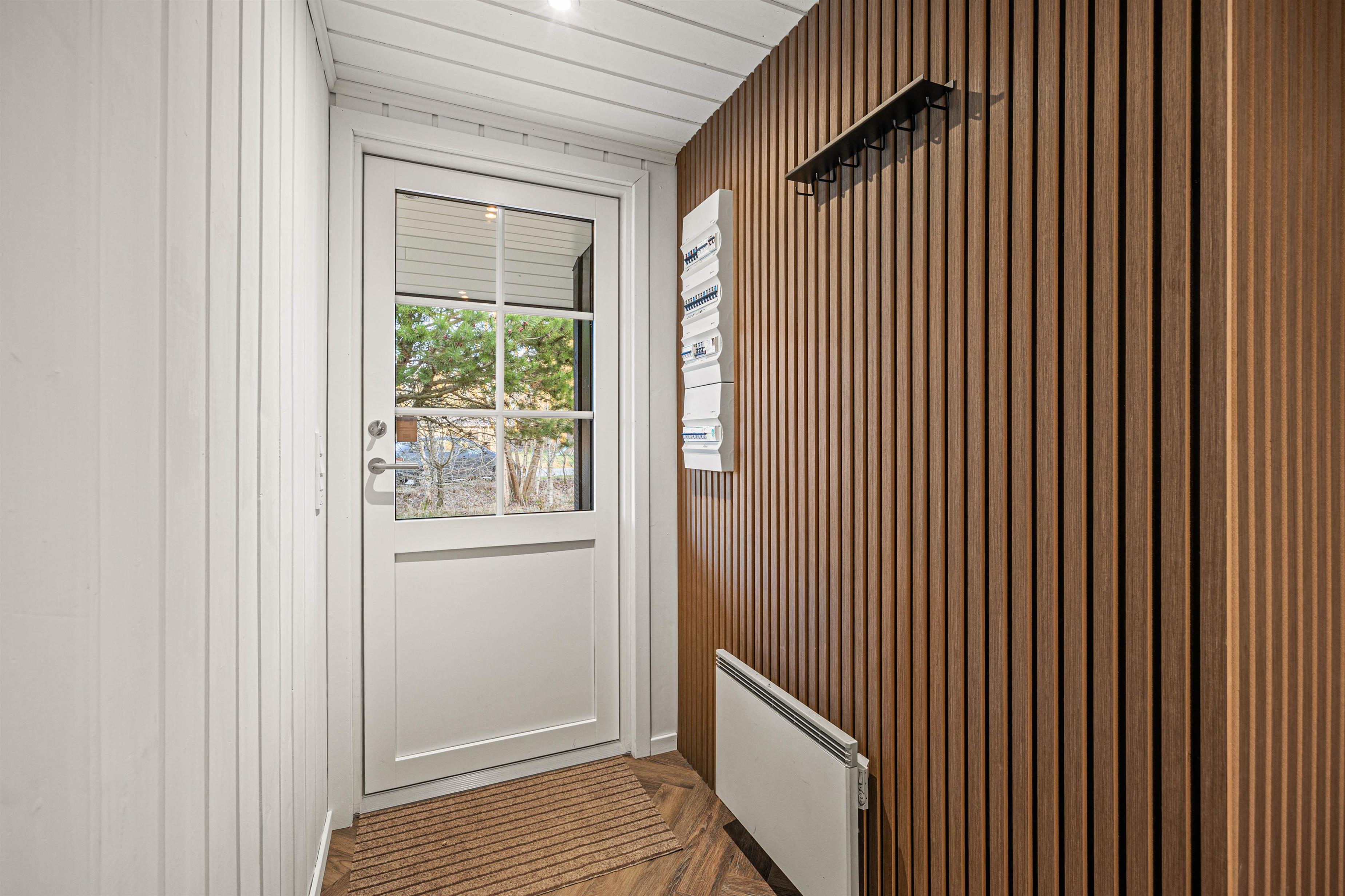 Indenfor byder huset på en stilfuld stue med komfortable møbler, TV og en varmende brændeovn, der skaber hyggelige stunder. Den energibesparende varmepumpe sikrer et behageligt indeklima året rundt. Slap af foran brændeovnen, se en film eller læs din yndlingsbog.
