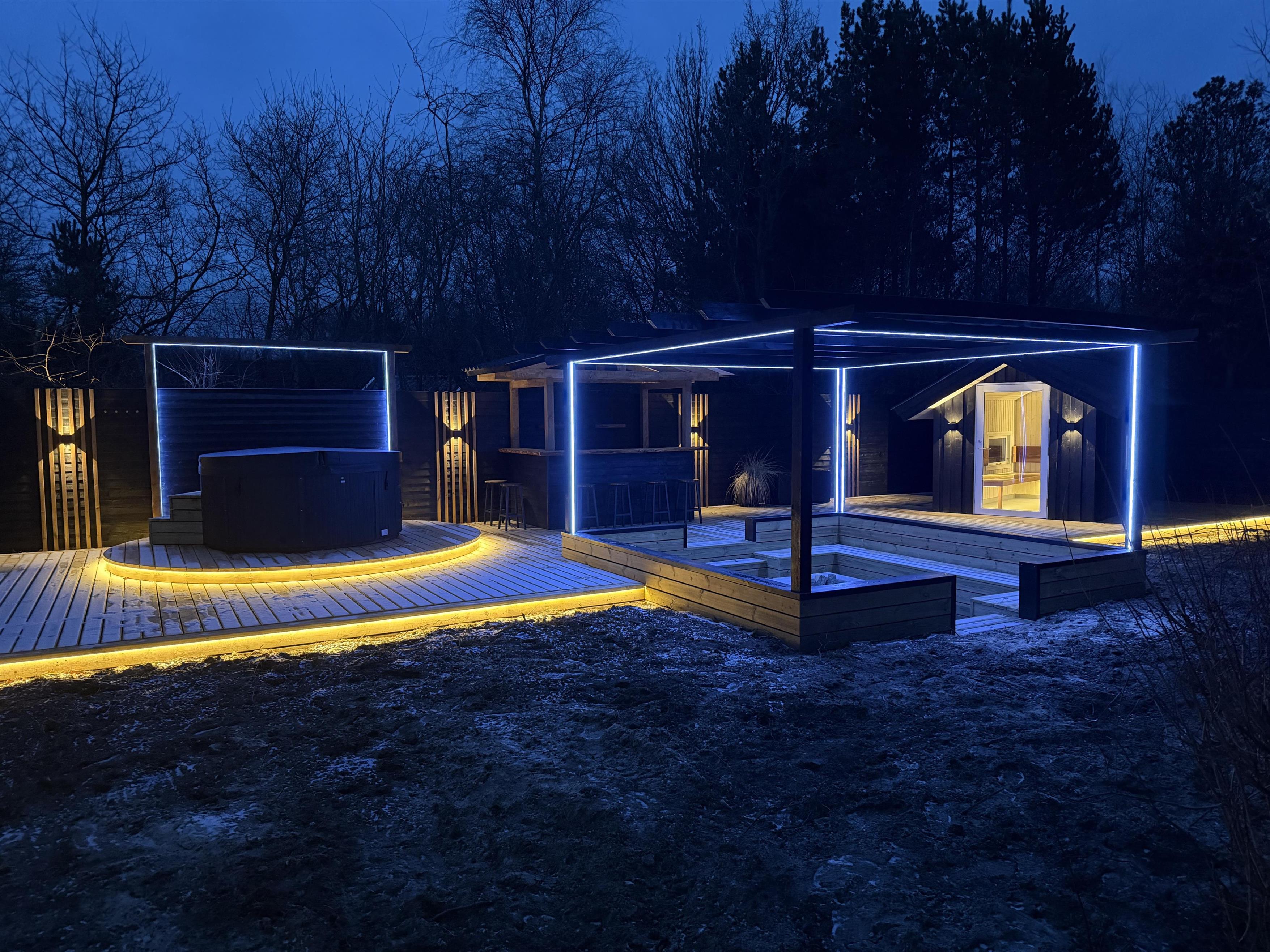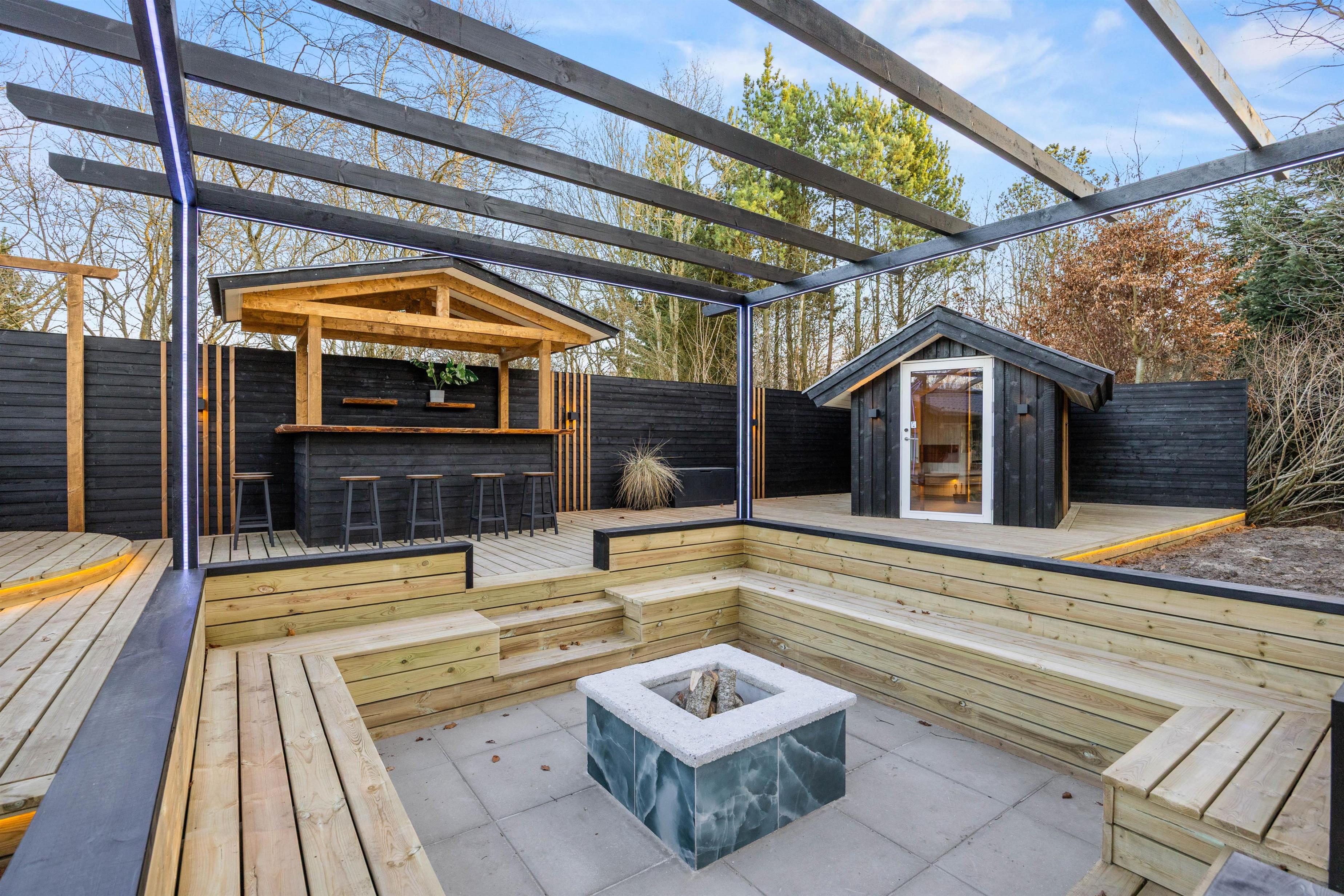 Idyllisk udendørsområde med sauna, udespa og lademuligheder