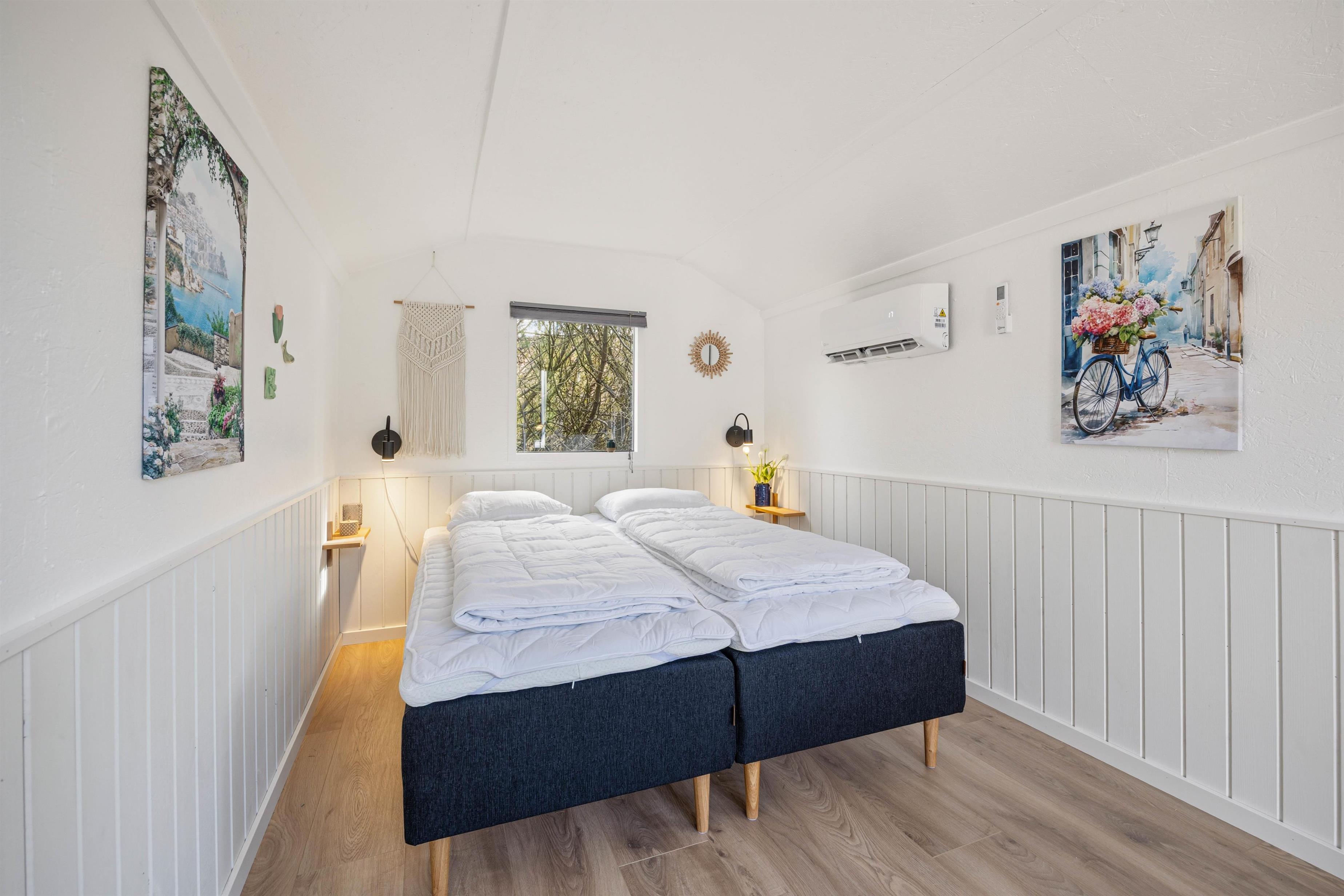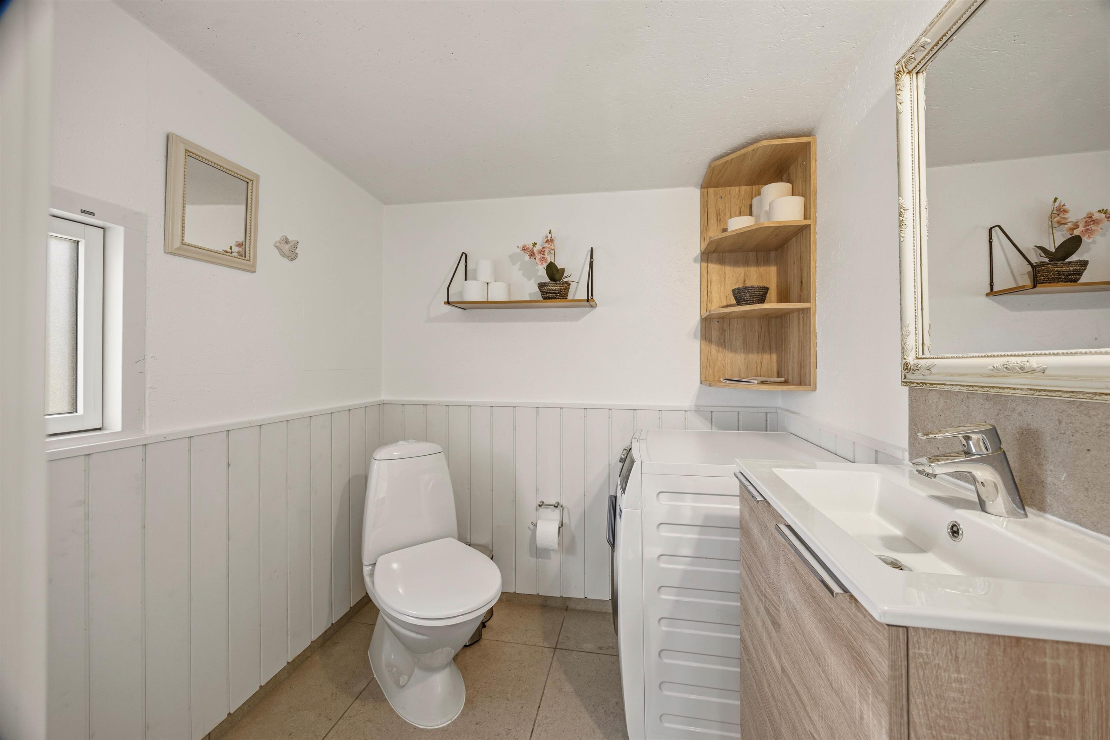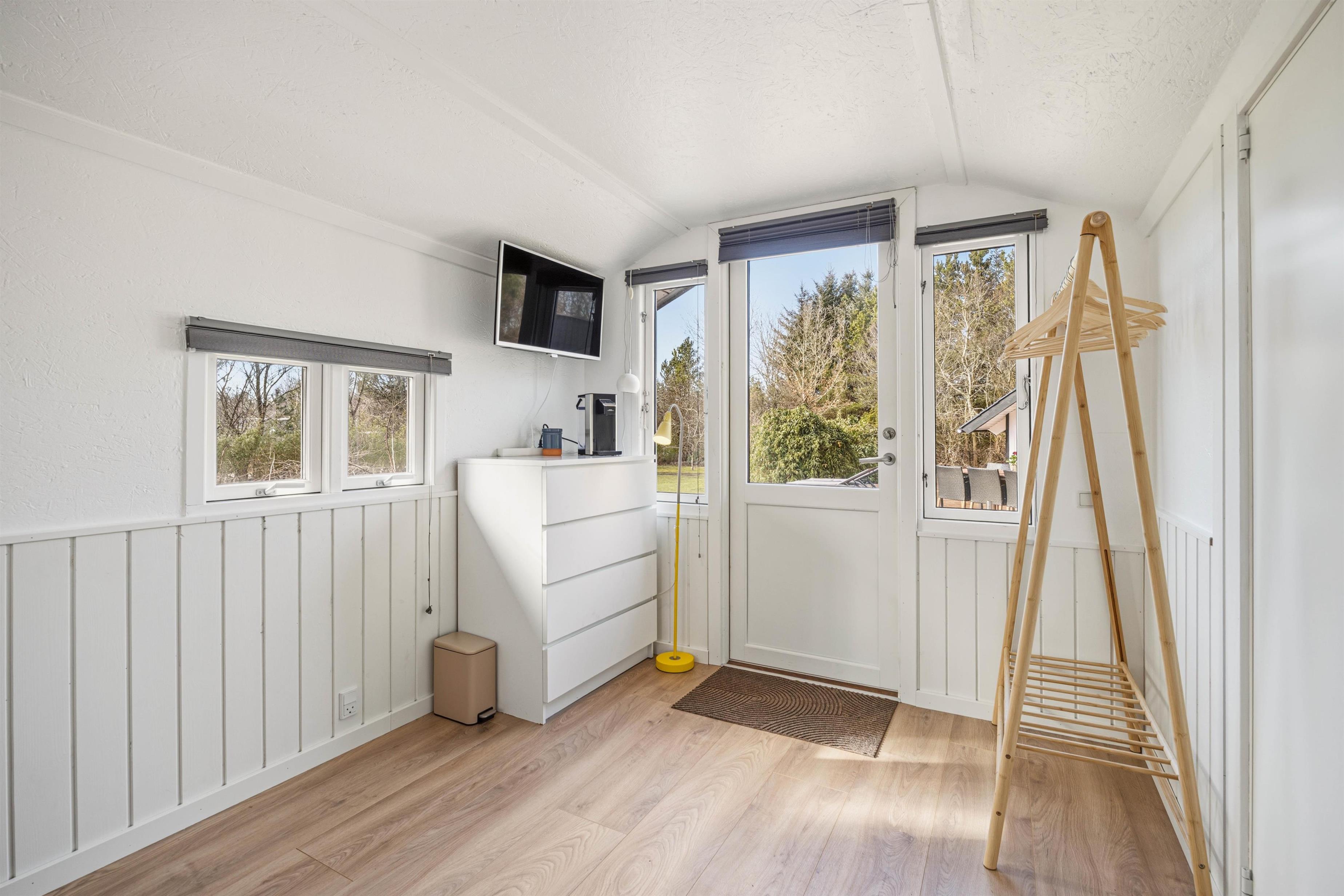 Derudover findes et gæstetoilet i den separate tilbygning, sammen med et af soveværelserne med dobbeltseng. På den måde kan I nemt fordele jer i huset. De 2 øvrige soveværelser med dobbeltsenge samt et værelse med køjeseng ligger i hovedhuset.