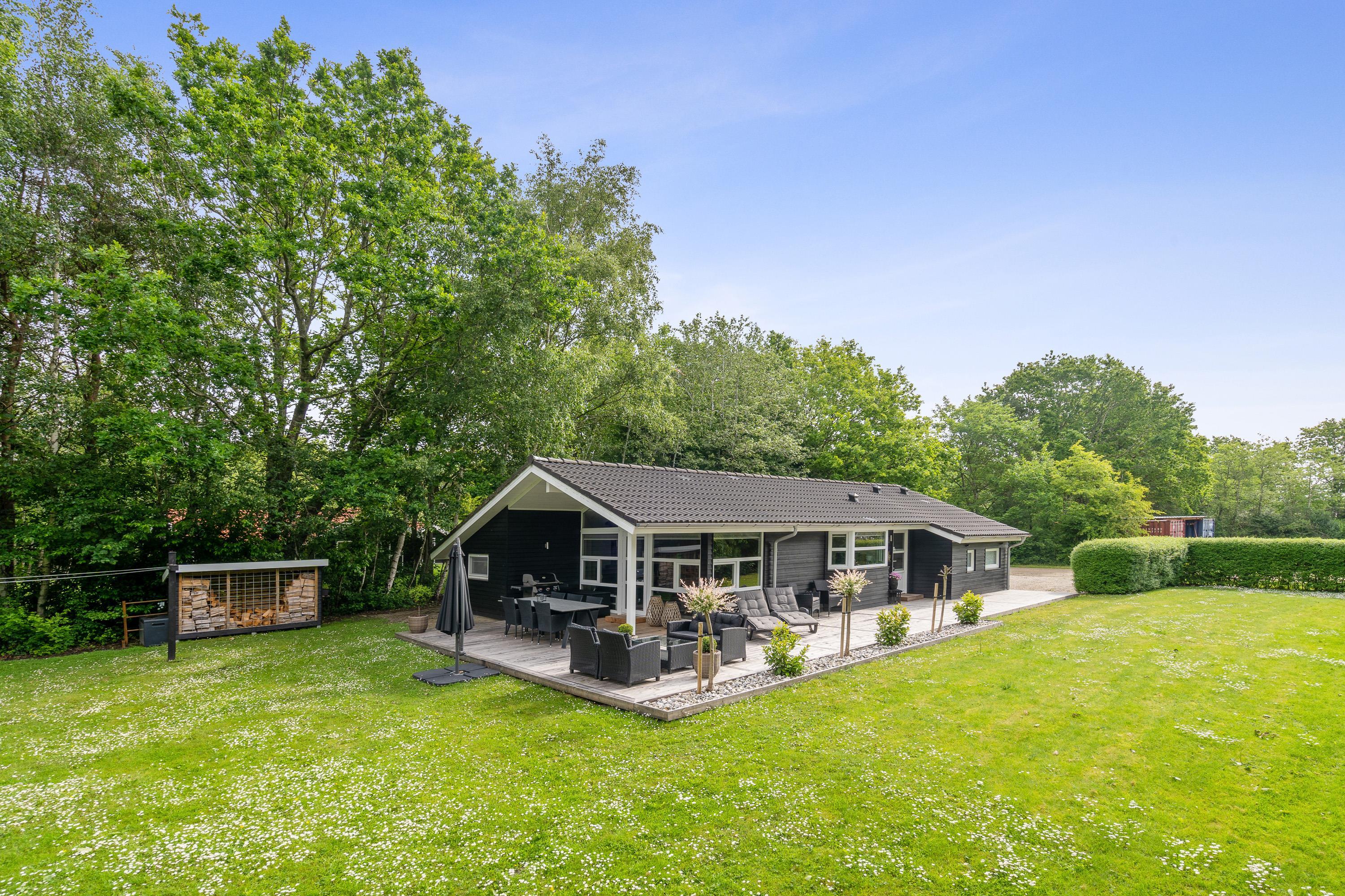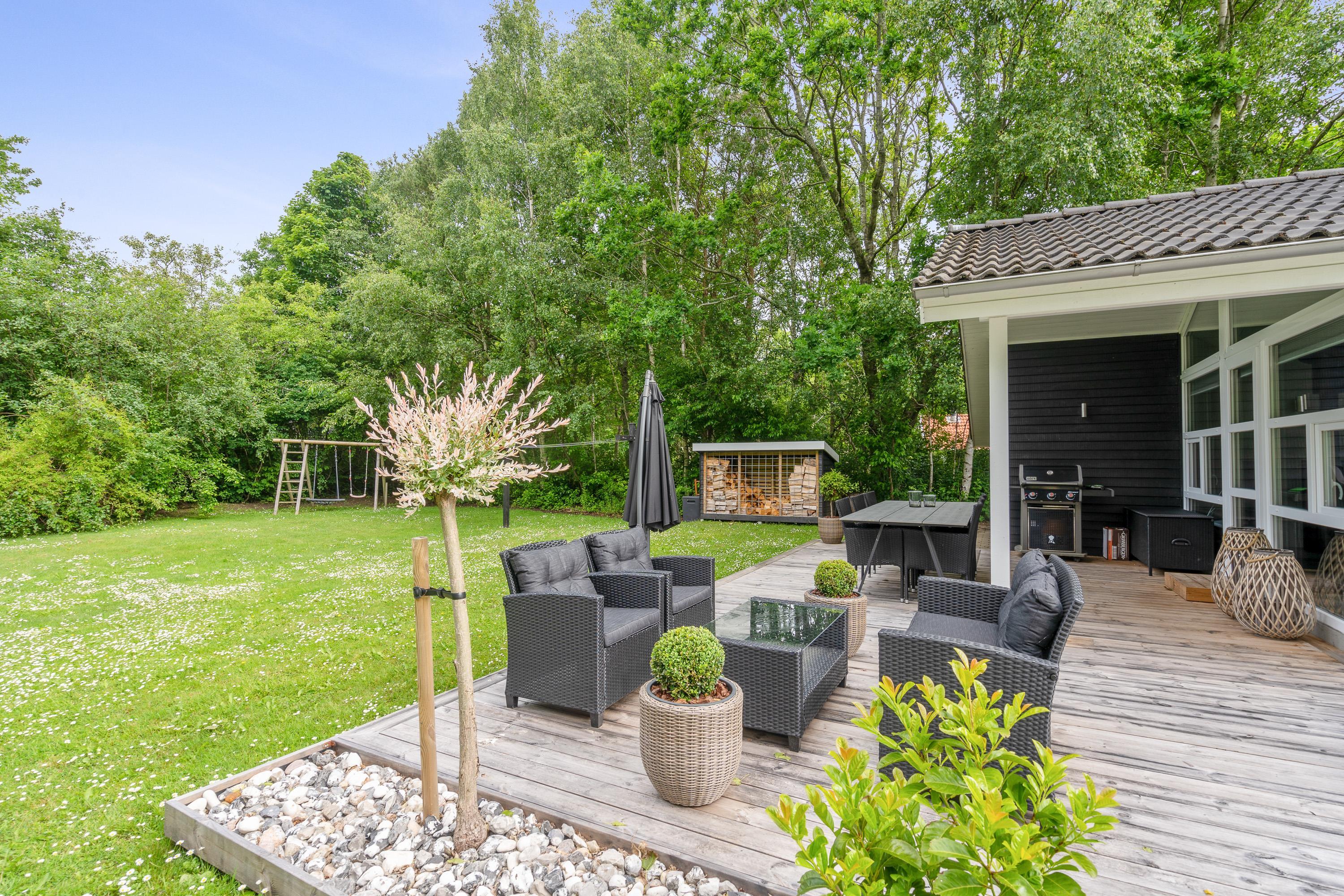 Hele udeområdet ved feriehuset fremstår yderst velplejet, og også her fornemmer I, at der er blevet kræset for detaljerne. Der er masser af hyggekroge på terrassen, hvoraf en del af terrassen er overdækket, så I har mulighed for at gå i læ for solen, hvis det skulle være nødvendigt. Der er masser af lækre havemøbler, I kan slynge jer i, og I har et godt overblik over haven, så I nemt kan holde øje med børnene, som kan slå sig løs på gyngen eller en gang boldspil, som den store plænegrund lægger op til.